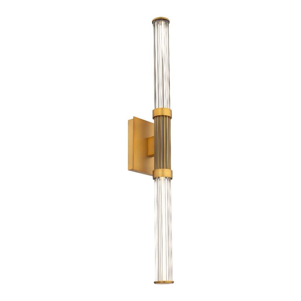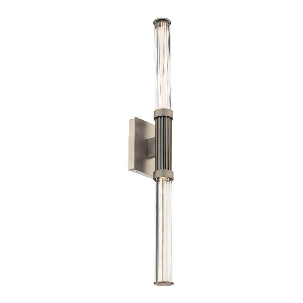 A ribbed glass tube intersected by a grooved column creates the elegant Ribeye double wall sconce. Textured, 3000K illumination from an integrated LED filament enhances the space. Offered in both 19 and 28-inch sizes, Ribeye is available in aged brass or brushed nickel finishes. Mount the light horizontally or vertically as desired.