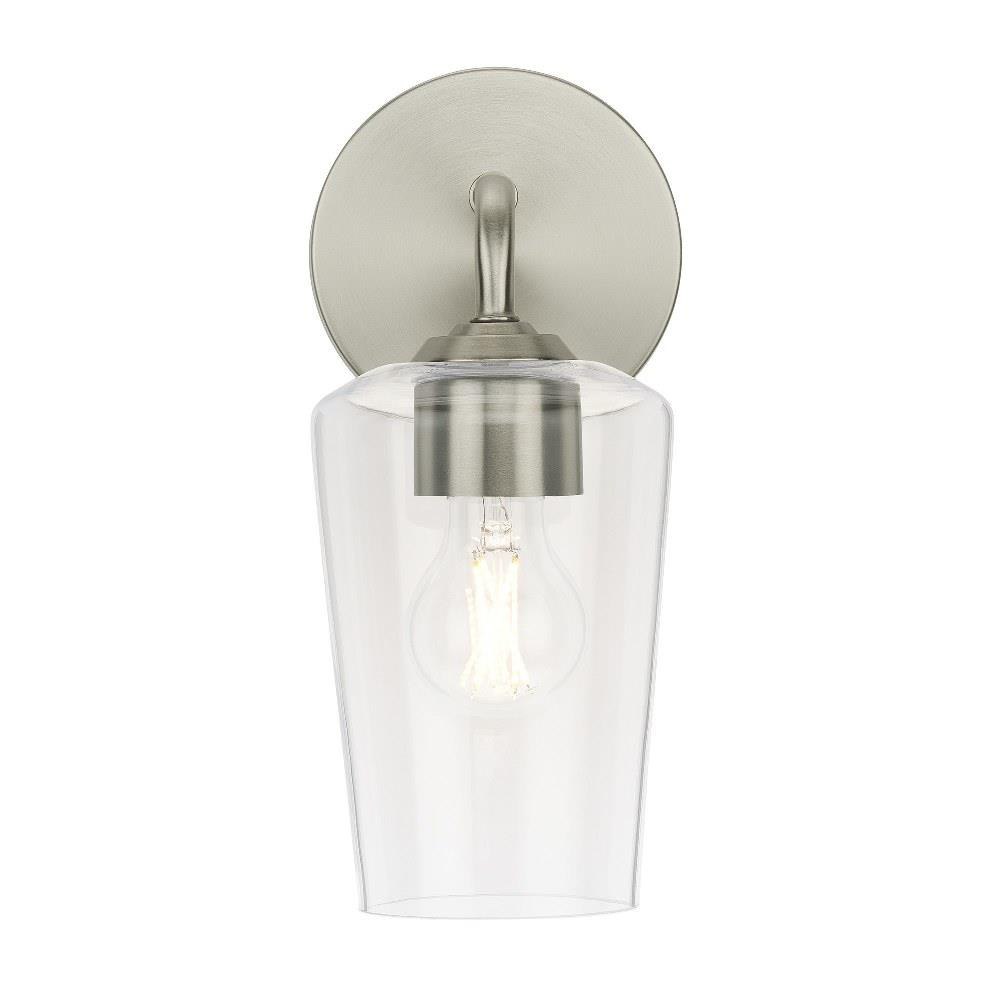 Illuminate your space with the refined elegance of the Celino 1-Light Wall Sconce. With shades inspired by the graceful silhouette of hand-crafted crystal wine glasses, each light fixture is a testament to meticulous artistry and timeless design. A perfectly proportioned clear glass shade offers a seamless and visually stunning form that delivers bright light to the surrounding space. A softly curved, polished metal arm and circular backplate finished in subtle Brushed Nickel, embodying contemporary design trends, cradle the glass shades with a gentle embrace. Versatility is key; install the Celino Wall Sconce facing up for an ambient glow, or down for a more focused illumination. Whichever direction you choose, the Celino will infuse your home with a sophisticated and inviting ambiance.