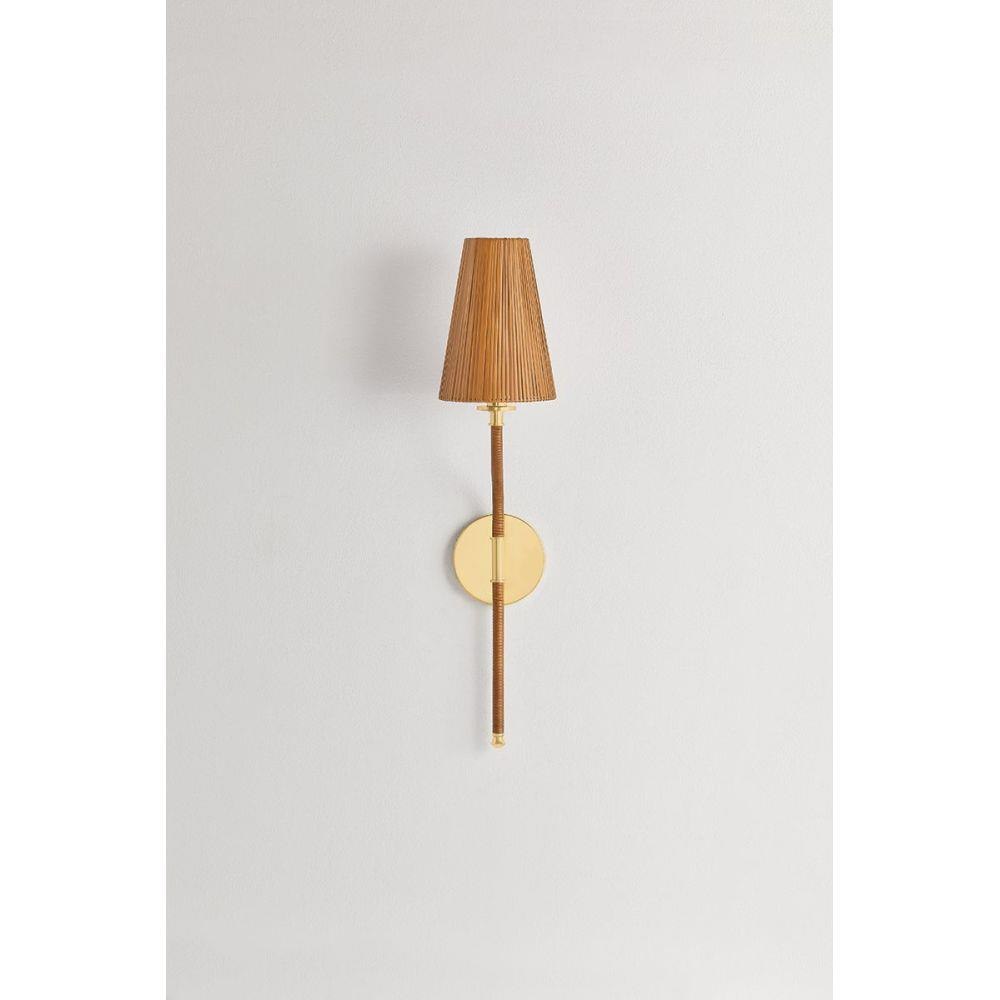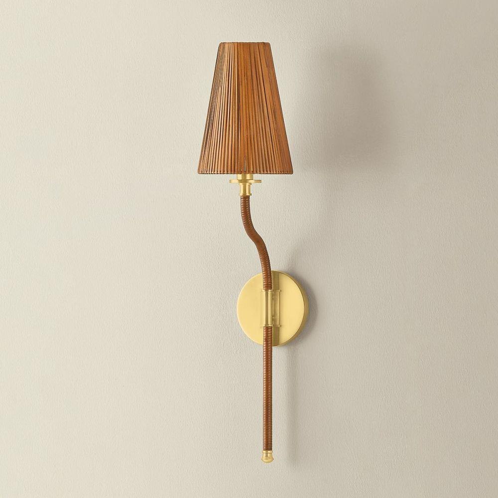 Paying homage to the sinuous creations of Finnish designer Paavo Tynell, the Atwood family uses natural materials to form striking branch-like silhouettes. Elongated arms and tapered shades are wrapped in rattan skin, creating an earthy, global statement. The metal rod, bobèches, and cuffs are finished in Aged Brass, lending a luxurious feel. Available as a 1-light sconce, 6-light chandelier, and 10-light chandelier, these pieces are designed to be layered throughout the home. *Due to the one-of-a-kind nature of the medium, exact colors and patterns may vary slightly from the image shown.