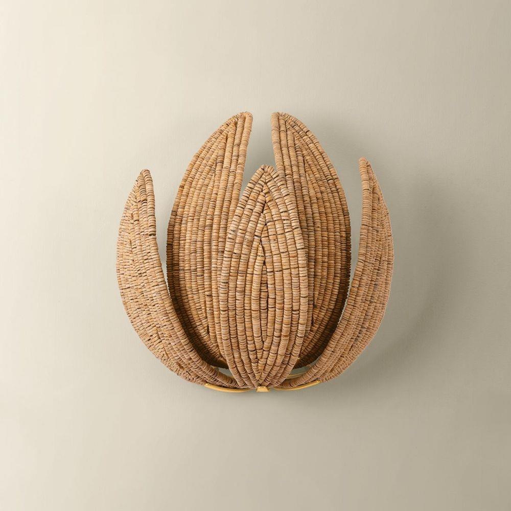 The Varanasi family takes the iconic artichoke light silhouette and remakes it with natural materials. Cascading tiers of ‘leaves’ curl inward, with each one made of hand-applied coco beads. A straight stem in Vintage Gold Leaf accompanies the neutral tones, while the beaded ceiling canopy creates a sense of cohesion. Available as a 1-light wall sconce or a chandelier with 14 or 28 lights. *Due to the one-of-a-kind nature of the medium, exact colors and patterns may vary slightly from the image shown.