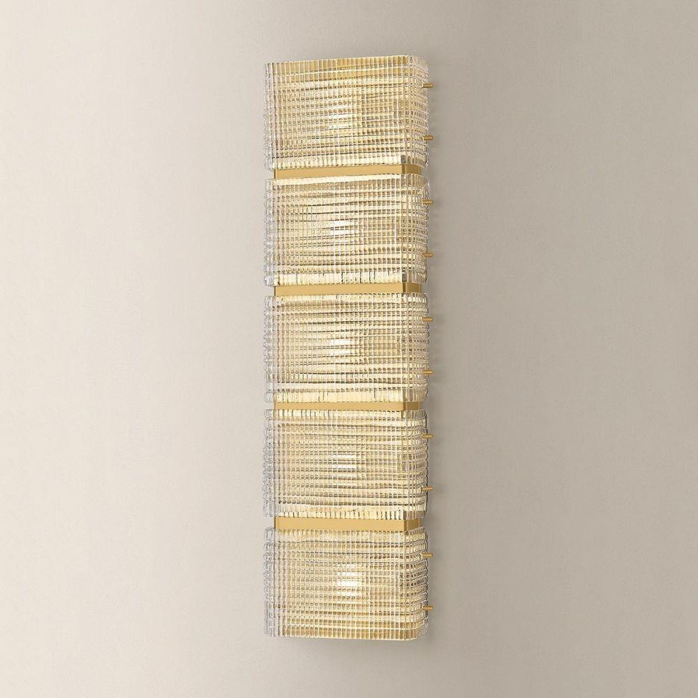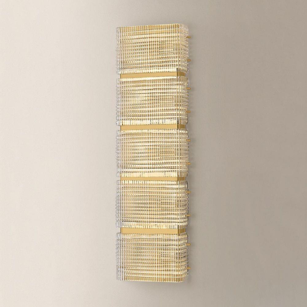 Taking inspiration from retro glass blocks, the Mav sconce puts a contemporary spin on a playful motif. With a shallow profile, the vertically stacked square design is marked by intricate cut crystal details. The highly textured clear piastre glass beautifully reflects and refracts light, creating a striking visual effect when lit. Mav is available with 3 or 5 lights to make a statement in modern interiors.