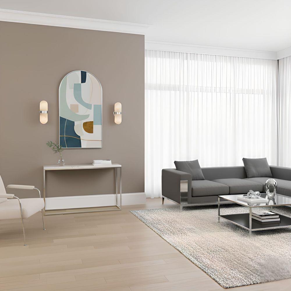 Sleek and sculptural, the Bree Wall Sconce captures the poetry of soft light and elegant form. Its smooth, pill-shaped silhouette features a glowing alabaster resin shade that radiates a warm, diffused glow—like candlelight behind clouded stone. Available in polished chrome, matte black, or brushed gold, Bree offers a versatile touch of romance, whether flanking a mirror, lining a hallway, or accenting a cozy reading nook. A gentle blend of modern minimalism and timeless beauty, Bree creates an atmosphere that feels both intimate and effortlessly sophisticated.