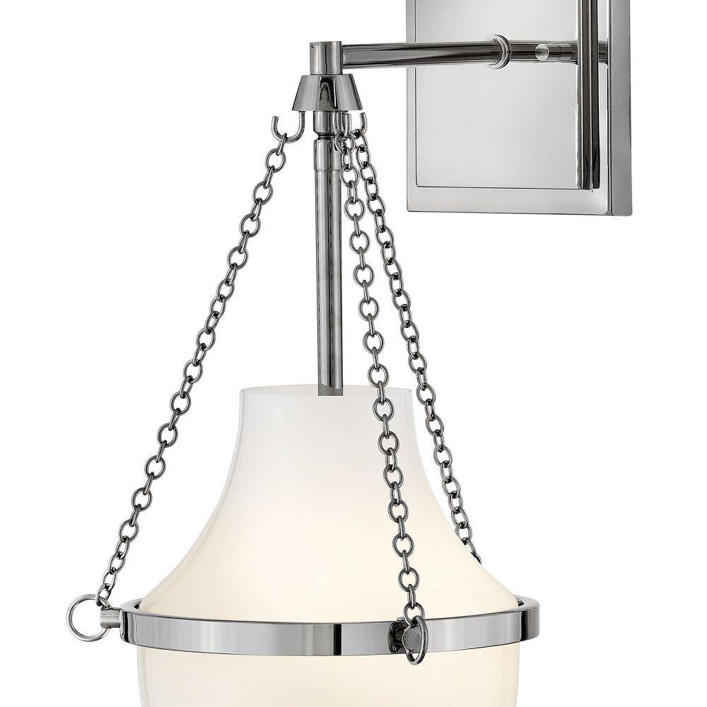 Fusing a sculpted, modern form with classically styled details, Collins features a transitional teardrop shade crafted from blown, Cased Opal glass. A central metal band and delicate chain uprights are available in Black Oxide, Heritage Brass, Heritage Bronze, or Polished Nickel finishes.