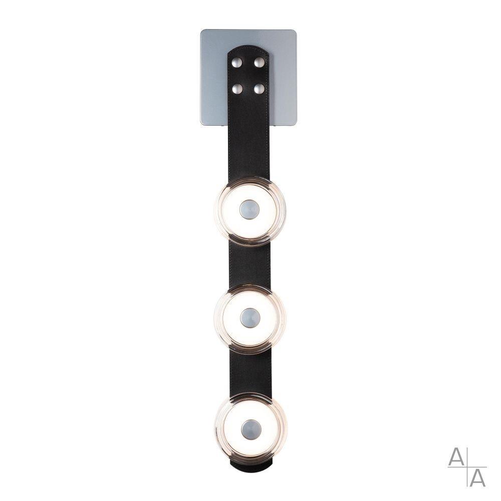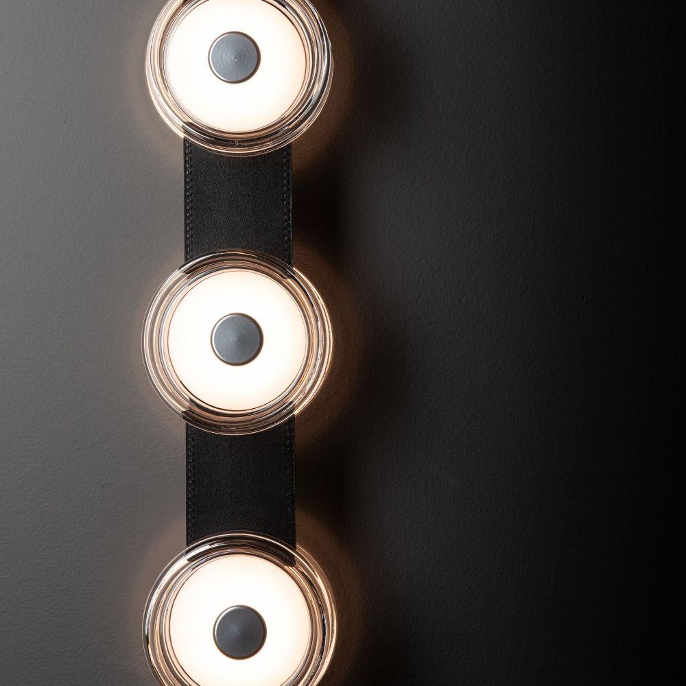 A brilliant trio! By popular demand, the three-light Snaps Sconce has arrived! Lots of functional, yet stylish light in a small, sleek form. A choice of three standard leathers (black, chestnut or white), or get creative and choose an option from our partner Spinneybeck's array of upholstery leathers (link provided). Each of the 3 LED discs is housed within a thick "puck" of clear glass or alabaster. Part of our patented SNAPS Collection.