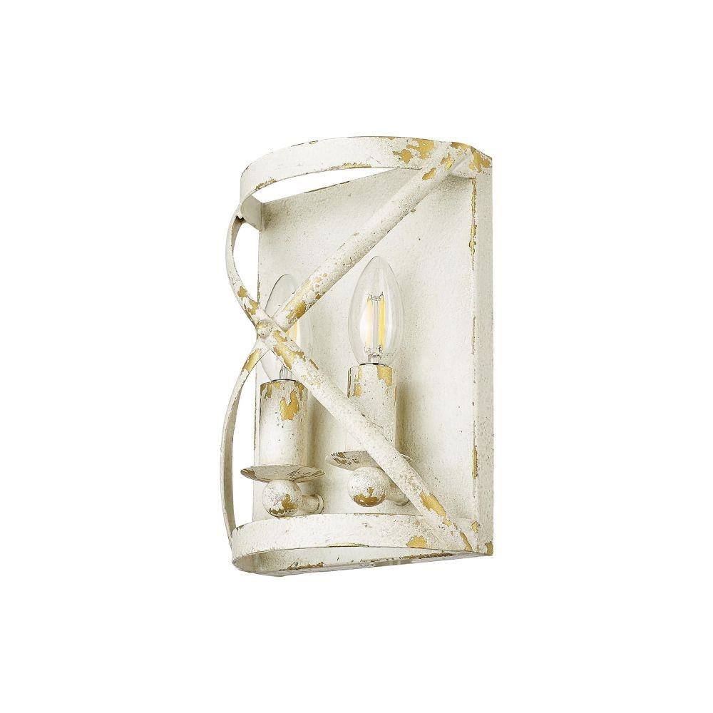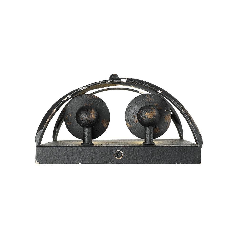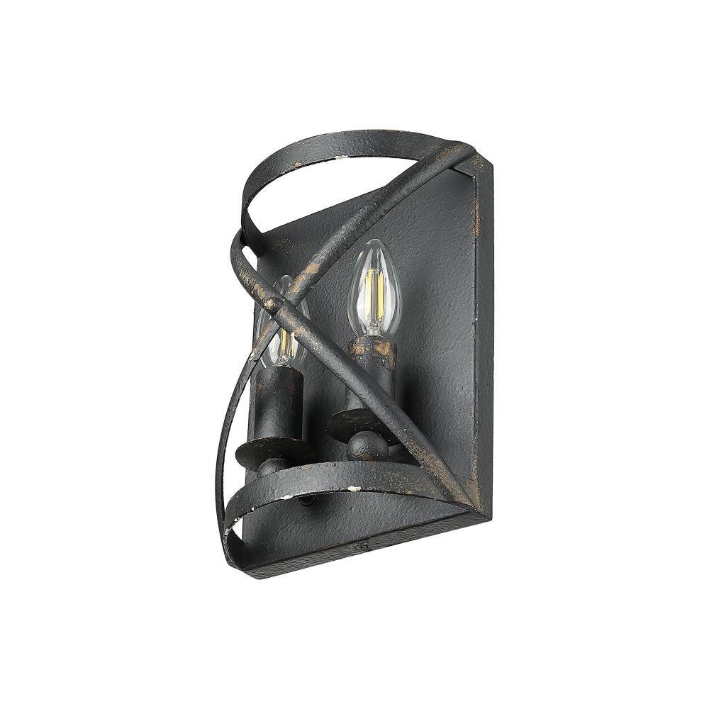 Bring rustic farmhouse elegance into your home with the Golden Lighting Alcott 2-light Wall Sconce. Featuring a rugged antique black iron frame, it creates a welcoming atmosphere.With its unique design, the sconce allows light to flow freely, adding to the cozy ambiance of your space. The Antique Black Iron finish captures the raw, authentic charm of a bygone era, showcasing a bold layer that is artfully weathered, revealing glimpses of a warm, antiqued gold base beneath.Versatile for various applications, this sconce enhances hallways, stairways, and bathrooms—perfect for creating inviting atmospheres in bedrooms, dining rooms, and entry points. It is damp location rated, suitable for covered and semi-enclosed spaces with occasional moisture.Overall dimensions measure 7.13"W x 10"H x 4"D, requiring 2 E12 Candelabra base bulbs (not included) with a maximum wattage of 60 per bulb. Elevate your decor with the artisanal craftsmanship of the Golden Lighting Alcott sconce, a piece that resonates with rustic heritage and cozy authenticity.