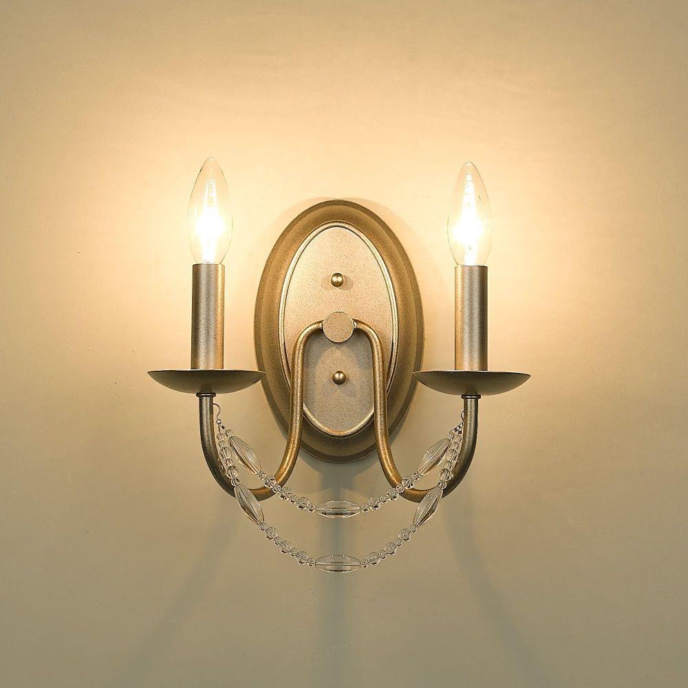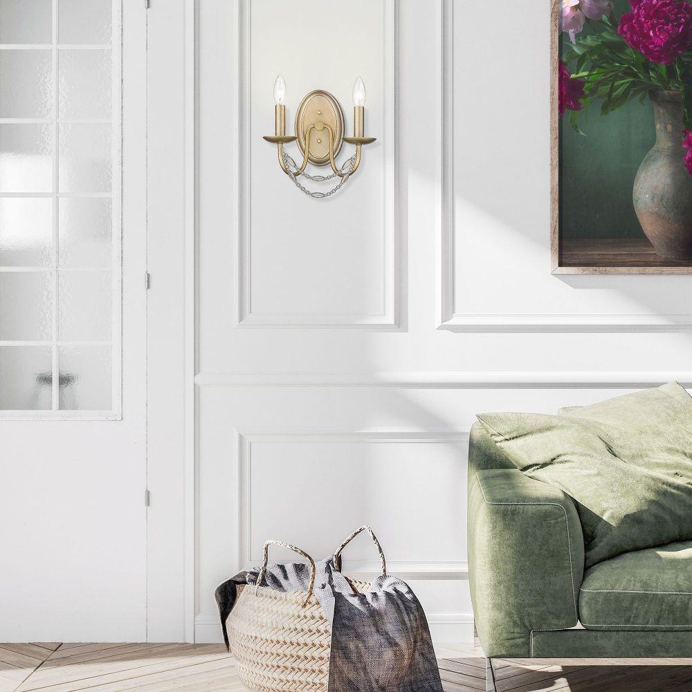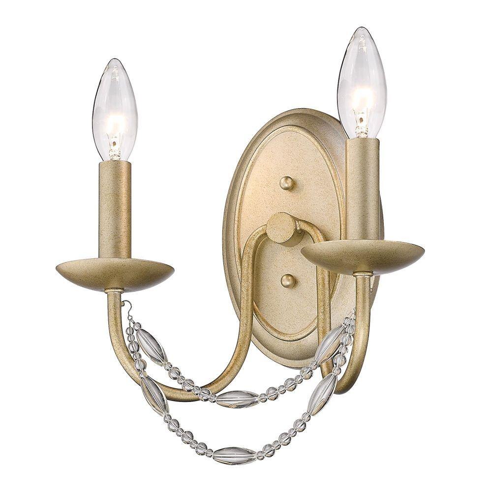 Bring traditional elegance into your home with the Golden Lighting Mirabella 2-light Wall Sconce in Golden Aura. Featuring no shade and a beautiful golden aura frame, it enhances the ambiance of your space. The sconce showcases draped swags of beaded glass that provide a dazzling sparkle, embodying the Glam style. Its unique finish offers a soft, matte patina suitable for both vintage and modern decor. With a damp location rating, it can be used in bathrooms or areas with occasional moisture. This fixture requires 2 E12 candelabra base bulbs (not included) with a maximum wattage of 60 per bulb. Overall dimensions are 10.25"W x 10.5"H x 6.38"D. Experience timeless charm and quality in your lighting.