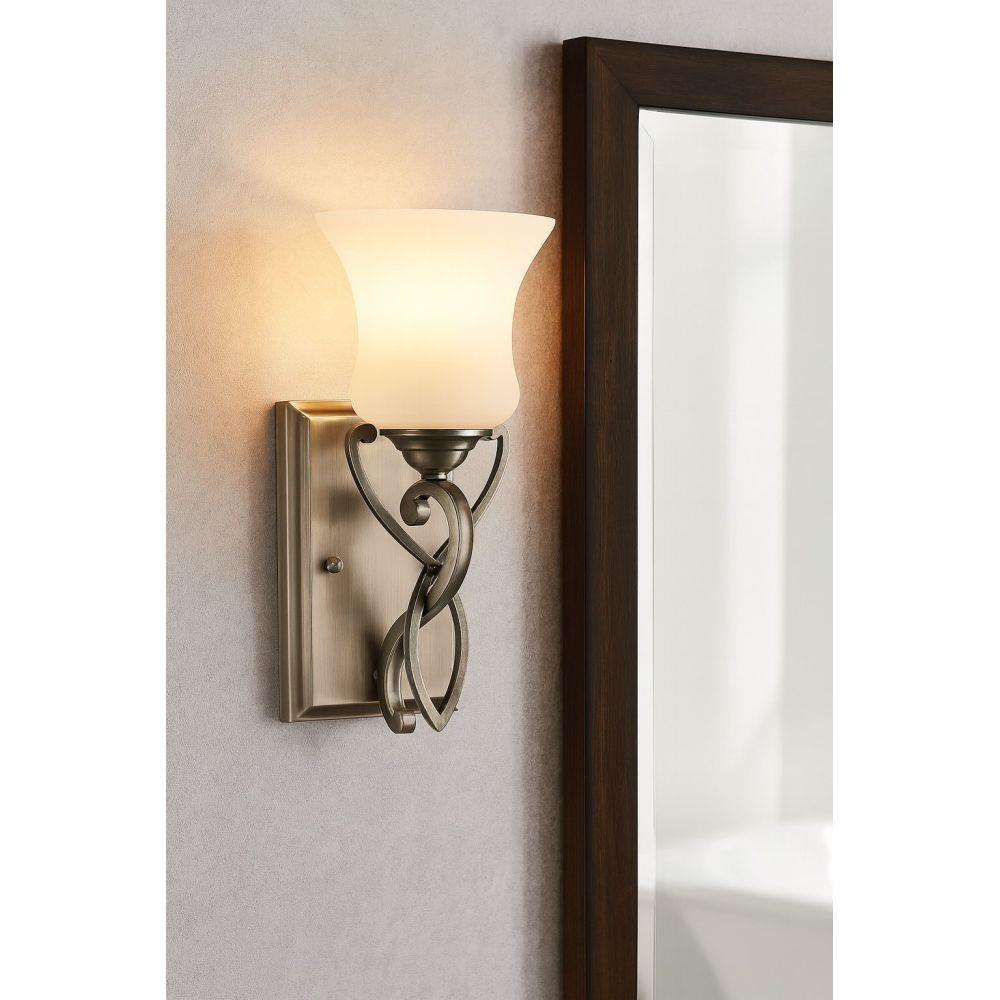 Brooke’s updated traditional look features a minimalist forged scroll design in Antique Nickel and Olde Bronze that elegantly complements its etched opal glass.