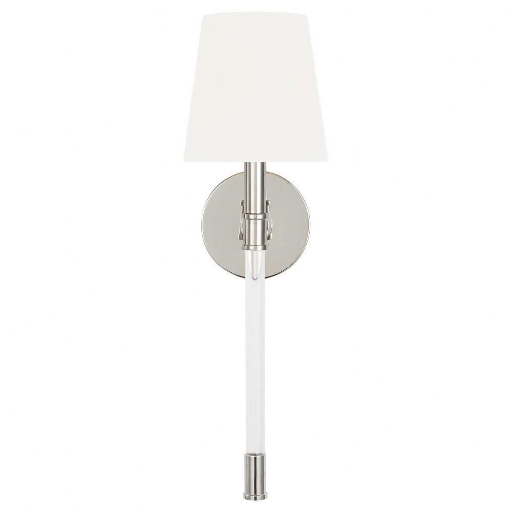 In the Hanover one light wall sconce, a lucite arm forms an elegant, dynamic silhouette that stems from a hub of either Burnished Brass and Polished Nickel finish and extends to matching color candle tubes, topped with exposed candelabra bulbs. Round backplate.Product Features and Benefits