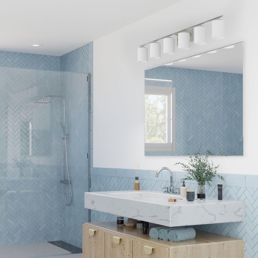 Incorporate a clean, contemporary design with the Merry Collection 4-Light Etched Glass Brushed Nickel Transitional Bath Vanity Light. Light sources glow from within crisp etched glass shades for a generous elegant glow sure to transform any bath into a modern retreat. The rectangular backplate, curved arms, and round light bases are coated in a beautiful brushed nickel finish that perfectly blends transitional and modern character.