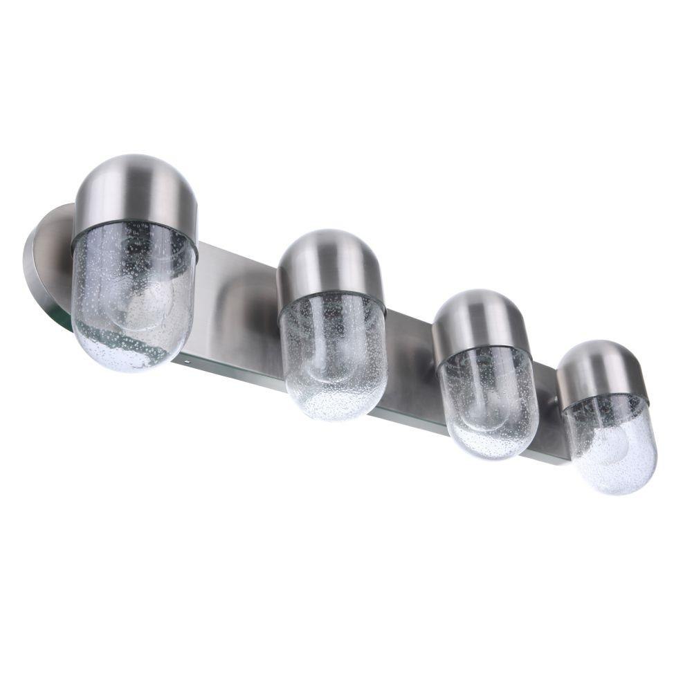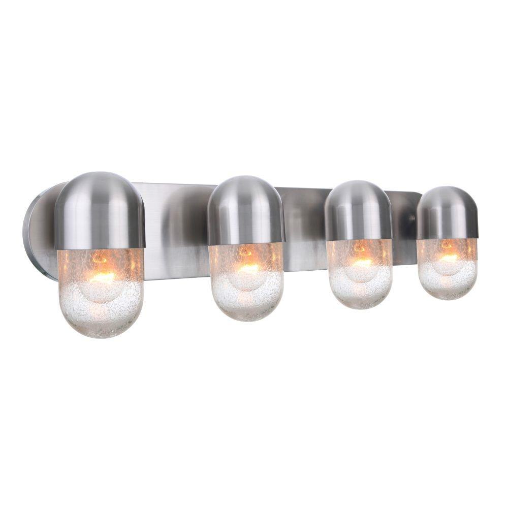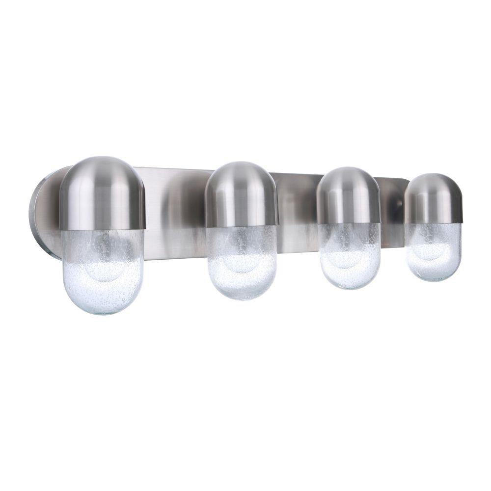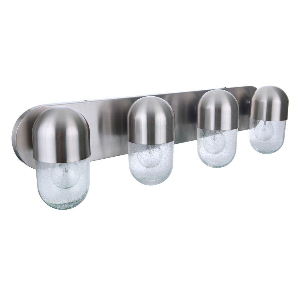 The perfect prescription for finishing your space with style. The Pill collection vanities and mini pendant feature clear seeded glass that accents the easily recognizable iconic shape.Clear seeded glassRequires 4 medium base, 60 watt bulbs (not included)Backplate is 30 inch wide x 5.2 inch highFixture extends 5.75 inch from wall.