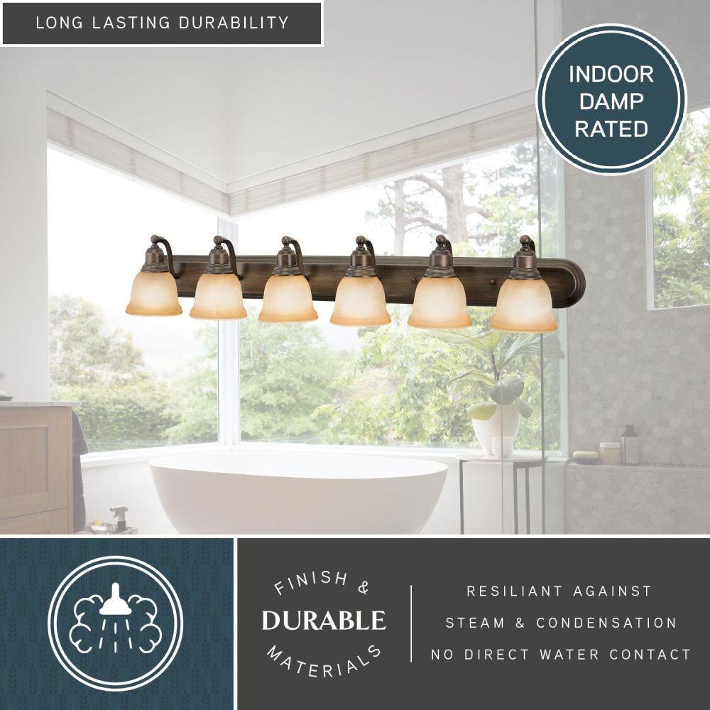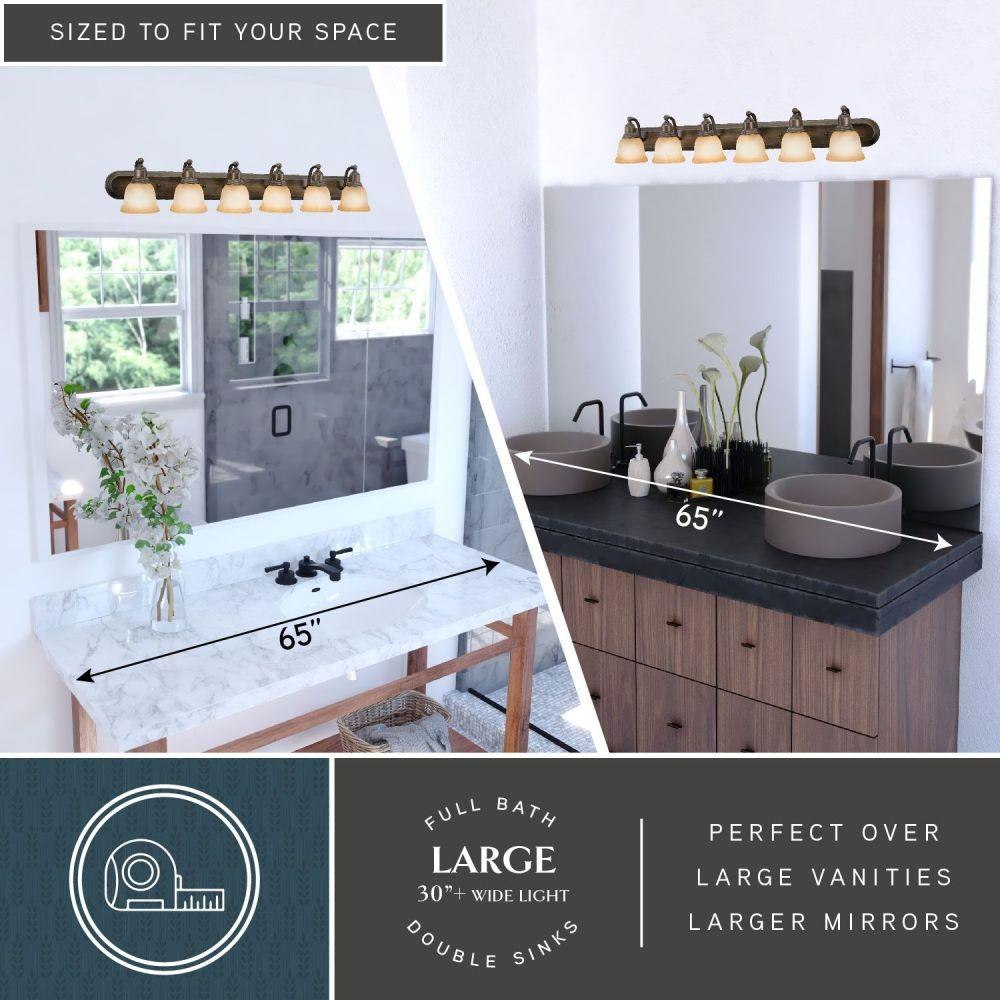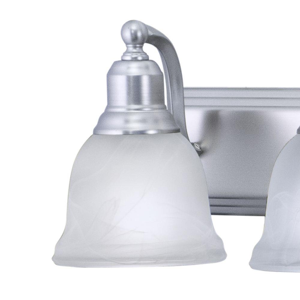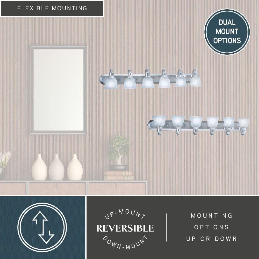 The transitional design of the Lasalle bathroom vanity light fixture blends well with most decors. It features a brushed nickel finish with white alabaster glass shades. The full back plate makes off center electrical boxes a non-issue. Versatile reversible mounting option lets you install this fixture up or down. This bathroom fixture is perfect over large vanities or double vanities where there is only one outlet box.
