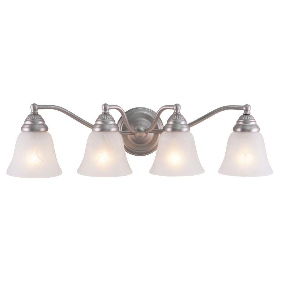 A simple yet sophisticated design is fitting in the traditionally styled Standford collection. It features a brushed nickel finish with white alabaster glass shades. Create a distinguished yet classic look by combining pieces from this extensive series of fixtures. Versatile reversible mounting option lets you install this fixture up or down. This bathroom light is perfect over large vanities or double vanities where there is only one outlet box.
