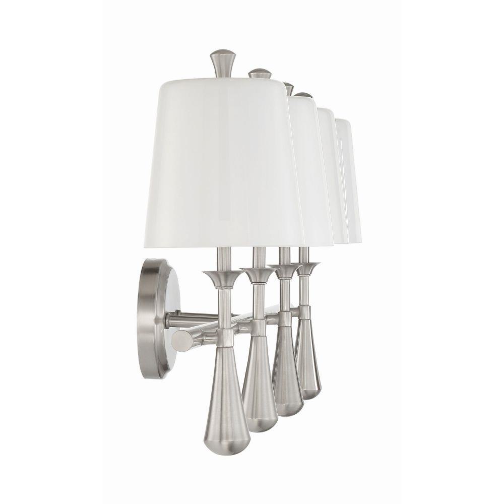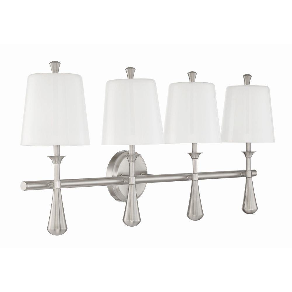 The timeless style embraced by our Palmer collection by Craftmade features brushed polished nickel frames with crisp frosted opal white glass shades. Damp rated and offering a variety of silhouettes - mini chandelier, Swing arm sconce with backplate on/off switch, sconce and 2 to 4 light vanities, the Palmer collection is ideal for any space from the bathroom or bedroom to the library or office.