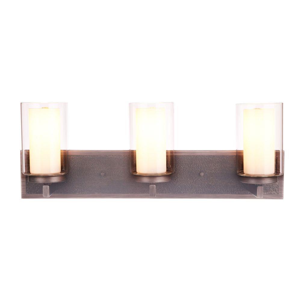 The Texture Vanity Collection offers an updated rugged appeal of the wide hammered metal back plate complements the double glass shades featuring a crisp clear glass outer shade with white frosted inner shade. Texture is offered in five sizes from a single light sconce to a five light vanity.