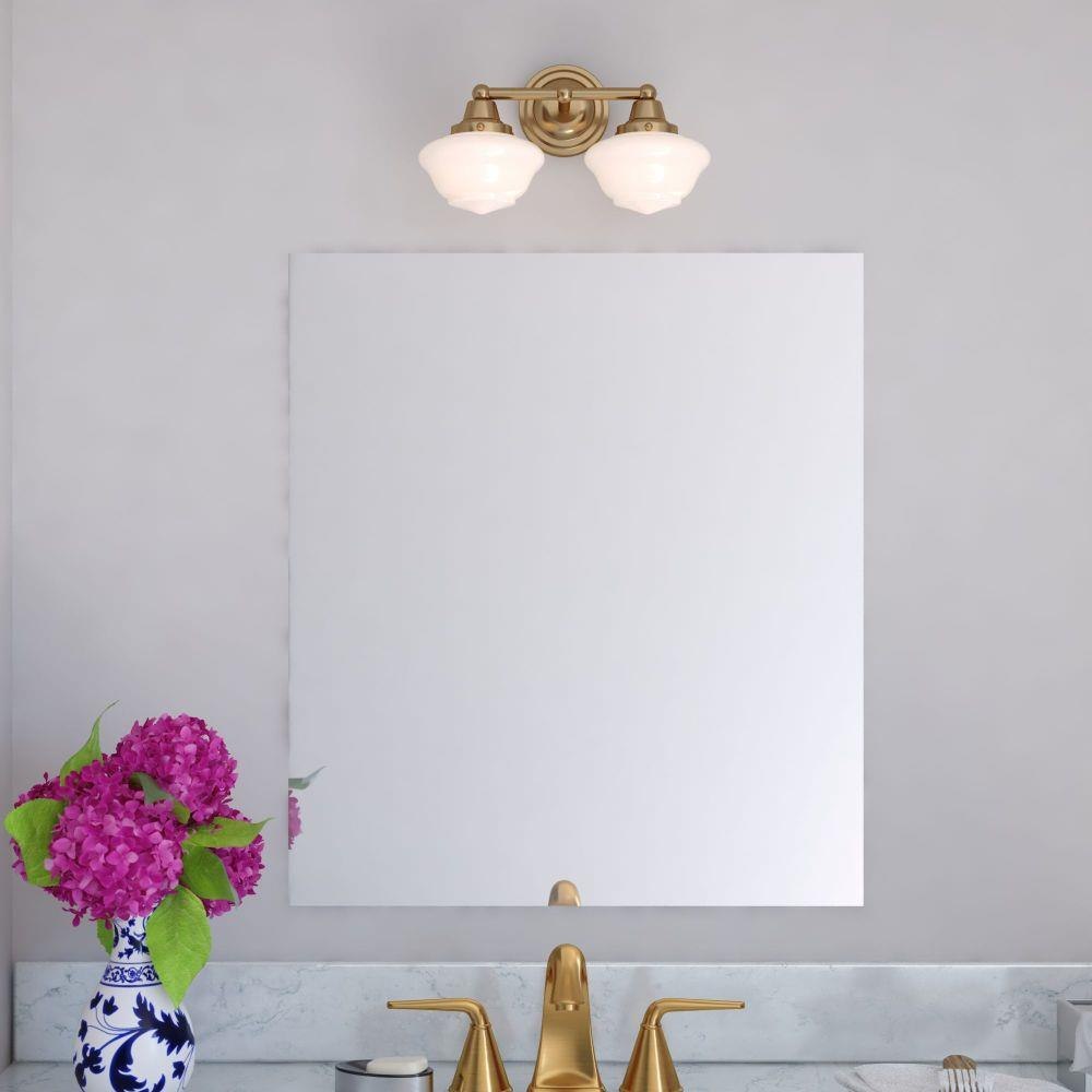 Add a touch of vintage charm to your home with the Eastgate 2-light vanity light’s classic schoolhouse design. Its timeless silhouette and warm antique gold finish bring a refined, nostalgic feel to any bathroom or powder room. White frosted opal glass shades softly diffuse the light, creating a warm and welcoming glow that enhances your daily routine. Designed to complement both traditional and transitional spaces, the Eastgate collection combines enduring style with everyday functionality.