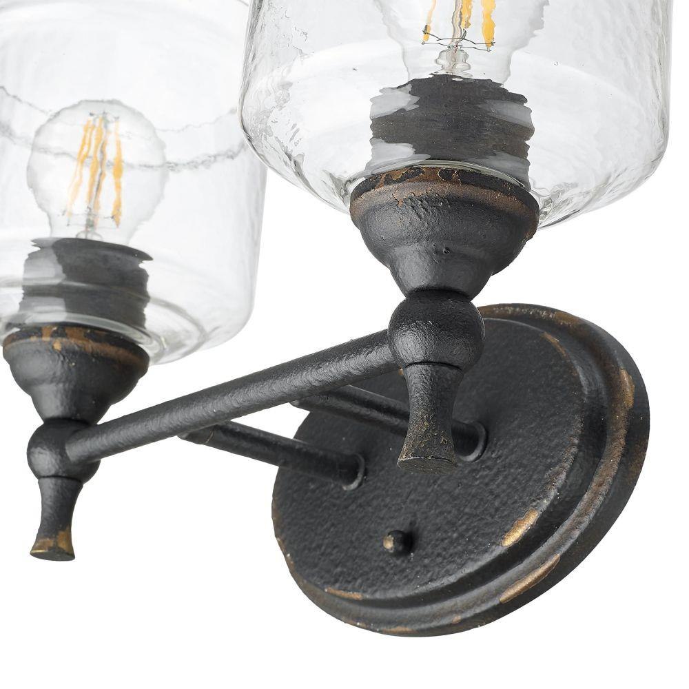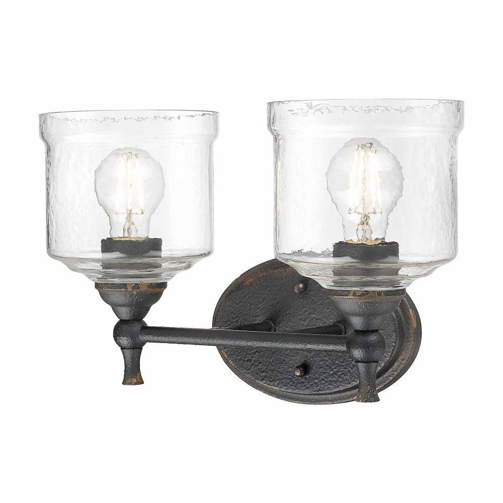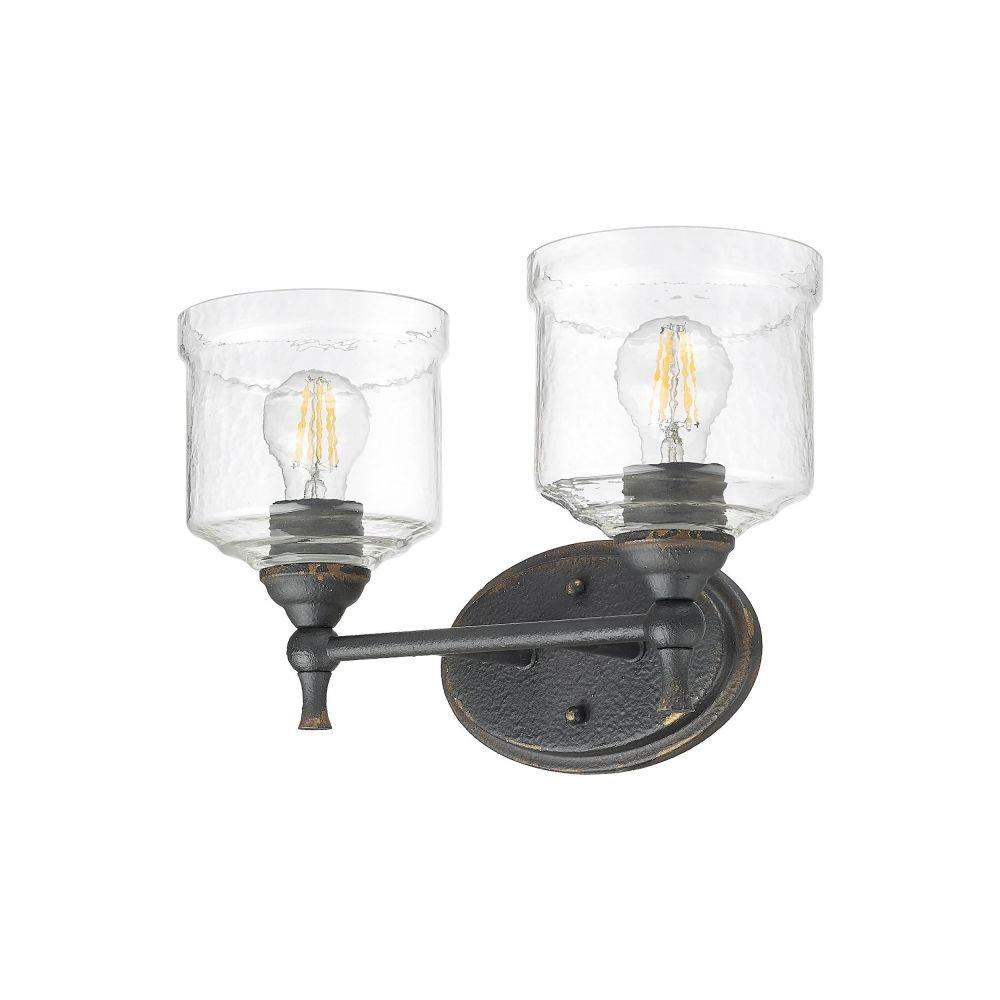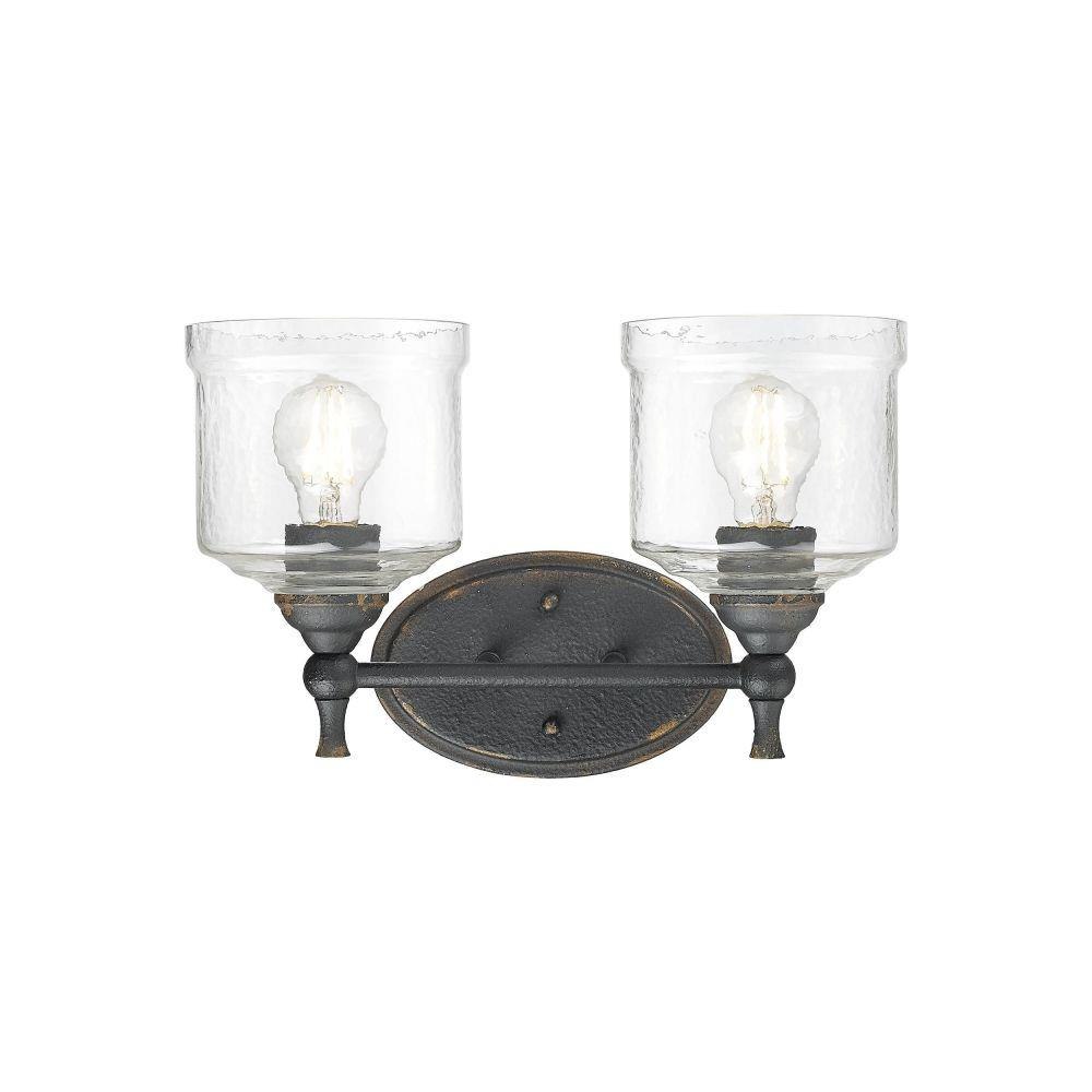 Elevate your space with a touch of rustic elegance, thanks to the Golden Lighting Keating 2-light Vanity. Featuring a glass shade and an antique black iron frame, it's perfect for creating a welcoming atmosphere in bathrooms.The glass shade showcases hammered water glass, lending itself to an enchanting light effect that beautifully refracts illumination in your home.Capturing the raw, authentic charm of a bygone era, the antique black iron finish tells a story of time, revealing glimpses of a warm, antiqued gold base beneath its textured surface.Designed for damp locations, this vanity light is suitable for bathrooms and other semi-enclosed spaces with occasional moisture. It requires 2 E26 Medium base bulbs (not included), with a maximum wattage of 100 per bulb.Overall Dimensions: 15"W x 9.75"H x 7.5"D, making it an ideal choice for any bathroom seeking style and practicality.Infuse your space with the artistry and craftsmanship you deserve.