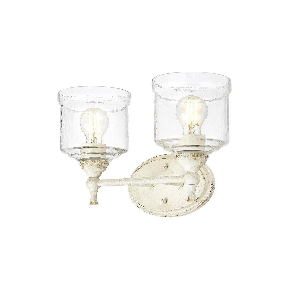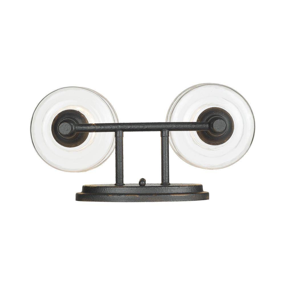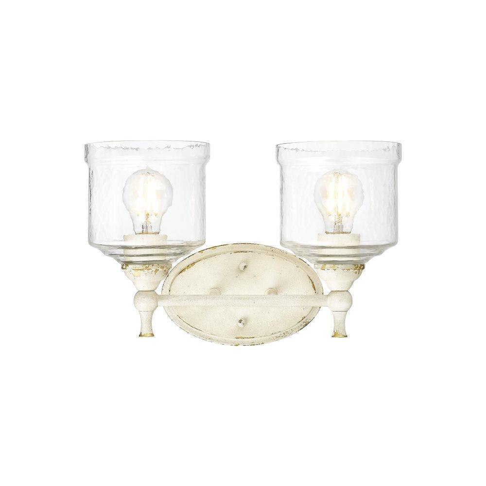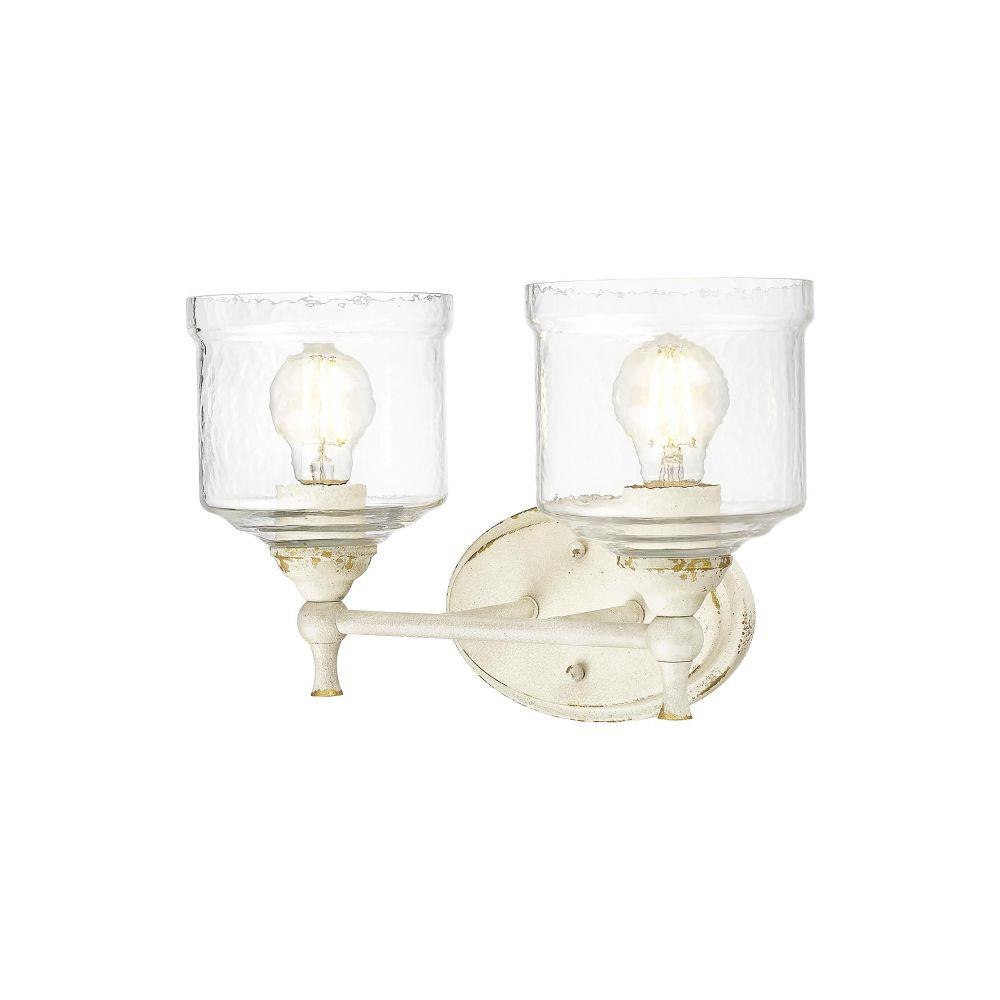 Elevate your space with a touch of rustic elegance, thanks to the Golden Lighting Keating 2-light Vanity. Featuring a glass shade and an antique black iron frame, it's perfect for creating a welcoming atmosphere in bathrooms.The glass shade showcases hammered water glass, lending itself to an enchanting light effect that beautifully refracts illumination in your home.Capturing the raw, authentic charm of a bygone era, the antique black iron finish tells a story of time, revealing glimpses of a warm, antiqued gold base beneath its textured surface.Designed for damp locations, this vanity light is suitable for bathrooms and other semi-enclosed spaces with occasional moisture. It requires 2 E26 Medium base bulbs (not included), with a maximum wattage of 100 per bulb.Overall Dimensions: 15"W x 9.75"H x 7.5"D, making it an ideal choice for any bathroom seeking style and practicality.Infuse your space with the artistry and craftsmanship you deserve.