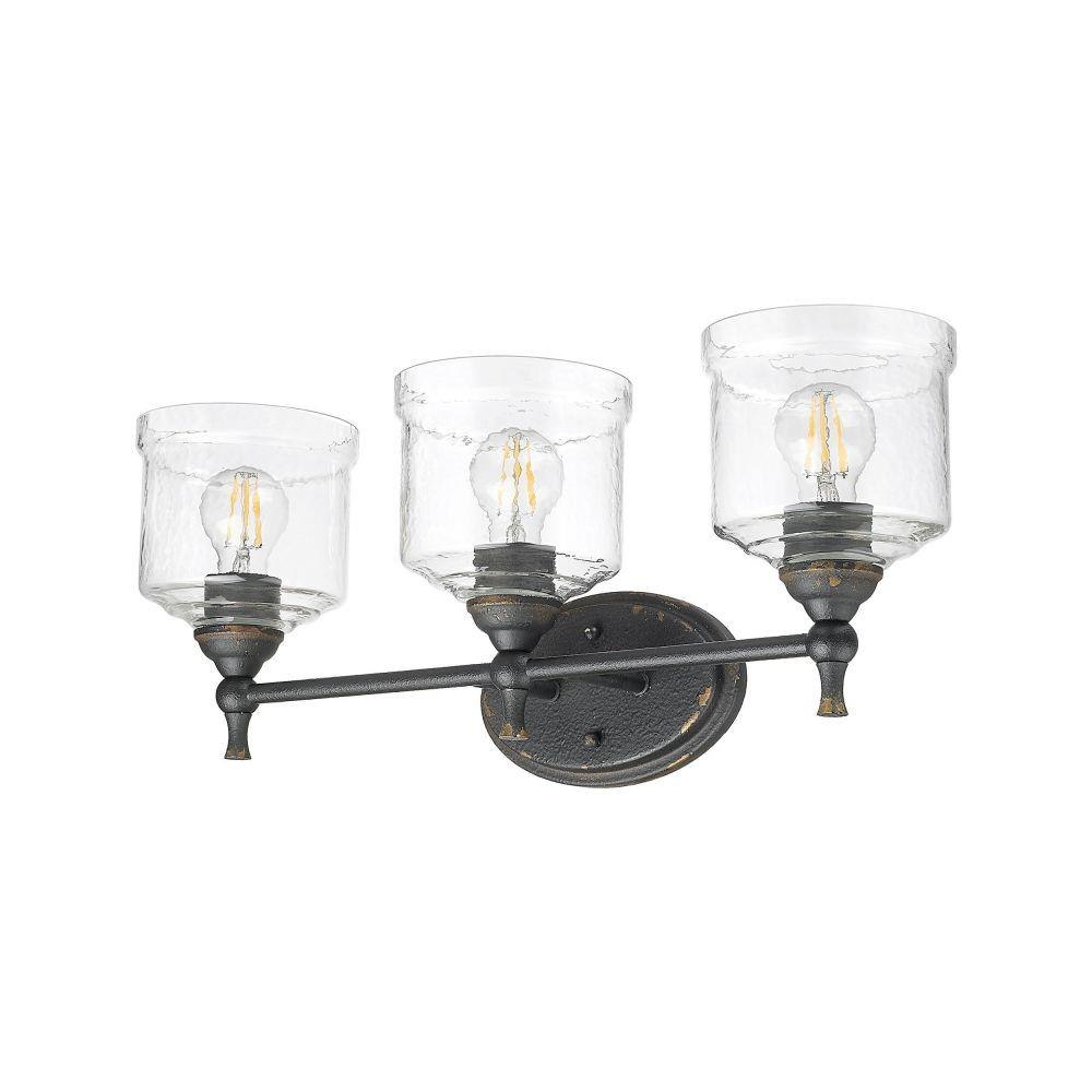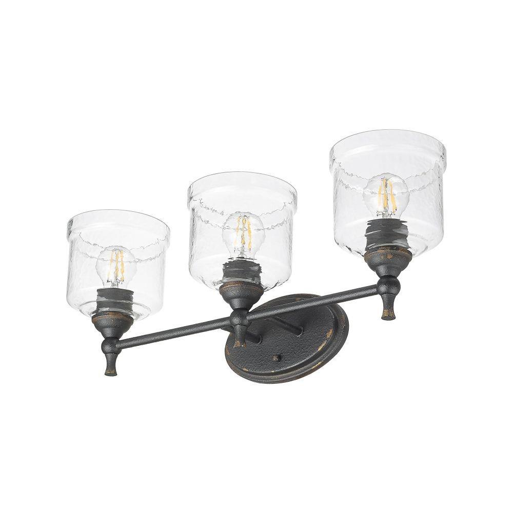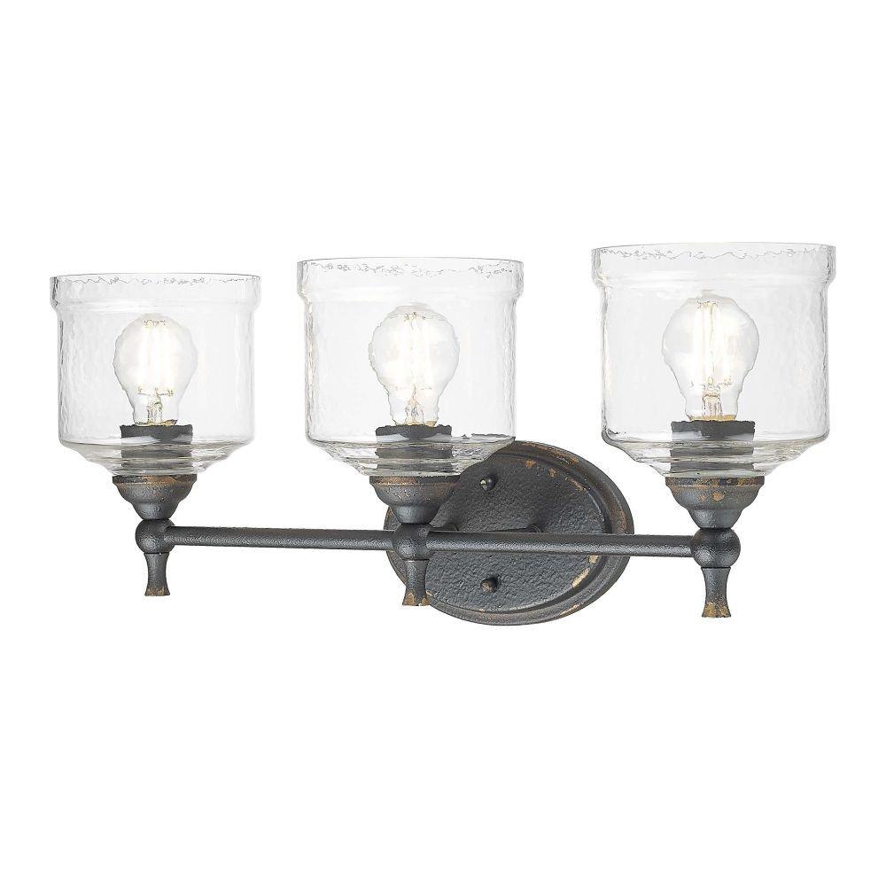 Bring farmhouse elegance into your home with the Golden Lighting Keating 3-light Vanity in Antique Black Iron. Featuring a glass shade and a rustic Antique Black Iron frame, it creates a welcoming atmosphere. This glass shade offers a Hammered Water Glass finish, distinguished by a heavy, irregular texture that beautifully distorts and refracts light, adding an artisanal touch to your space. The Antique Black Iron finish captures the raw charm of time with a textured matte black surface revealing glimpses of a warm gold base, perfect for adding handcrafted character. Brighten up bathrooms with dedicated lighting that flatters while providing practical task illumination. The fixture is damp location rated, suitable for covered spaces with occasional moisture like bathrooms and laundry rooms. Overall Dimensions: 23.88"W x 9.75"H x 7.5"D. Requires 3 E26 Medium base bulbs (not included), maximum 100 wattage per bulb. Perfect for creating a cozy, inviting ambiance, this fixture complements any rustic or traditional decor while showcasing quality craftsmanship.