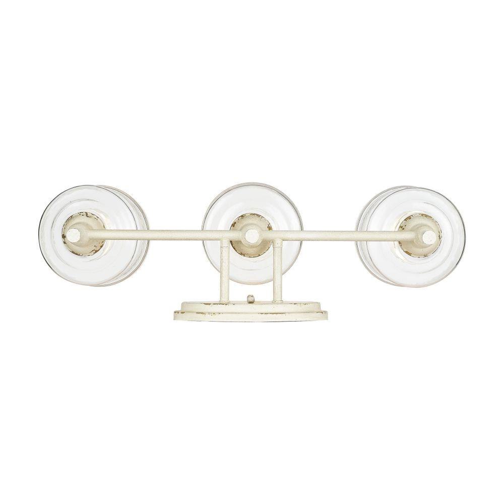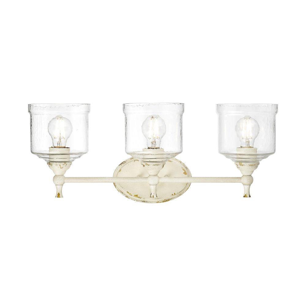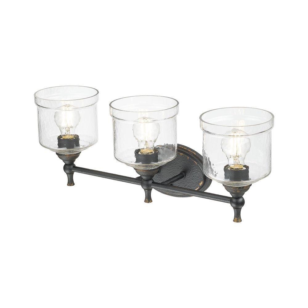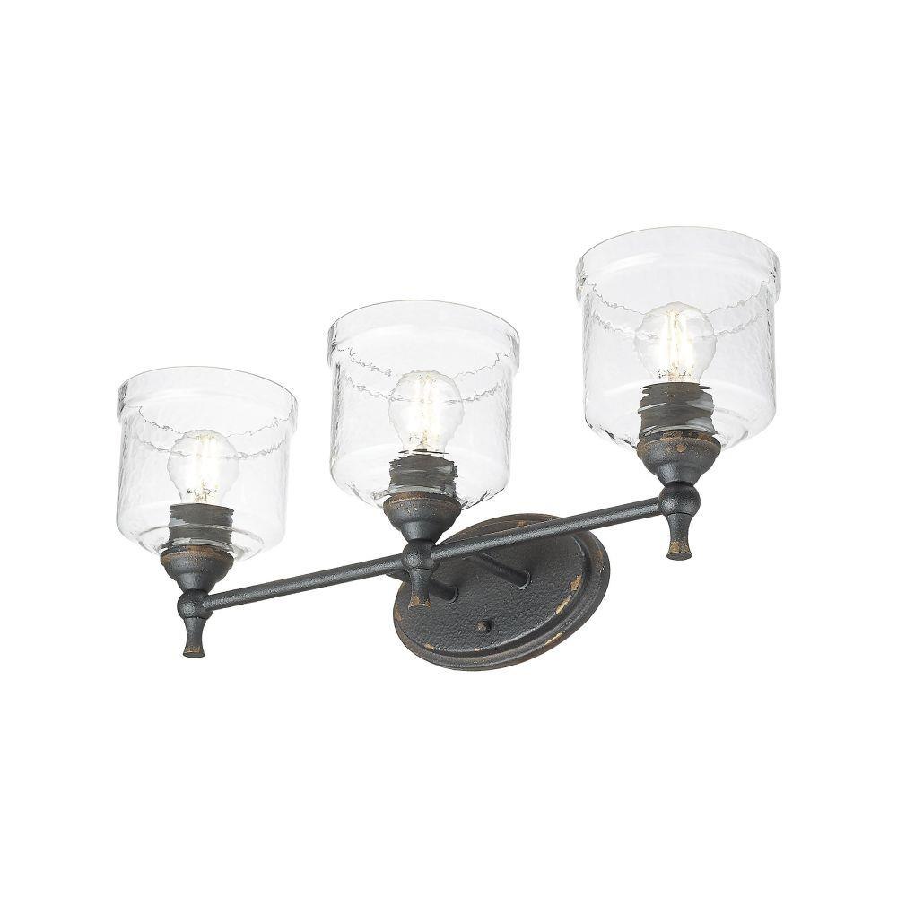 Bring farmhouse elegance into your home with the Golden Lighting Keating 3-light Vanity in Antique Black Iron. Featuring a glass shade and a rustic Antique Black Iron frame, it creates a welcoming atmosphere. This glass shade offers a Hammered Water Glass finish, distinguished by a heavy, irregular texture that beautifully distorts and refracts light, adding an artisanal touch to your space. The Antique Black Iron finish captures the raw charm of time with a textured matte black surface revealing glimpses of a warm gold base, perfect for adding handcrafted character. Brighten up bathrooms with dedicated lighting that flatters while providing practical task illumination. The fixture is damp location rated, suitable for covered spaces with occasional moisture like bathrooms and laundry rooms. Overall Dimensions: 23.88"W x 9.75"H x 7.5"D. Requires 3 E26 Medium base bulbs (not included), maximum 100 wattage per bulb. Perfect for creating a cozy, inviting ambiance, this fixture complements any rustic or traditional decor while showcasing quality craftsmanship.