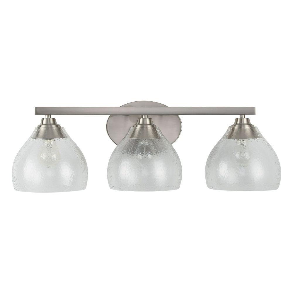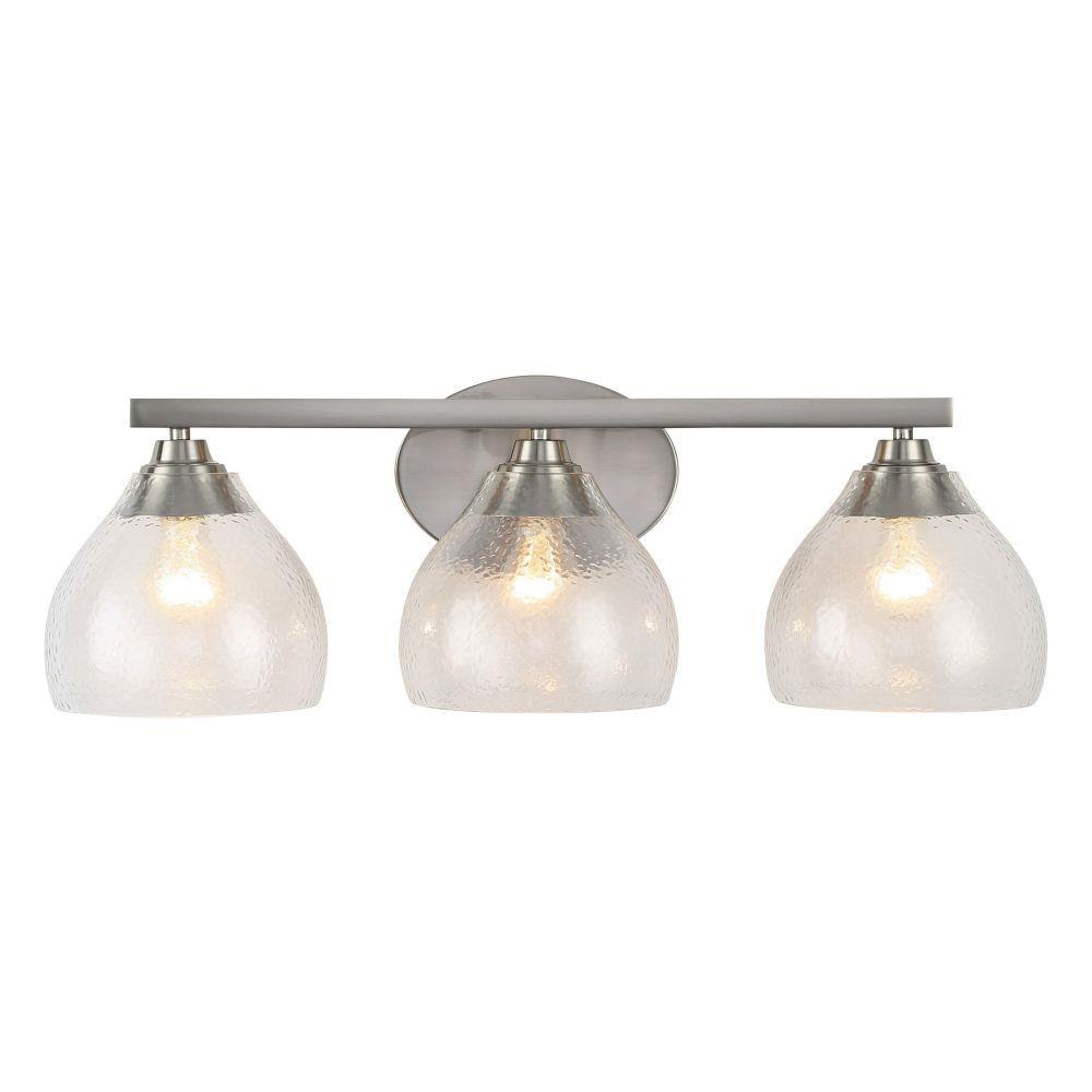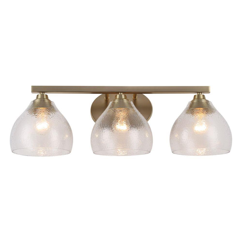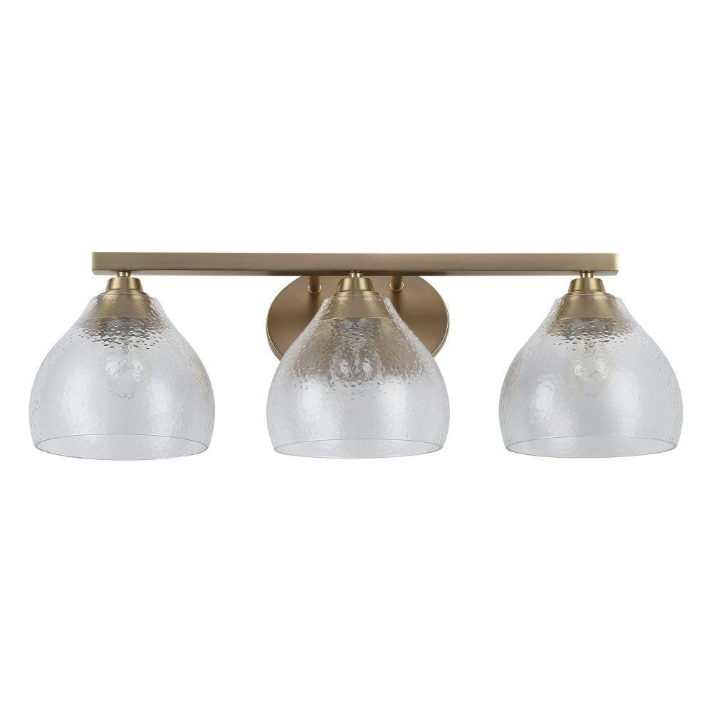Bring Transitional elegance into your home with the Golden Lighting Ariella 3-light Vanity in Brushed Champagne Brass. Featuring a glass shade, it creates a welcoming atmosphere. The Hammered Clear Glass shade showcases a captivating texture that reflects light brilliantly. The sophisticated Brushed Champagne Brass finish provides a chic alternative to gold, ensuring a soft and warm ambiance. Rated for damp locations, the fixture is perfect for bathrooms or other moisture-prone areas. It requires 3 E26 Medium base bulbs (not included, max 60 watts per bulb), and its overall dimensions are 26.38"W x 8.88"H x 8.88"D. Discover a blend of elegance and quality with Golden Lighting.
