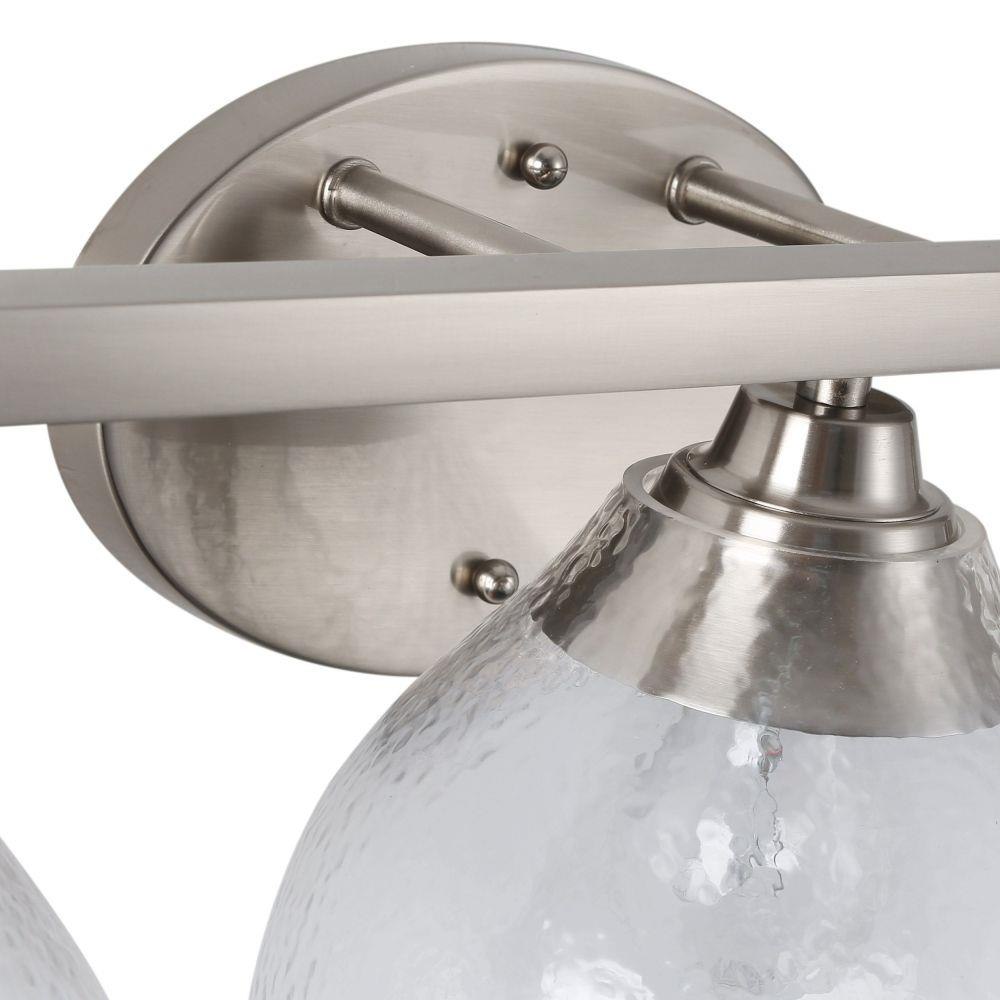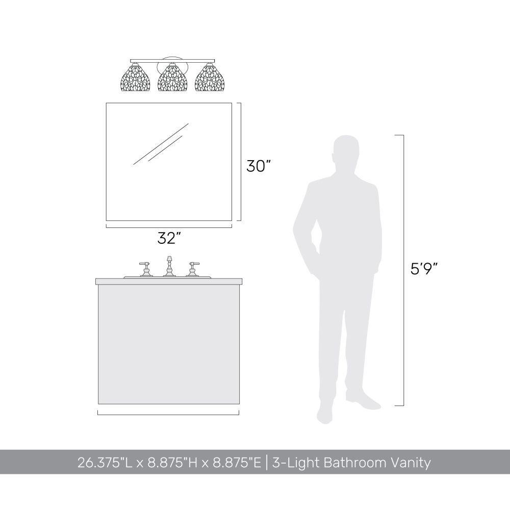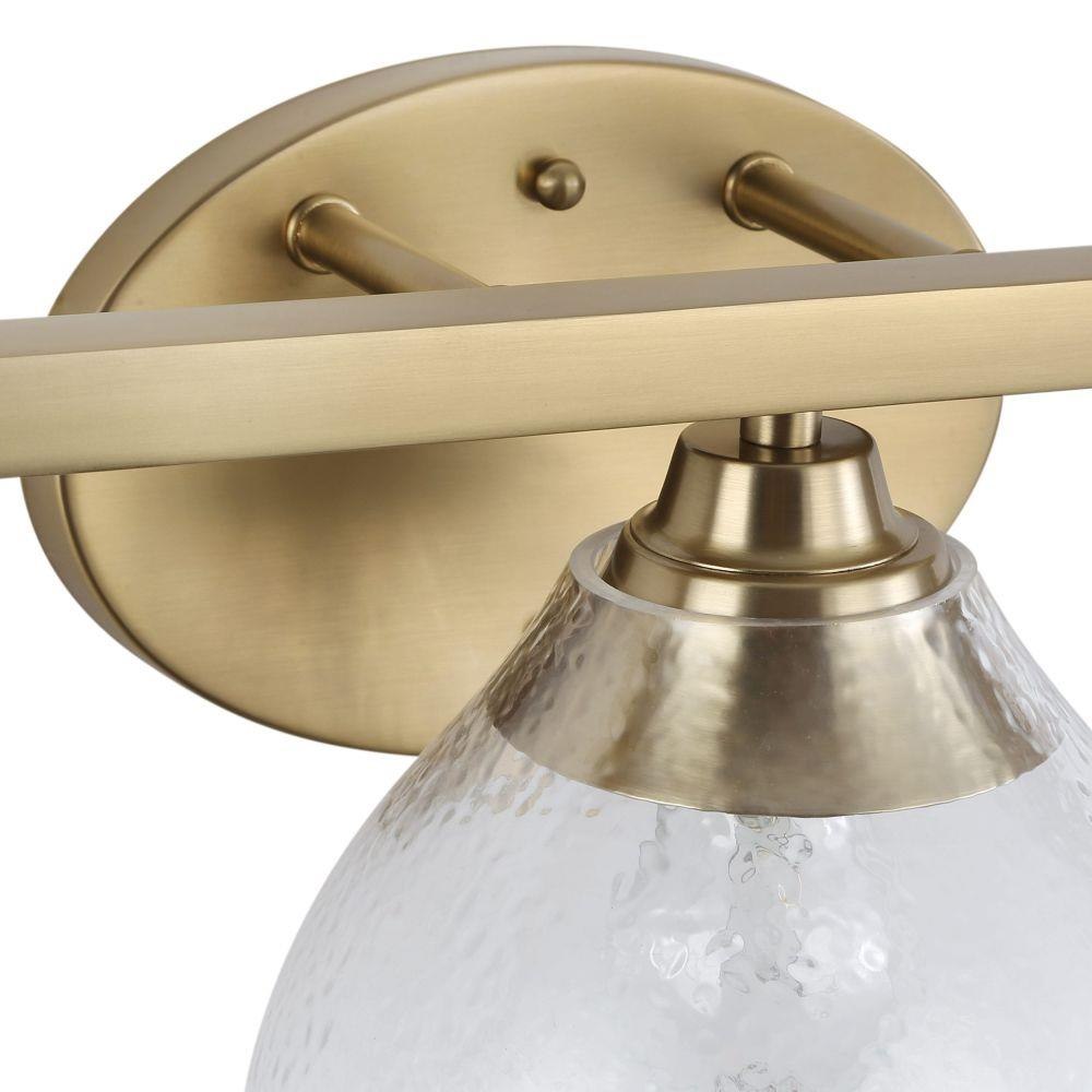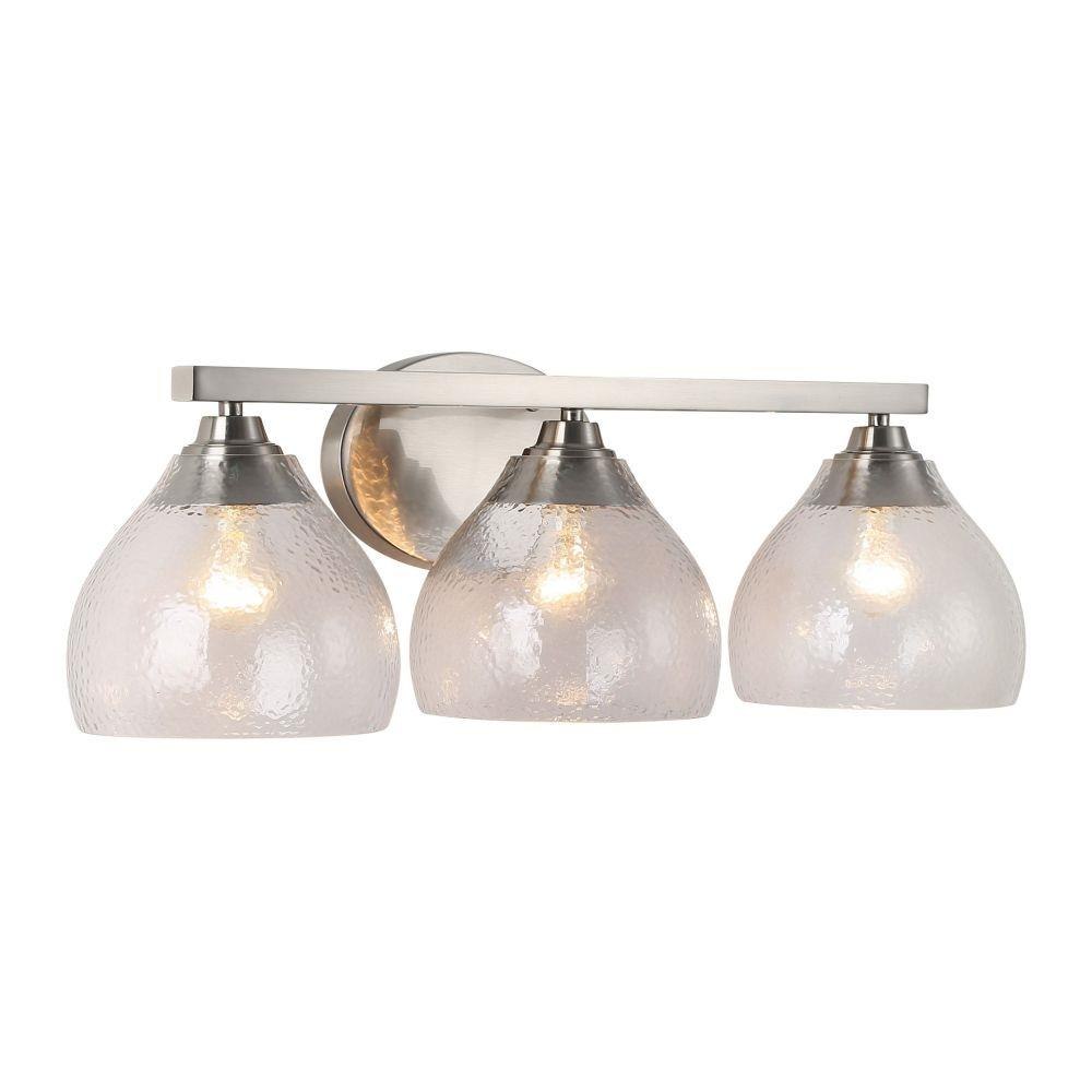 Bring Transitional elegance into your home with the Golden Lighting Ariella 3-light Vanity in Brushed Champagne Brass. Featuring a glass shade, it creates a welcoming atmosphere. The Hammered Clear Glass shade showcases a captivating texture that reflects light brilliantly. The sophisticated Brushed Champagne Brass finish provides a chic alternative to gold, ensuring a soft and warm ambiance. Rated for damp locations, the fixture is perfect for bathrooms or other moisture-prone areas. It requires 3 E26 Medium base bulbs (not included, max 60 watts per bulb), and its overall dimensions are 26.38"W x 8.88"H x 8.88"D. Discover a blend of elegance and quality with Golden Lighting.