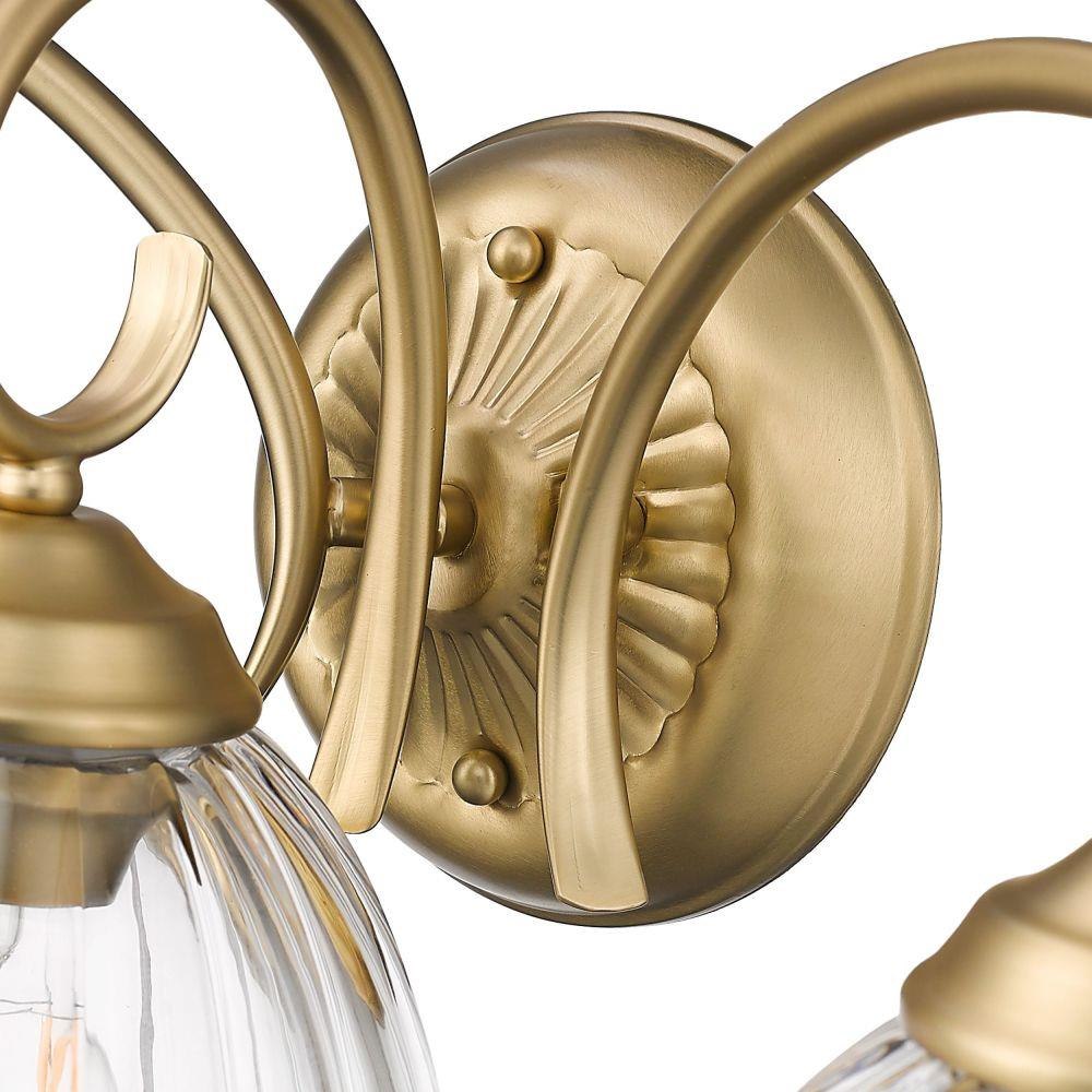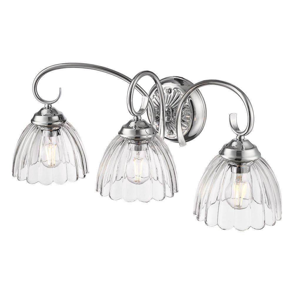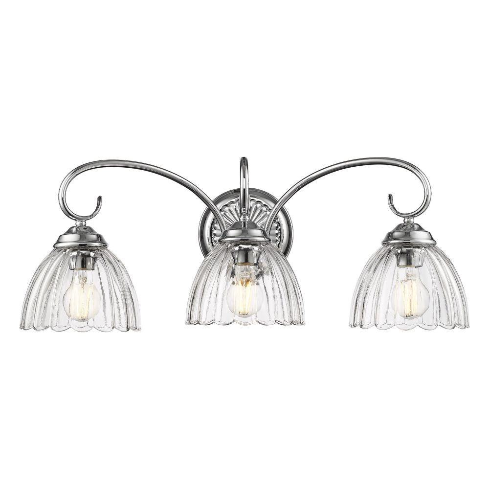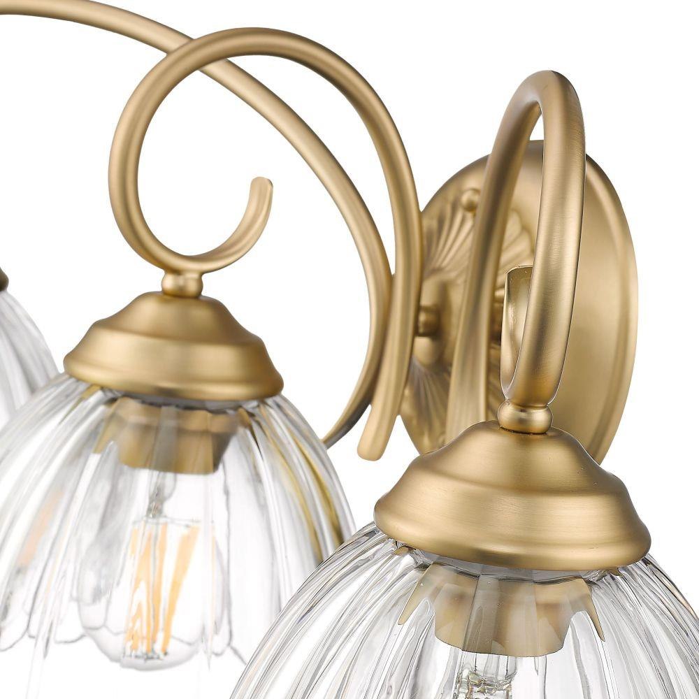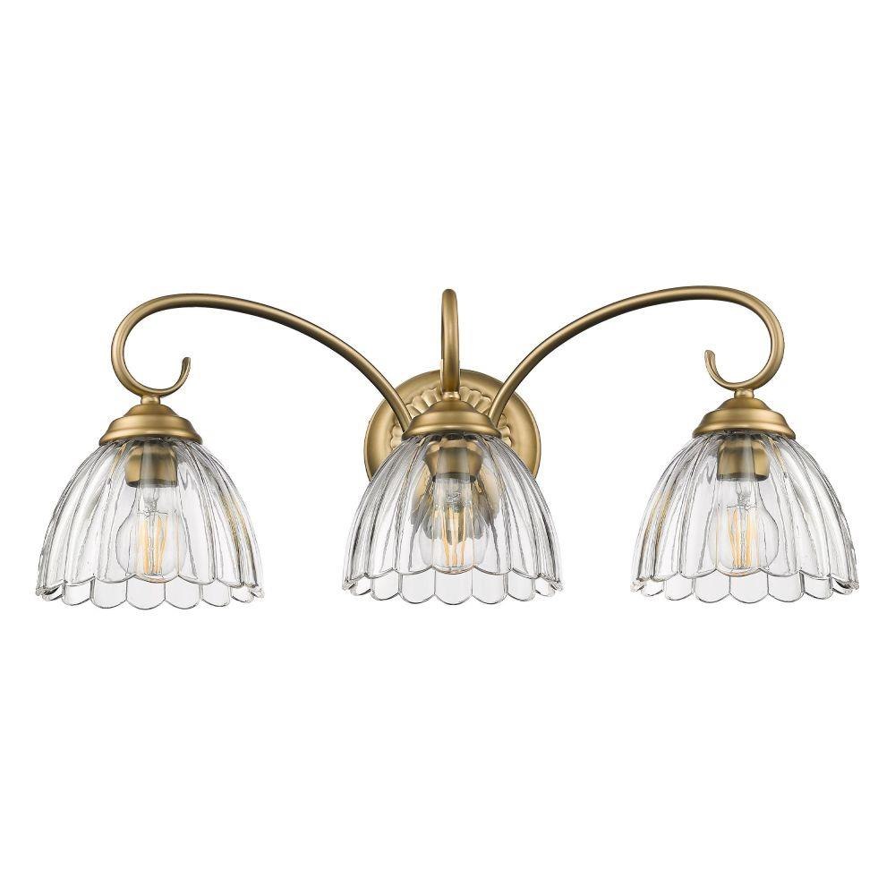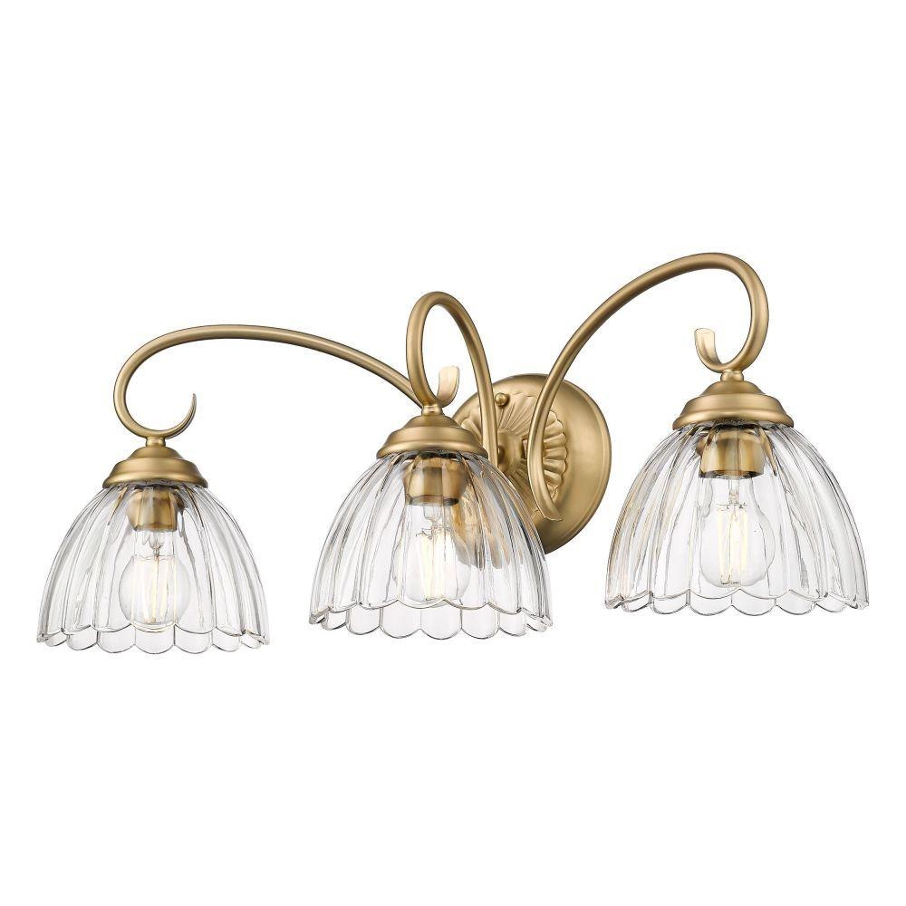 Bring glamorous elegance into your home with the Golden Lighting Audra 3-light Vanity. Featuring a glass shade and a Brushed Champagne Brass frame, it creates a welcoming atmosphere. The clear glass shade provides unobstructed light that beautifully enhances the sophisticated look. The Brushed Champagne Brass finish combines warmth and softness for a chic appearance, perfect for modern interiors. This fixture is damp location rated, suitable for bathrooms and semi-enclosed spaces. Requires 3 E26 Medium base bulbs (not included), with a maximum wattage of 60 per bulb. Overall dimensions are 25.5"W x 9.63"H x 9.5"D. Elevate your bathroom with this luxurious fixture that merges functionality with stunning beauty.