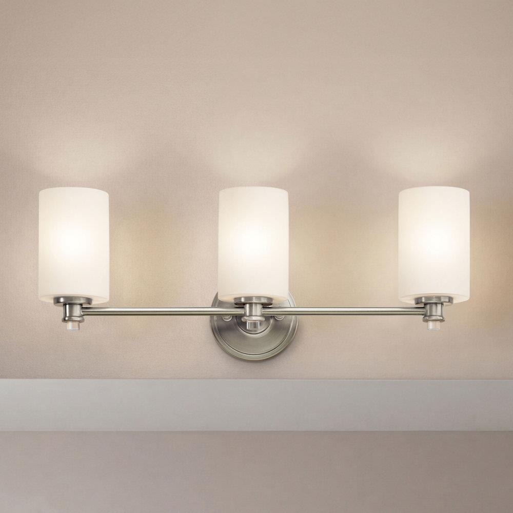 Joelson delivers a 3-light vanity that's transitional and versatile. This fixture showcases retro-inspired light bulb sockets with beautiful satin etched cased opal glass.
