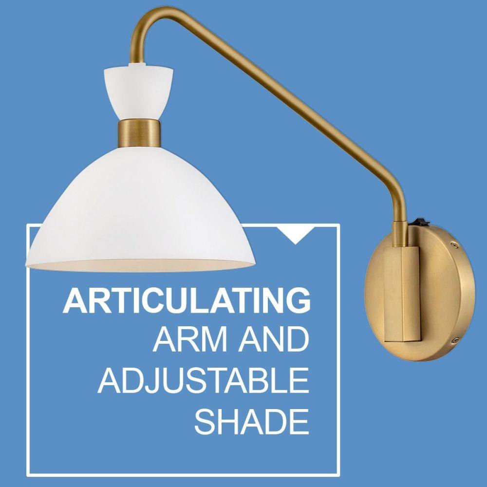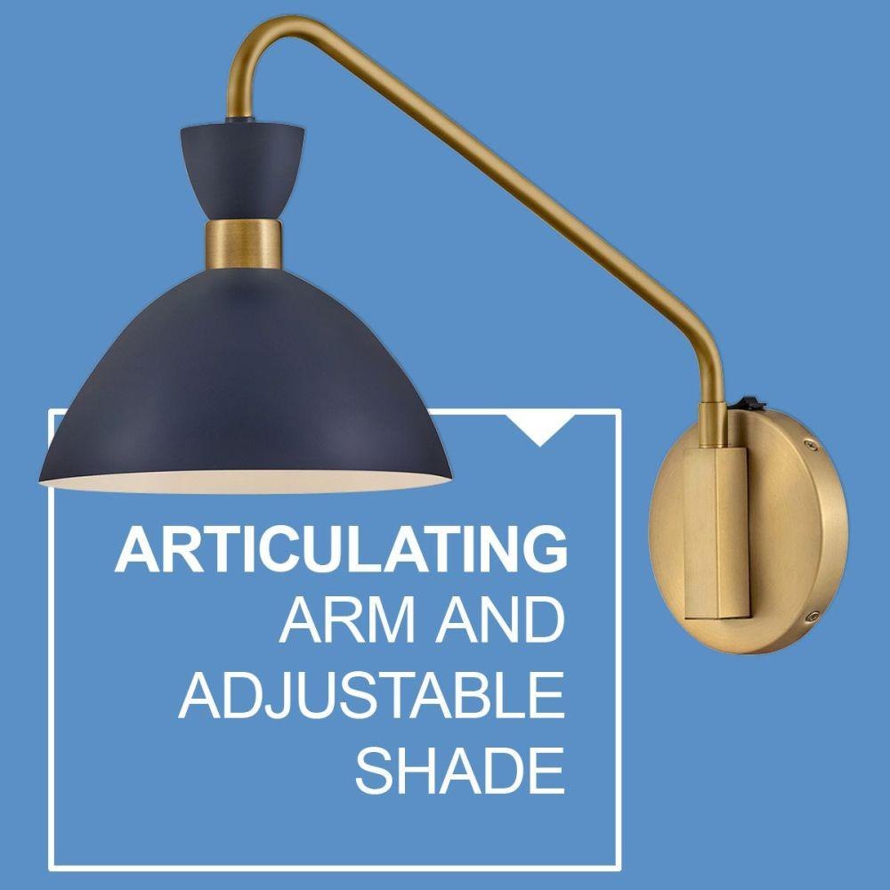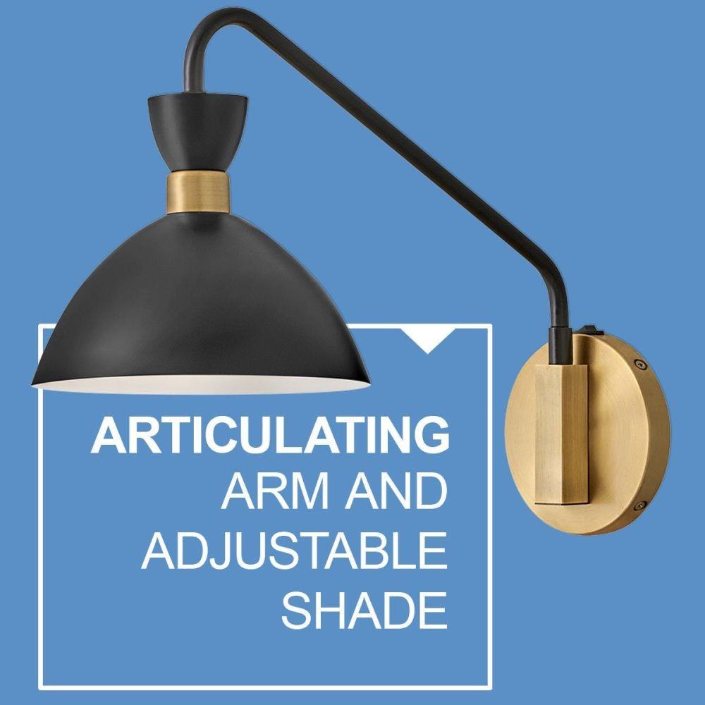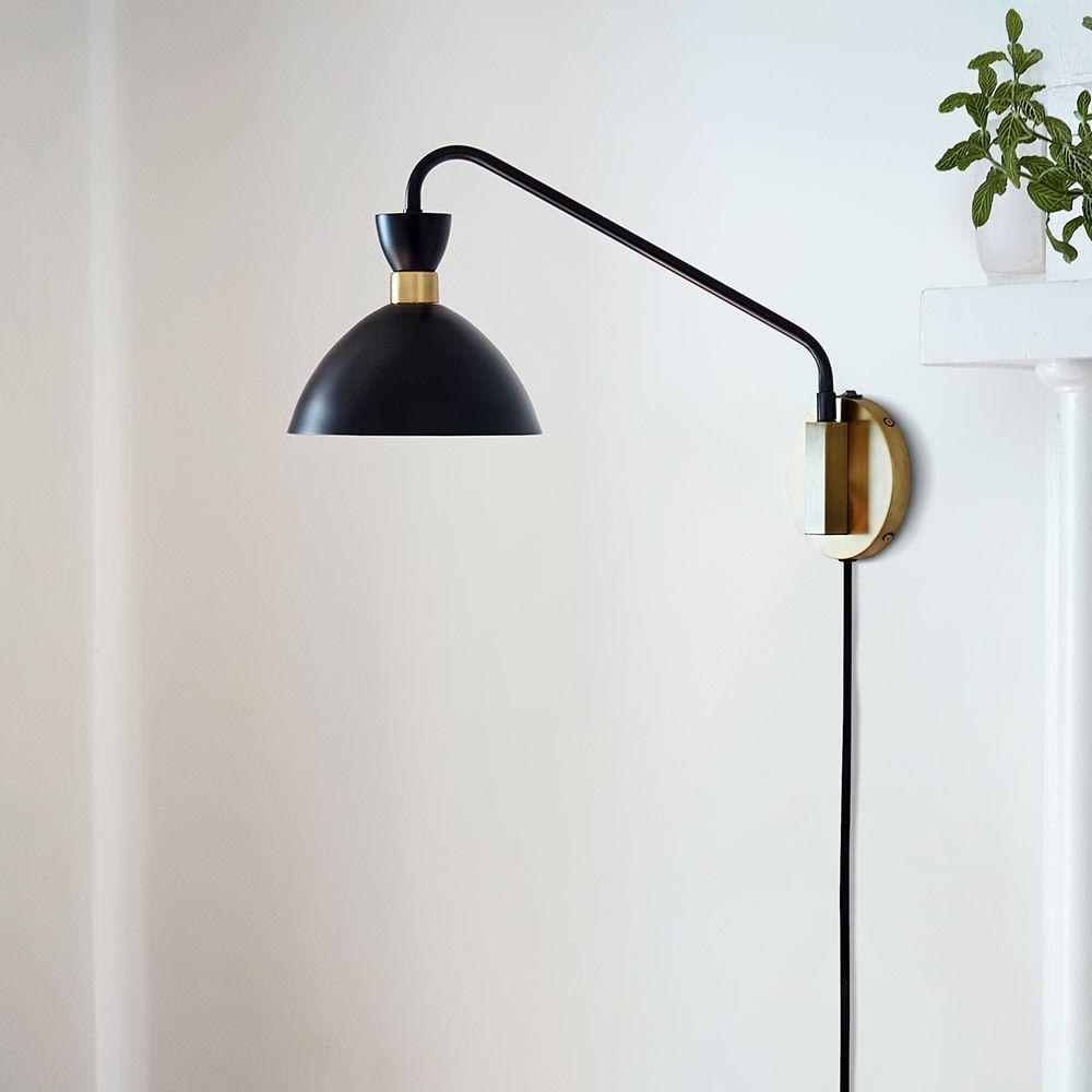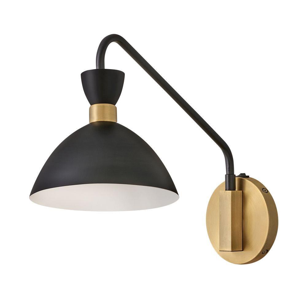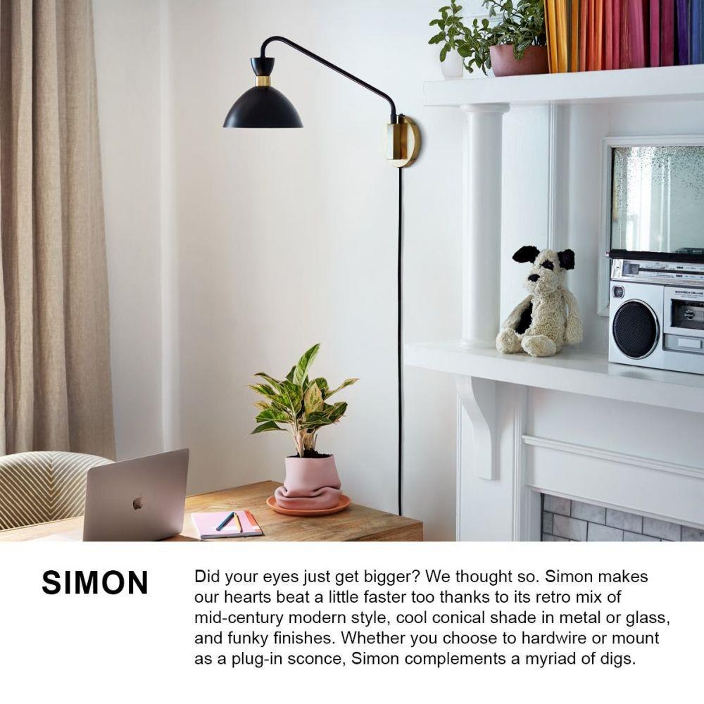 The Simon sconce makes our hearts beat a little faster thanks to its retro mix of mid-century modern style, adjustable metal shade and a matte Black finish that pops against the luxe Heritage Brass backplate and accent detailing. This petite 1-light sconce features an on/off switch and can be hard-wired or mounted with a black fabric-covered cord.