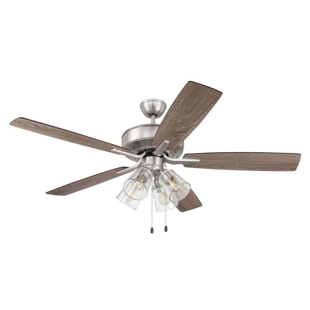The ideal combination of excellent performance, exceptional value and timeless style, the NEW Craftmade Pro Plus 52 inch ceiling fan with clear glass four light with dimmable LED bulbs included featuring a clean motor, updated straight blade arms and canopy is built for performance. The dual mount, 3-speed, reversible fan includes custom 52 inch reversible blades. Optional 44 inch custom reversible blades and remote controls are available.