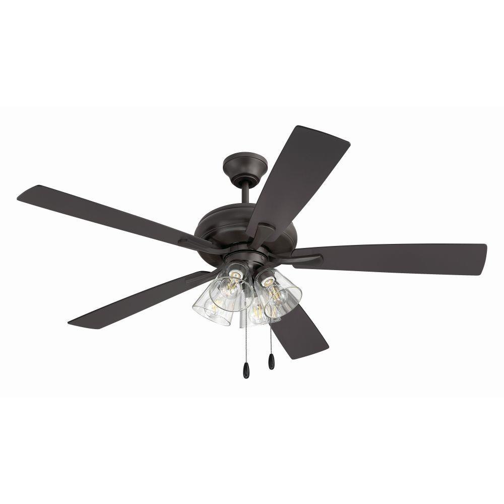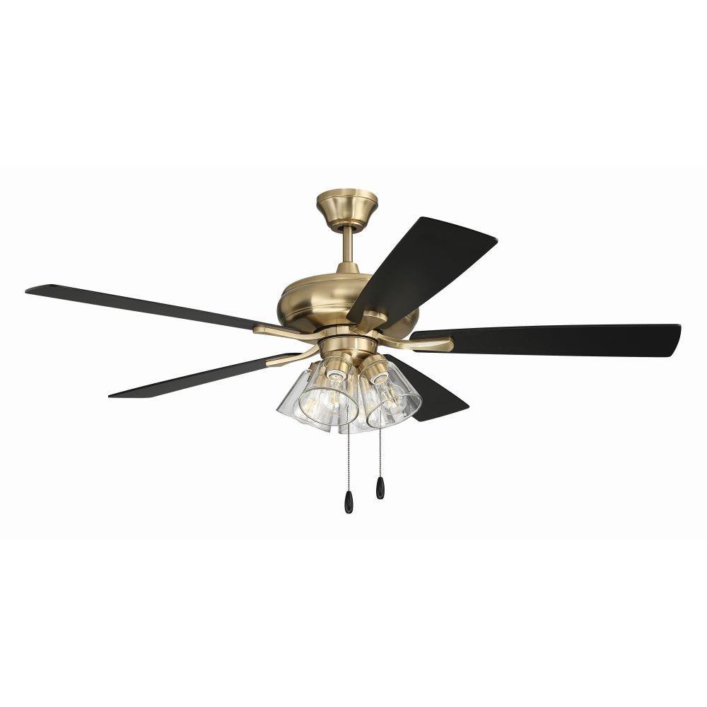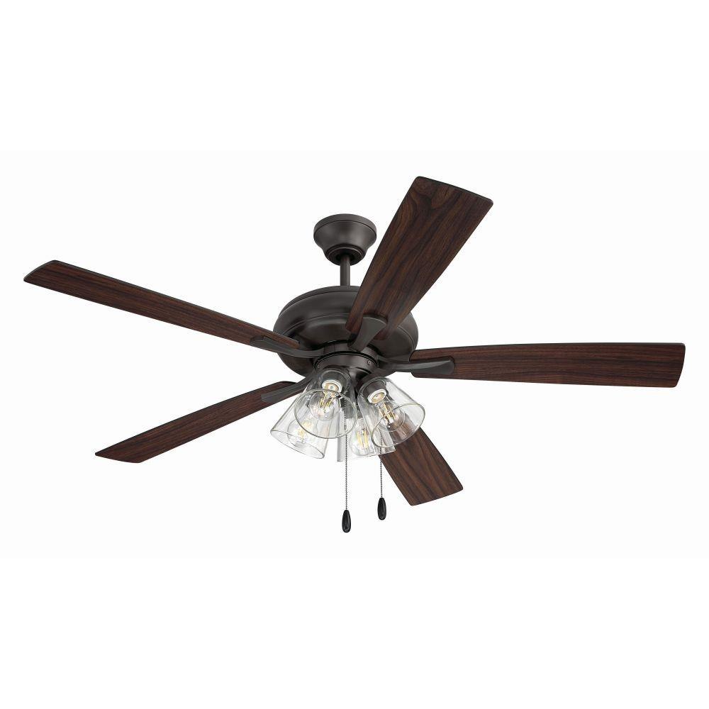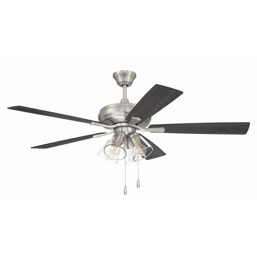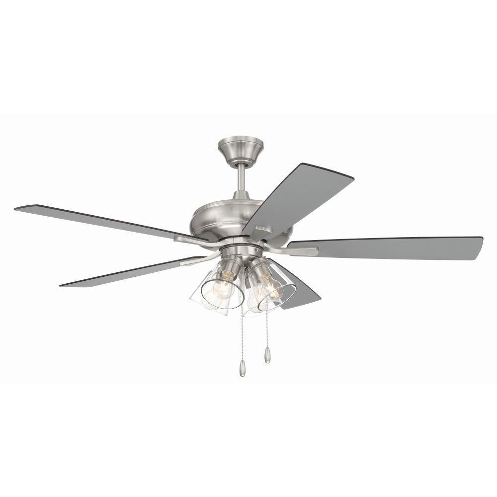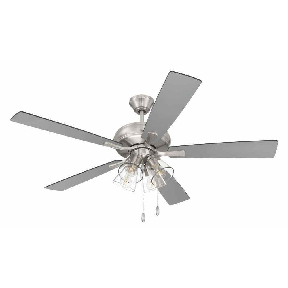 The Craftmade Eos 52" ceiling fan with clear glass four-light kit including dimmable LED bulbs features a smooth, 3-speed, reversible motor, updated blade arms, and reversible custom 52" blades. Optional remote controls are available (Sold Separately).