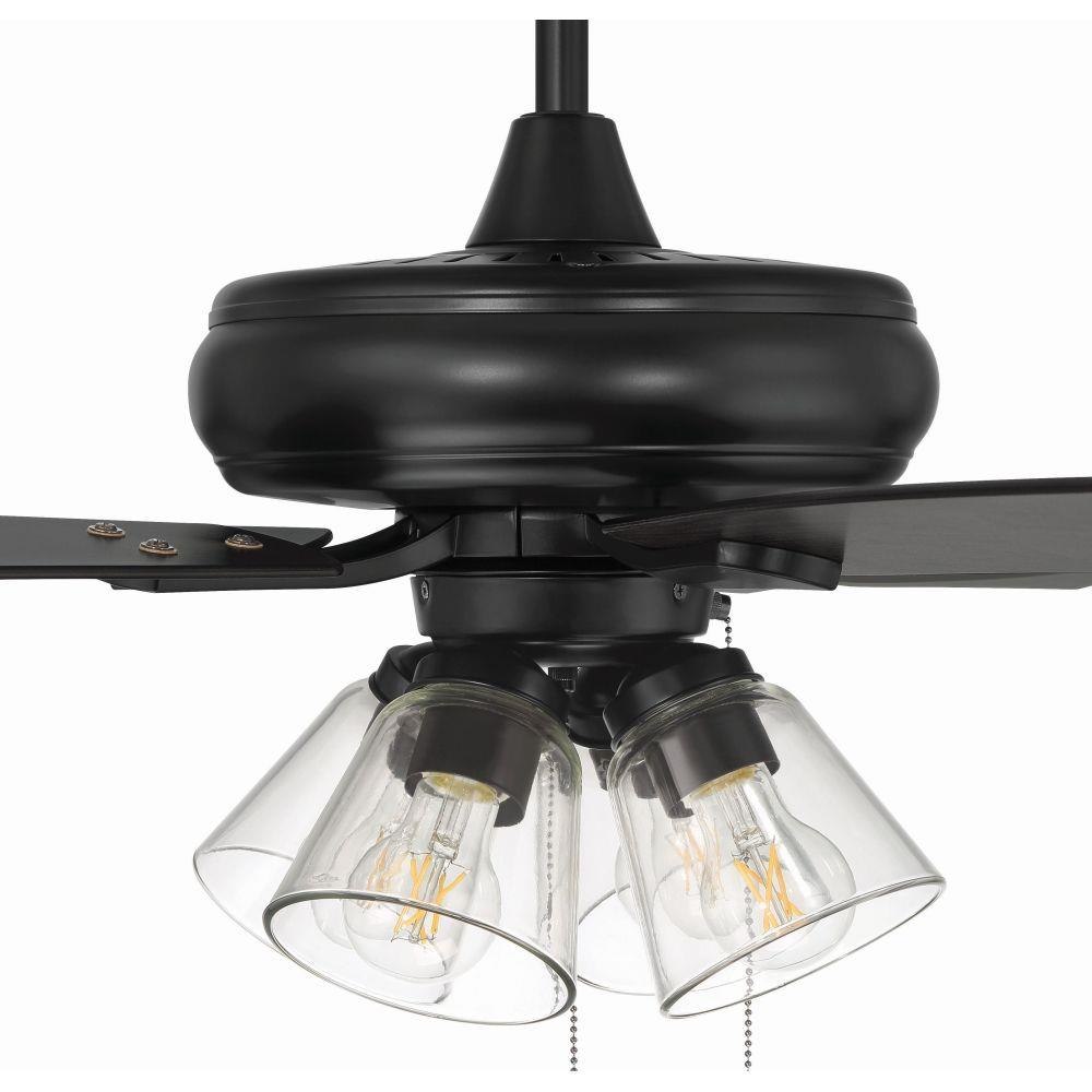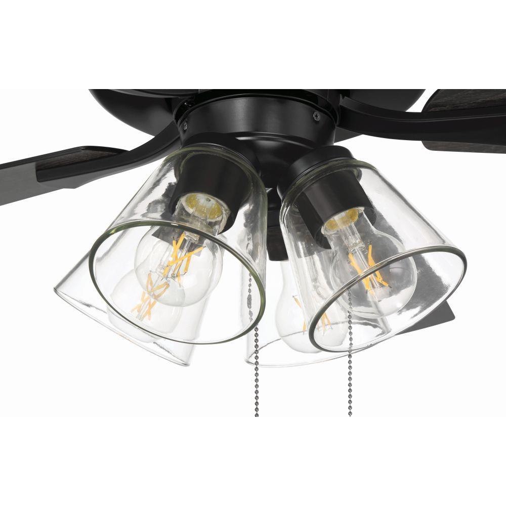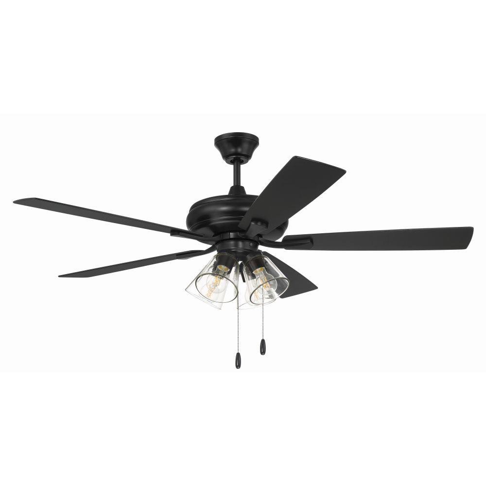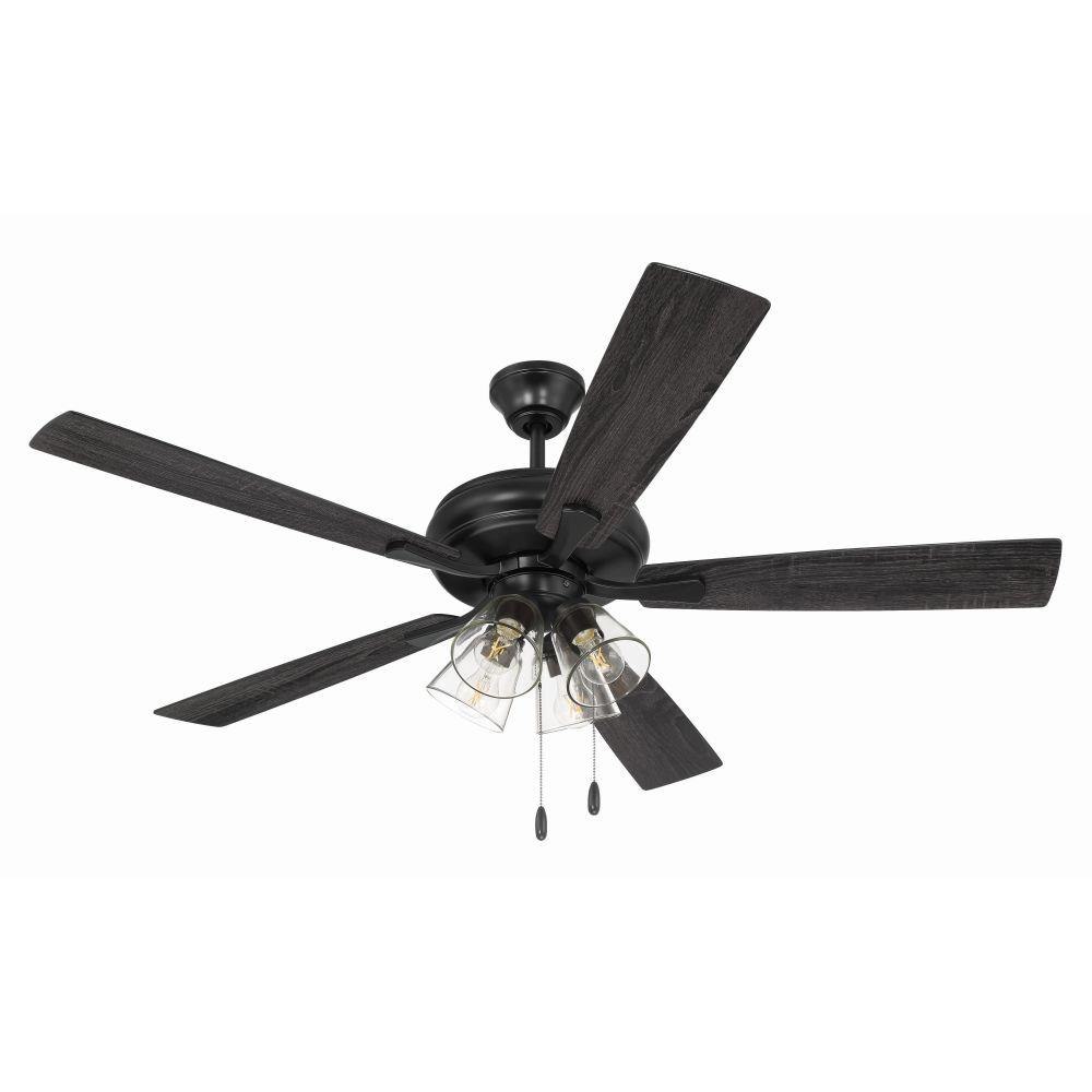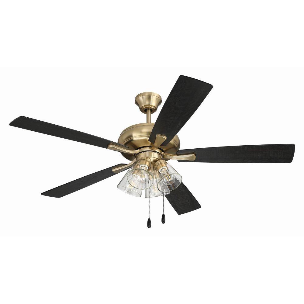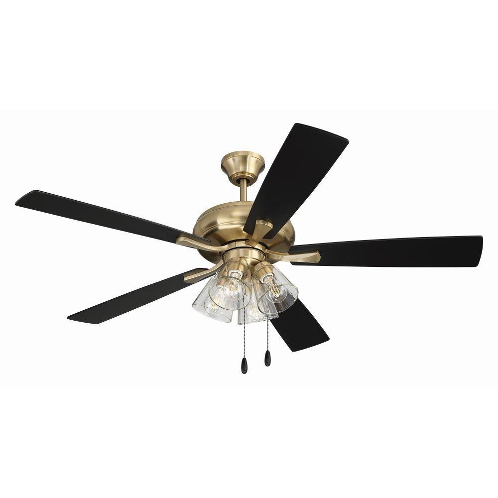 The Craftmade Eos 52" ceiling fan with clear glass four-light kit including dimmable LED bulbs features a smooth, 3-speed, reversible motor, updated blade arms, and reversible custom 52" blades. Optional remote controls are available (Sold Separately).