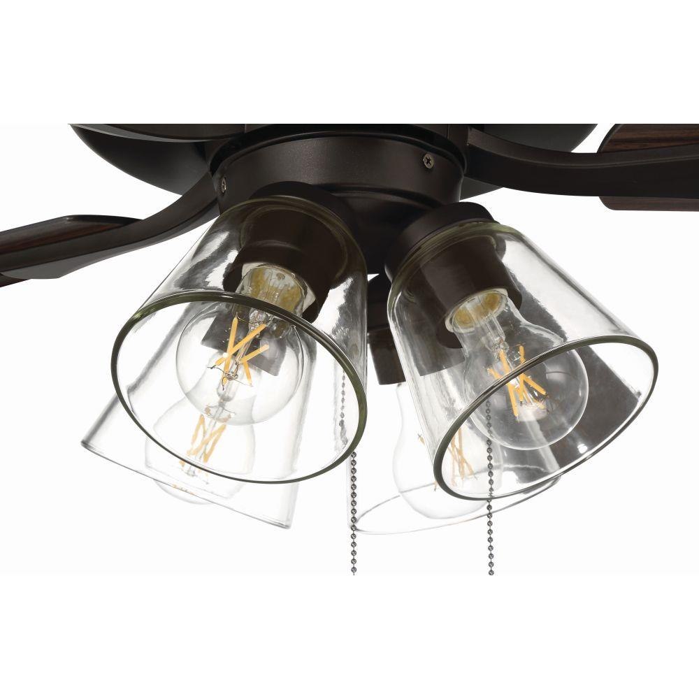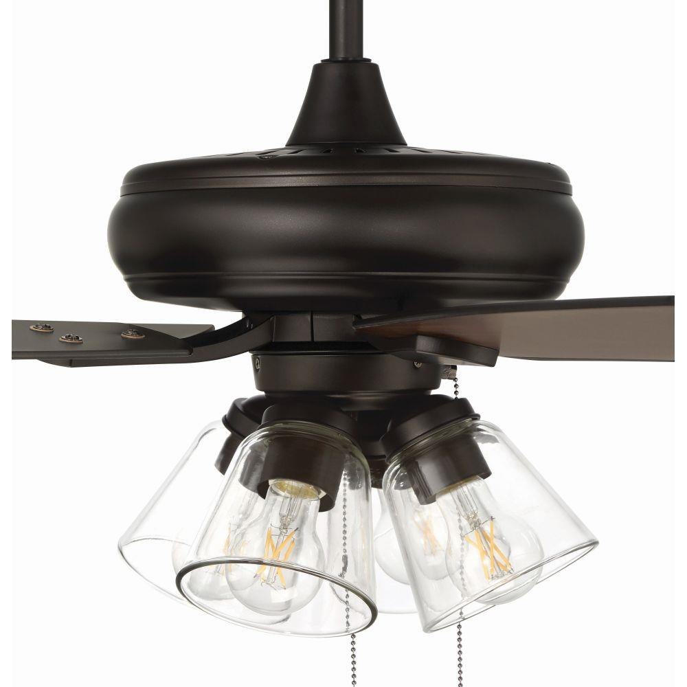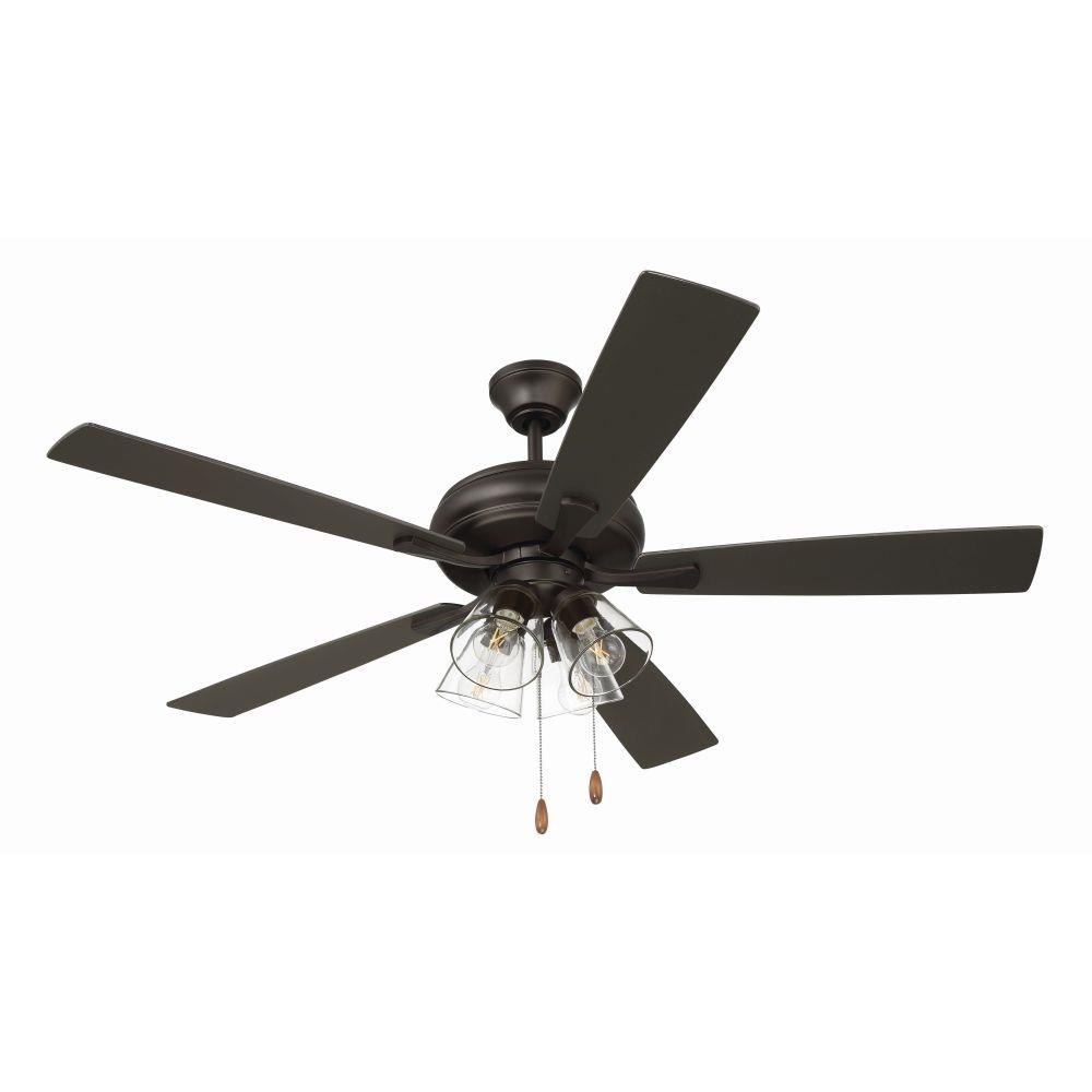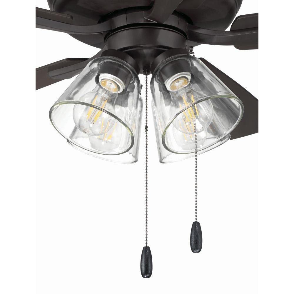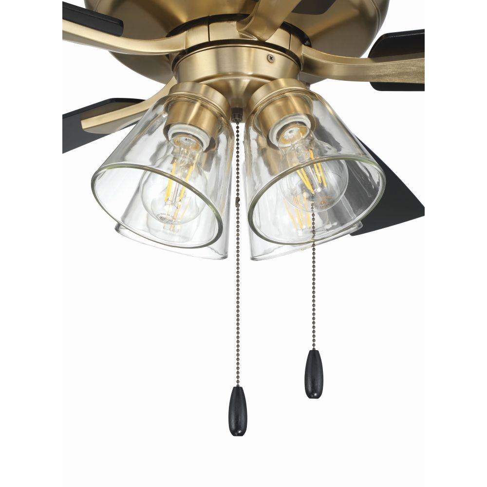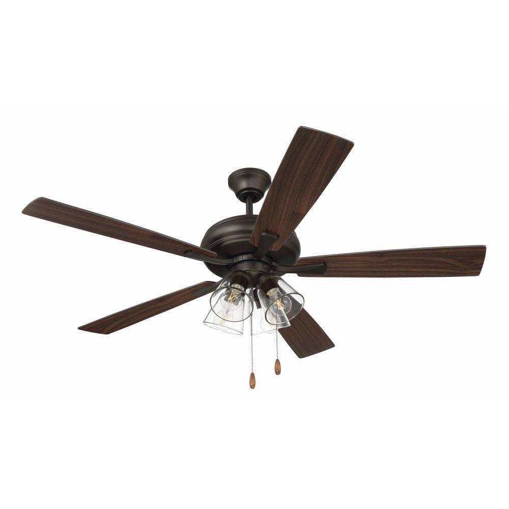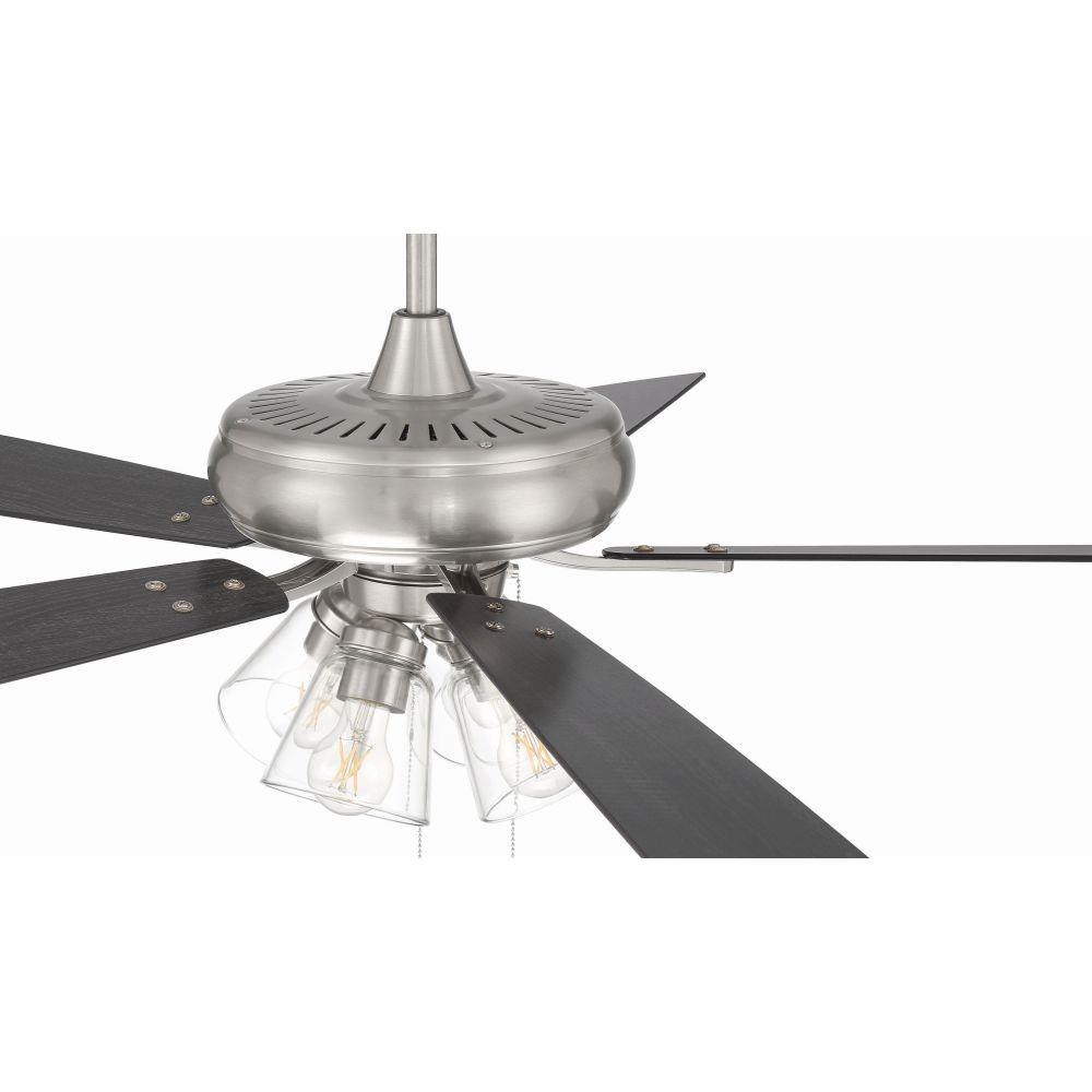 The Craftmade Eos 52" ceiling fan with clear glass four-light kit including dimmable LED bulbs features a smooth, 3-speed, reversible motor, updated blade arms, and reversible custom 52" blades. Optional remote controls are available (Sold Separately).