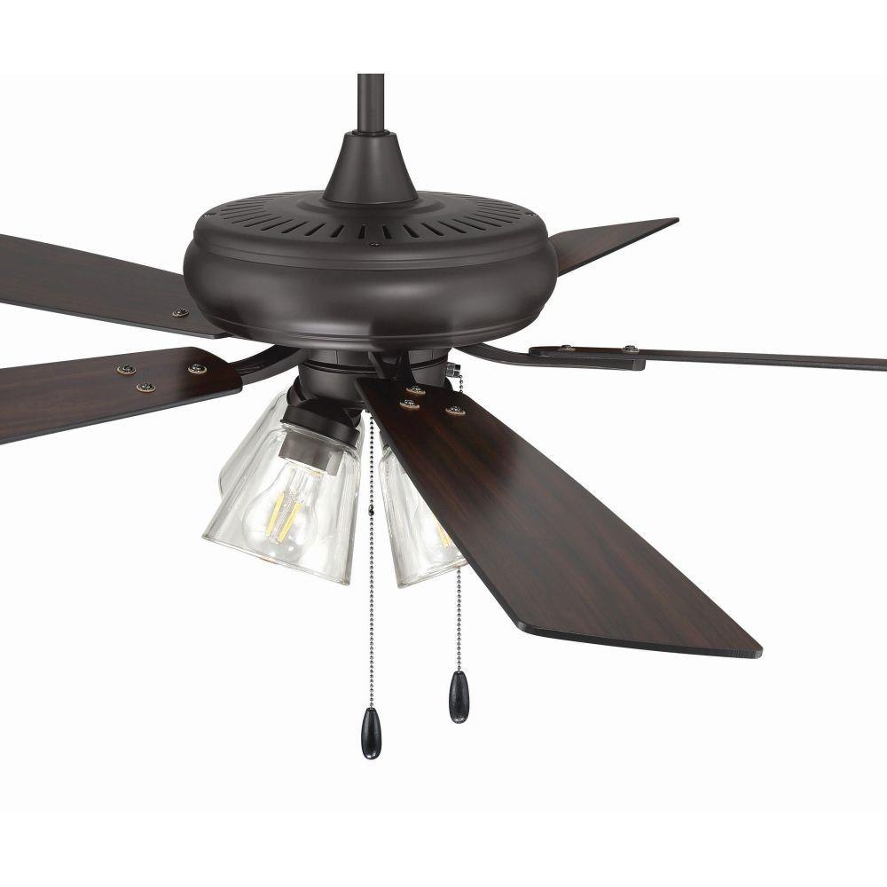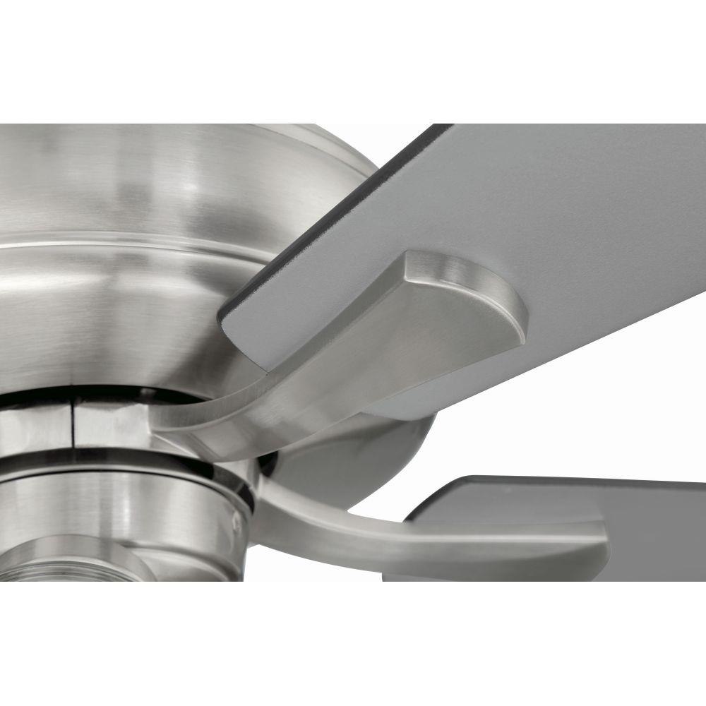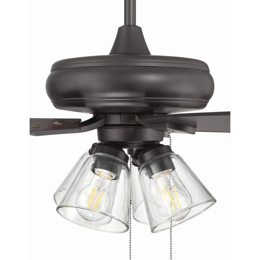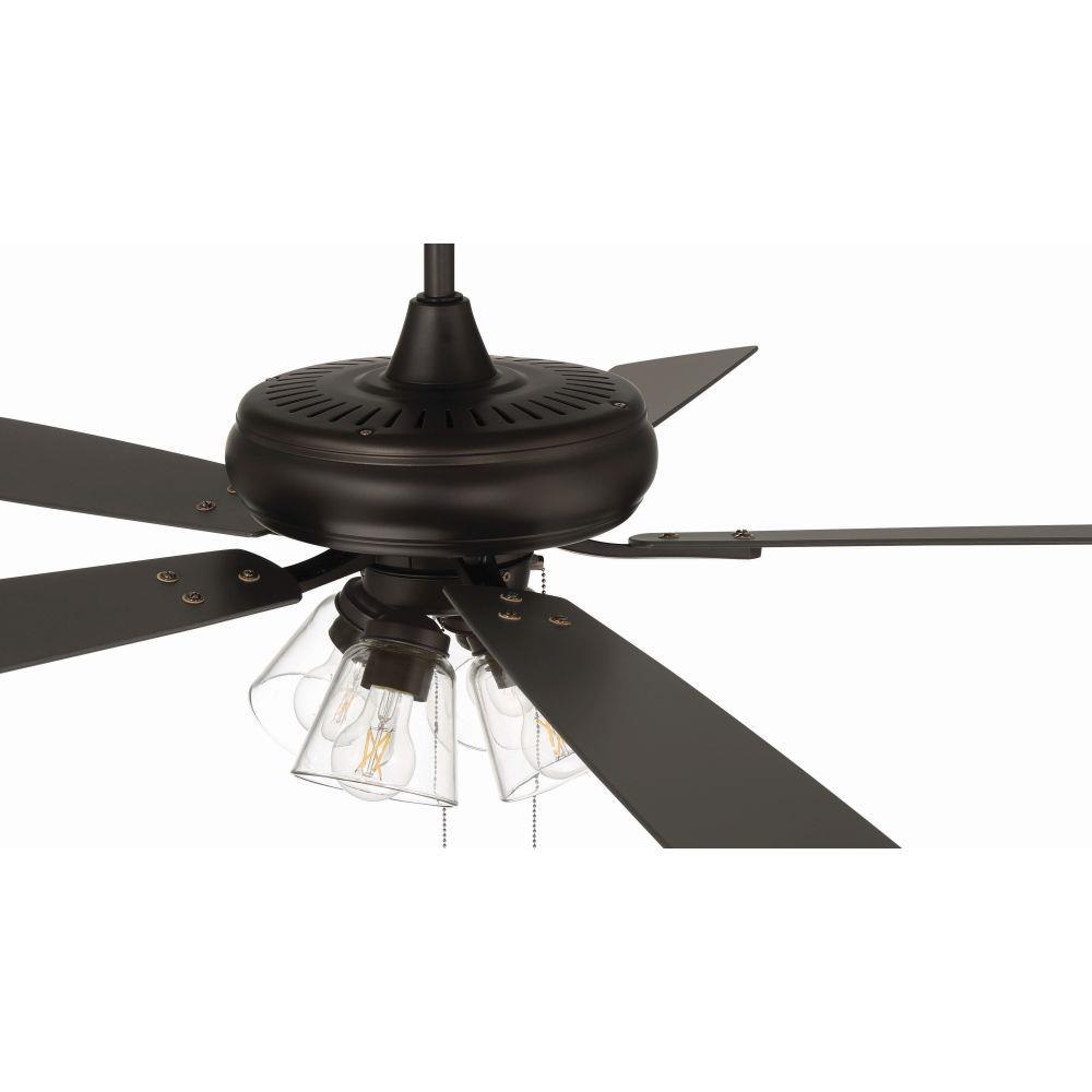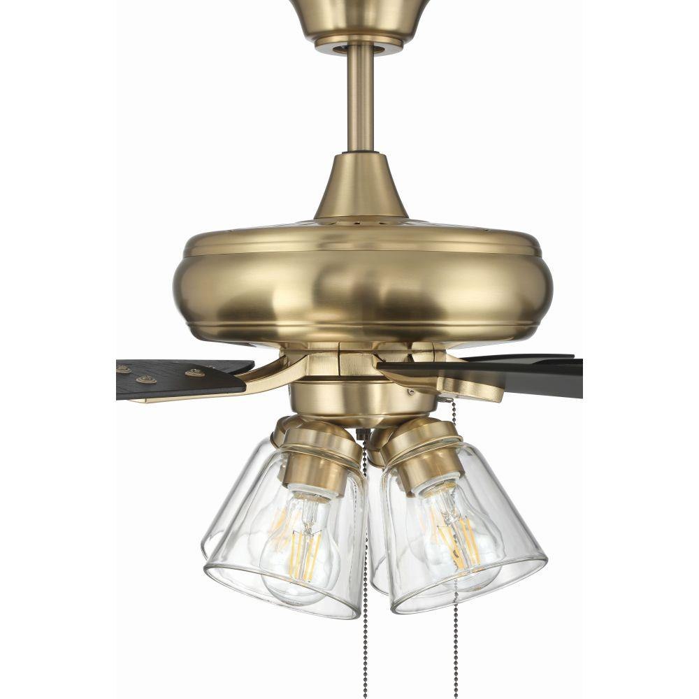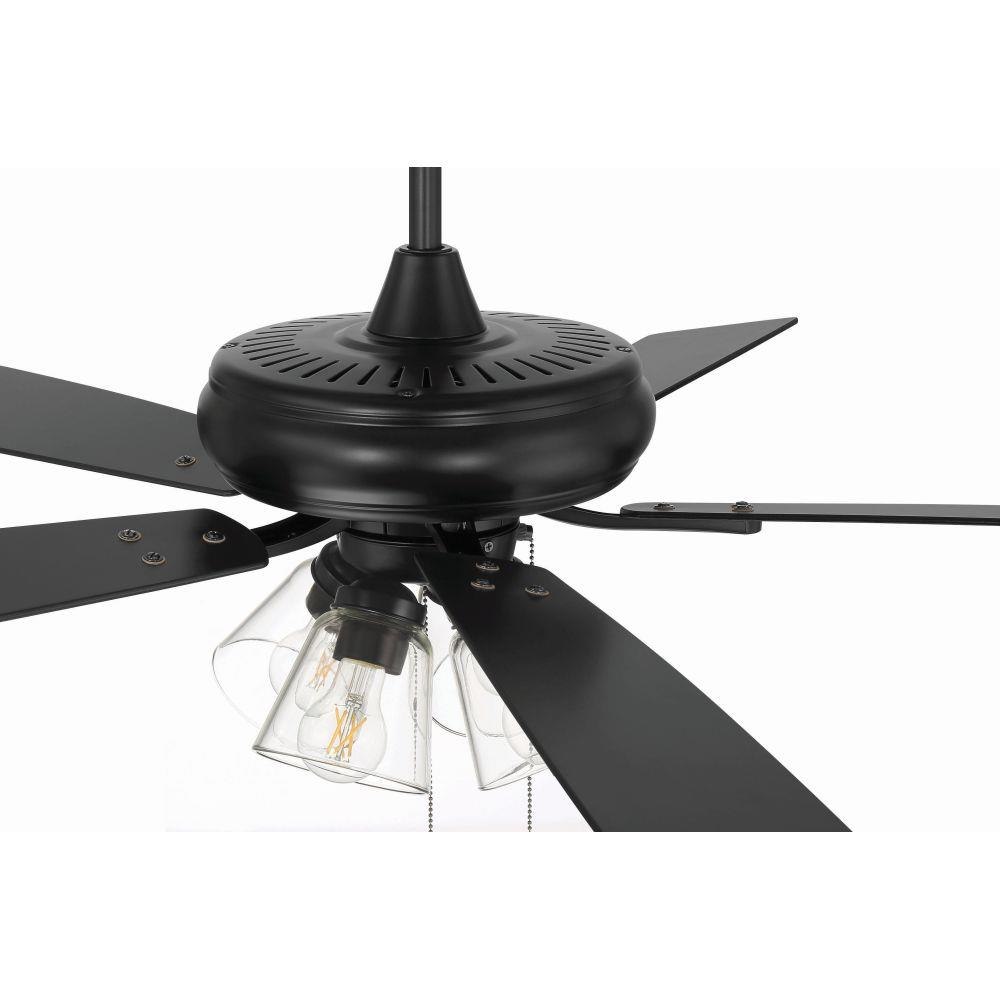 The Craftmade Eos 52" ceiling fan with clear glass four-light kit including dimmable LED bulbs features a smooth, 3-speed, reversible motor, updated blade arms, and reversible custom 52" blades. Optional remote controls are available (Sold Separately).