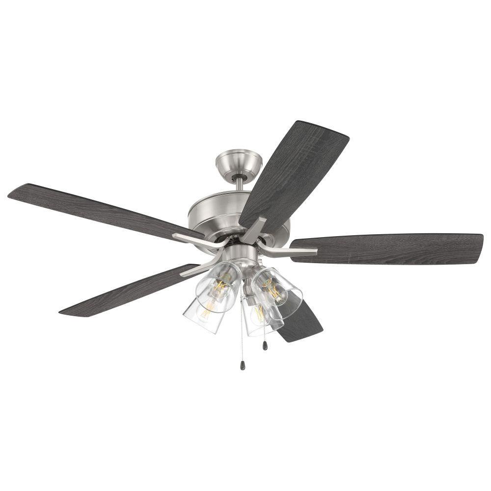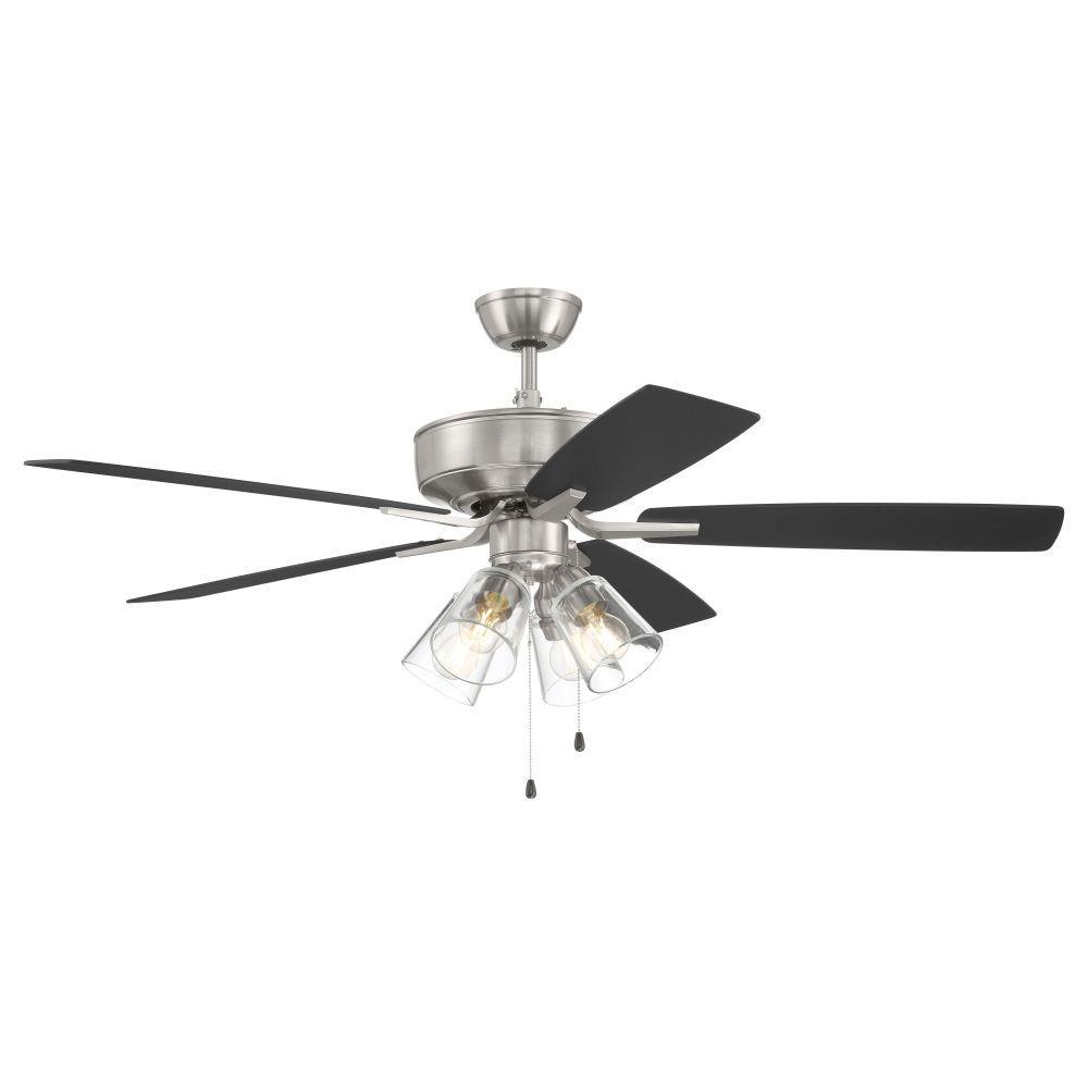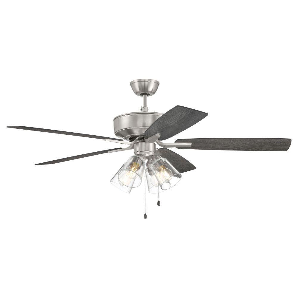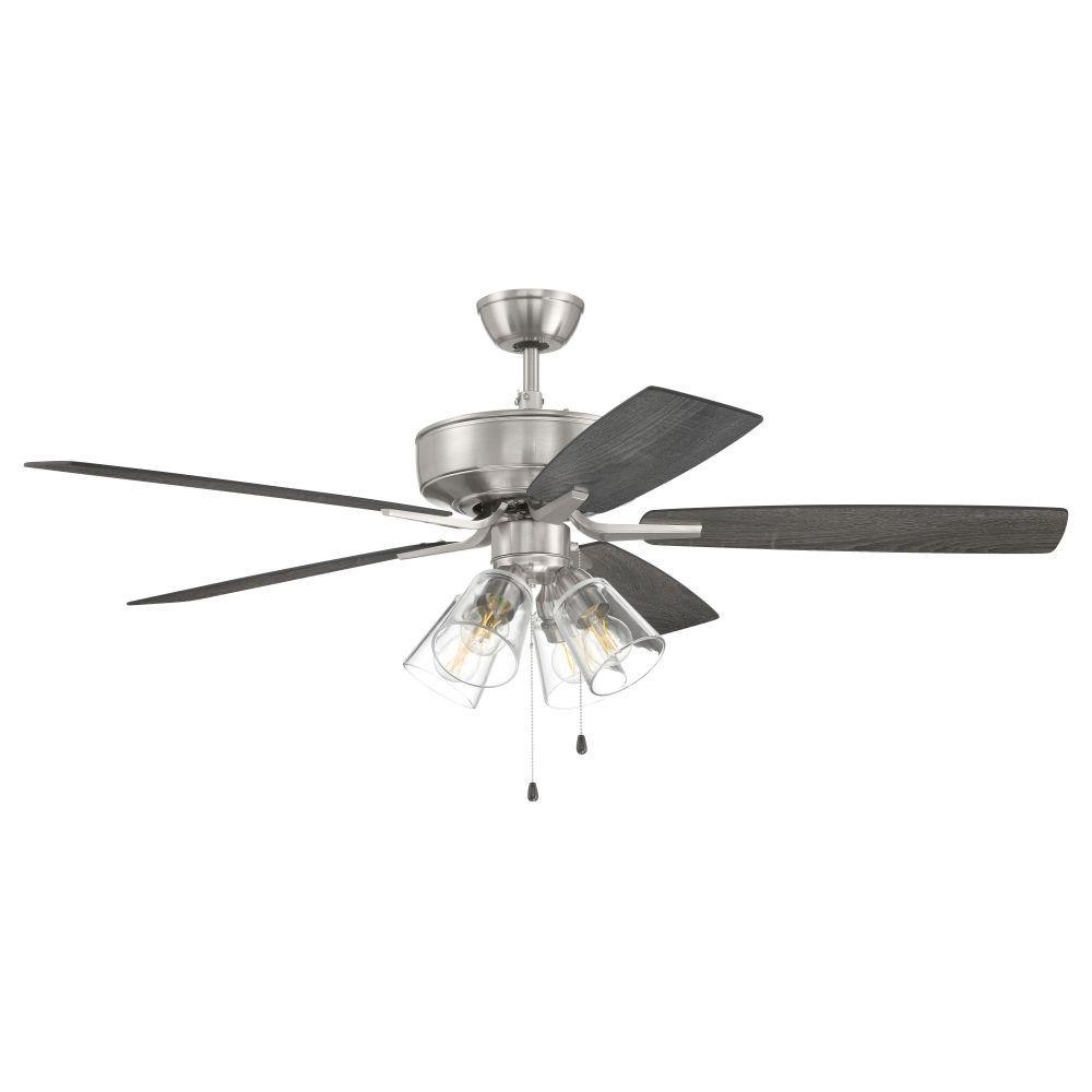 The ideal combination of excellent performance, exceptional value and timeless style, the Craftmade Pro Plus 52" ceiling fan with clear glass four light with dimmable LED bulbs included featuring a clean motor, updated straight blade arms and canopy is built for performance. The dual mount, 3-speed, reversible fan includes custom 52" reversible blades.