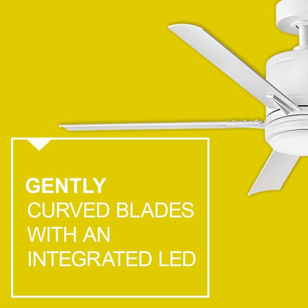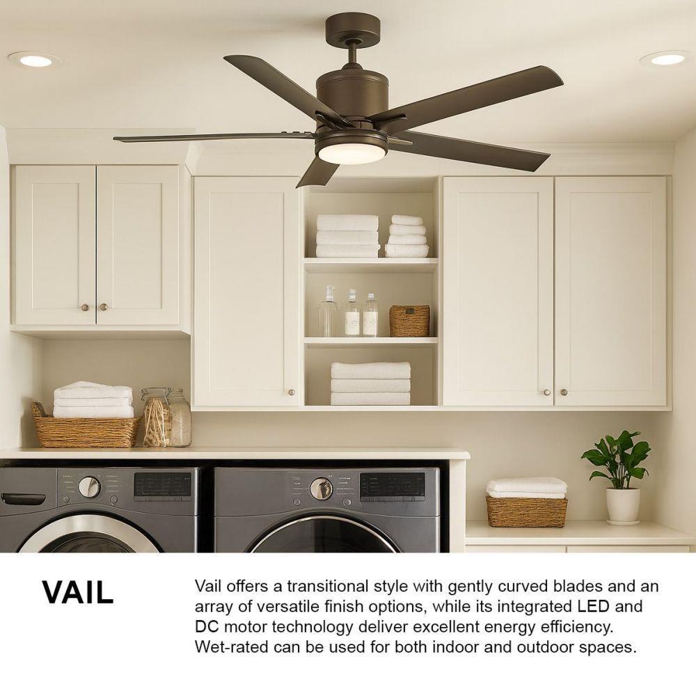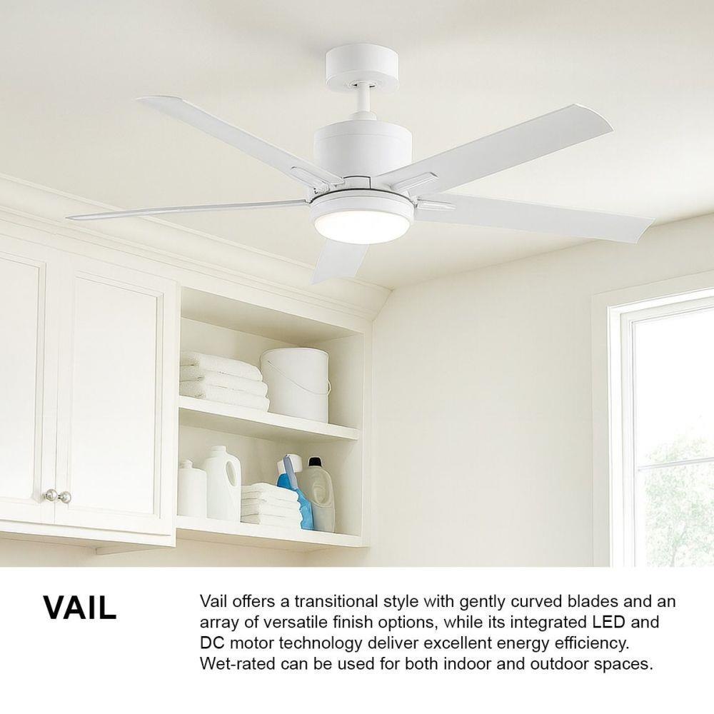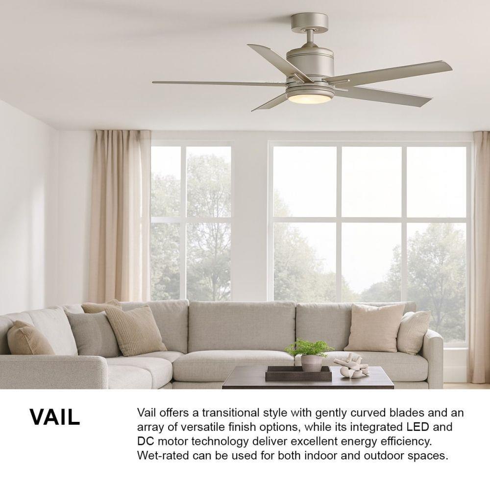 Vail offers a transitional style with gently curved blades and an array of versatile finish options, while its integrated LED and DC motor technology deliver excellent energy efficiency. Wet-rated can be used for both indoor and outdoor spaces.
