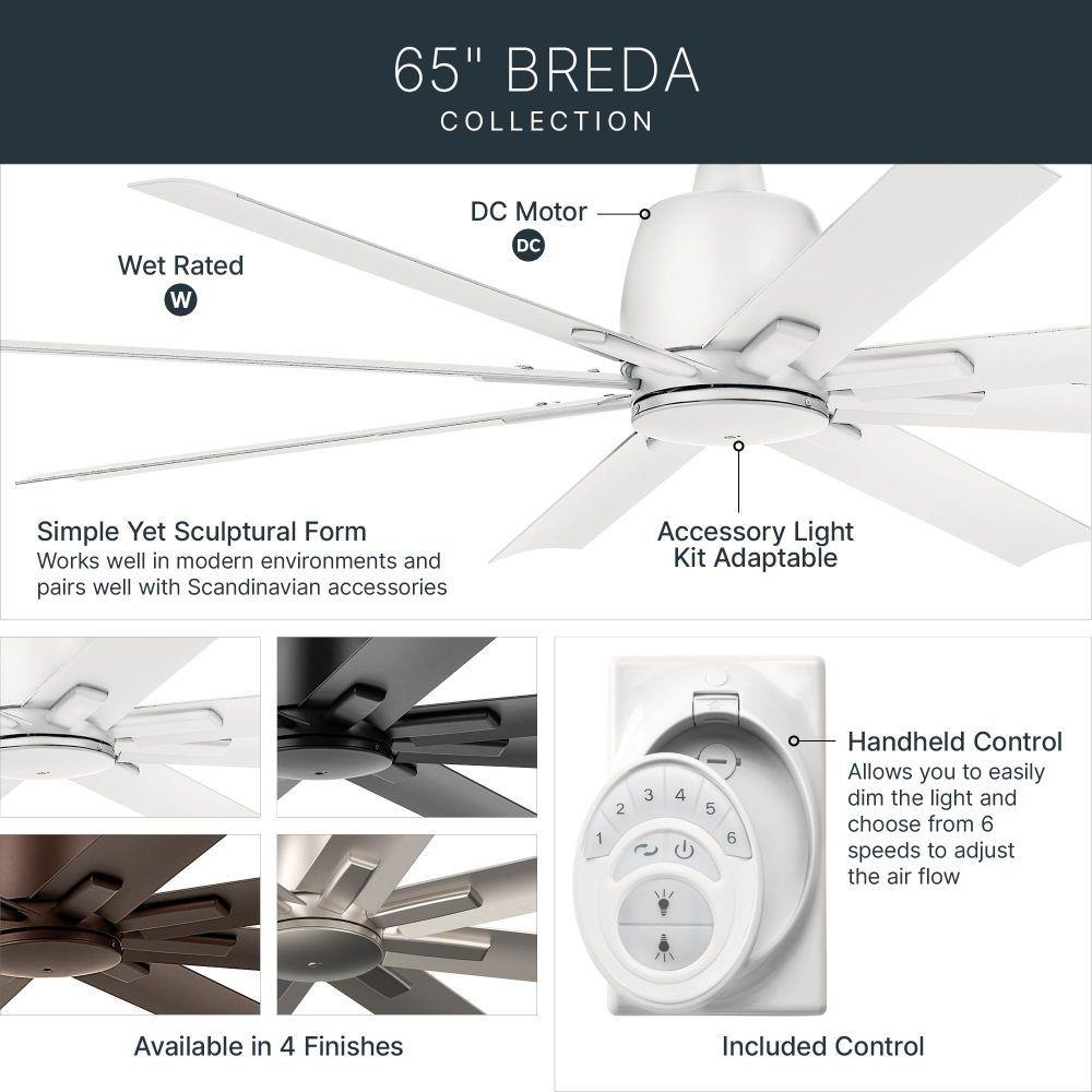 Soft, light curvature and a simple yet sculptural form, easily create a space of ultimate relaxation with the 65-Inch Breda 8 Blade Ceiling Fan. Inspired by the trend of incorporating softness into what are typically seen as harsh, sharp corners, Breda brings an element of tranquility wherever it goes. Its soft corners and curves offer a clean, simple feel that works well in multiple modern style spaces and pairs well with Scandinavian accessories. Its extra-large blade sweep provides total comfort by creating a desirable temperature in a larger spaces while its wet rating makes it a great addition for outdoor kitchens or patios.