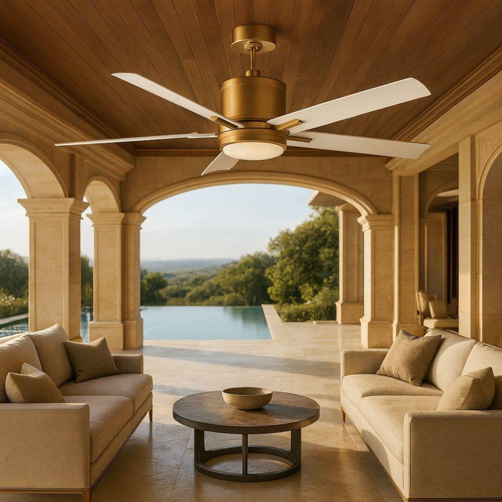 Vail offers a transitional style with gently curved blades and an array of versatile finish options, while its integrated LED and DC motor technology deliver excellent energy efficiency. Wet-rated can be used for both indoor and outdoor spaces.