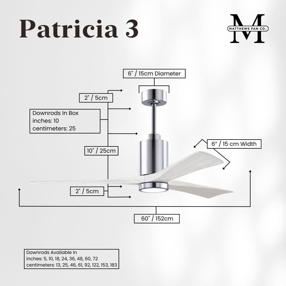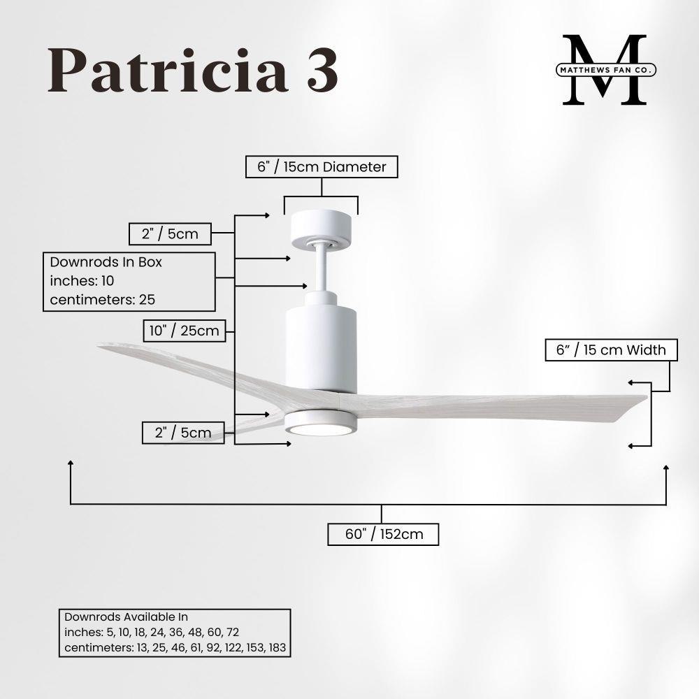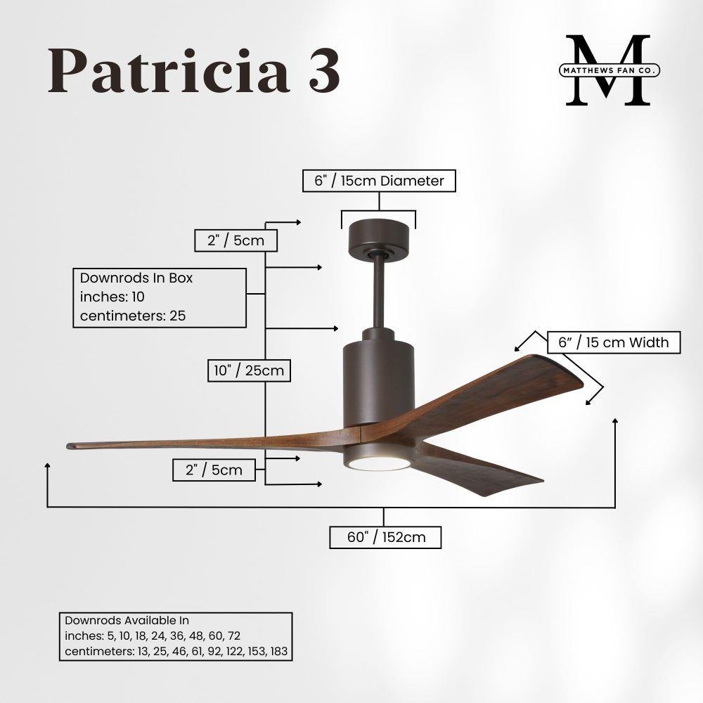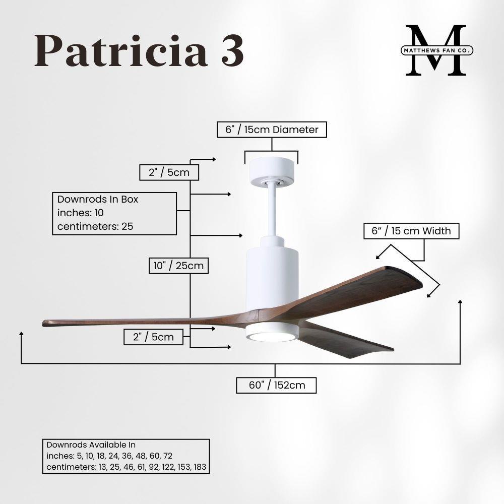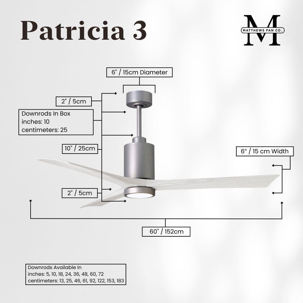 A complement to any commercial or residential space, the Patricia 3 seamlessly combines innovation with simple, refined design. Its elegant aesthetic belies its robust construction. Solid wood blades revolve around a balanced, cylindrical DC motor housing. Air is circulated efficiently with barely more than a whisper. An eco-conscious 5CCT LED color changing light kit completes the package, making Patricia 3 sophisticated, efficient and green.
