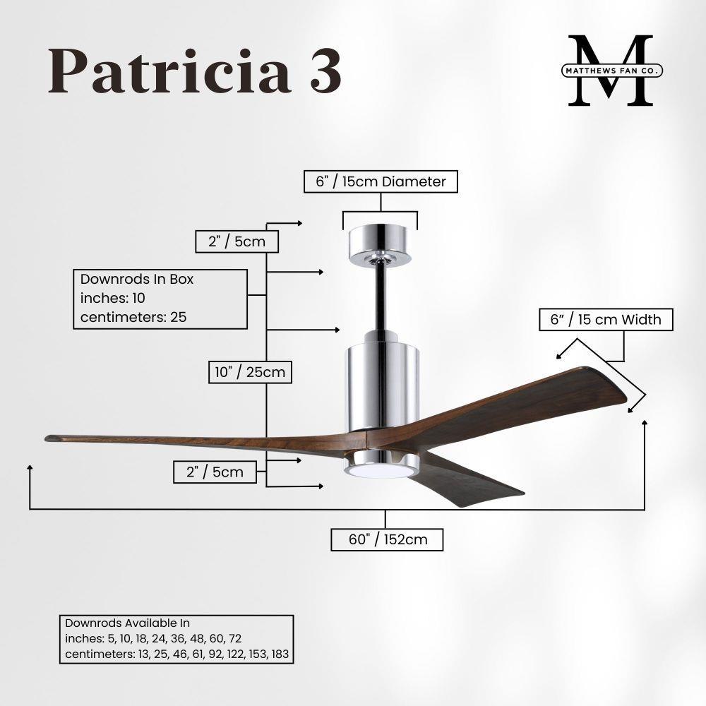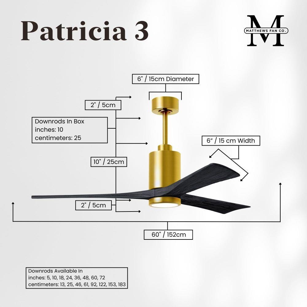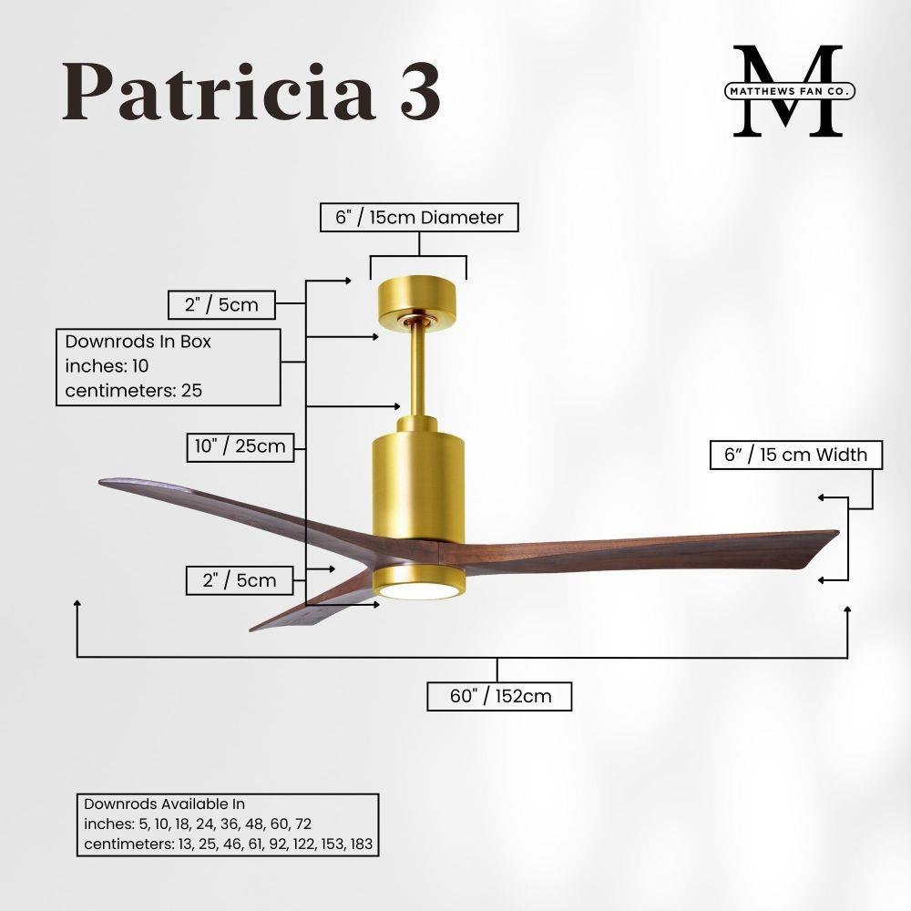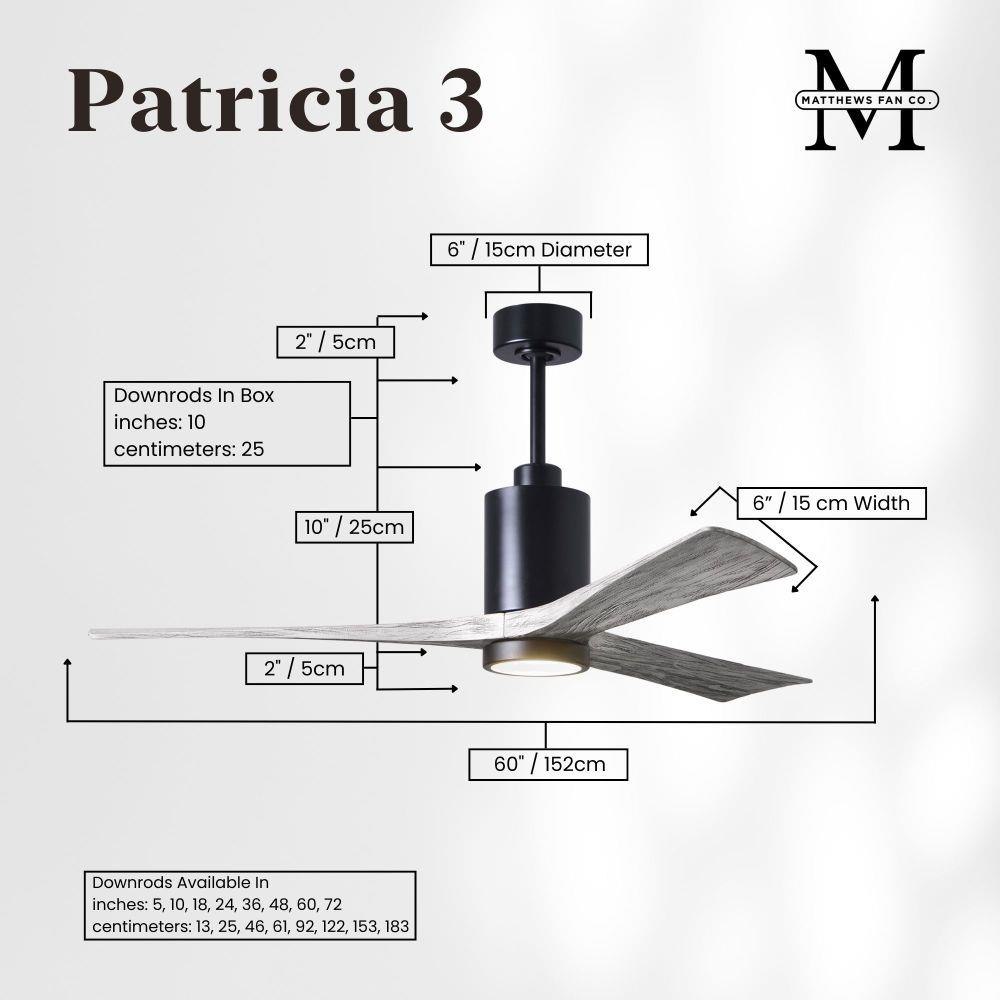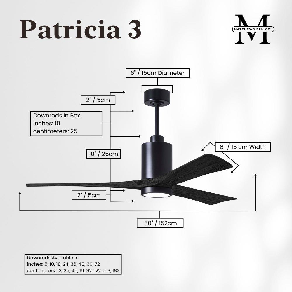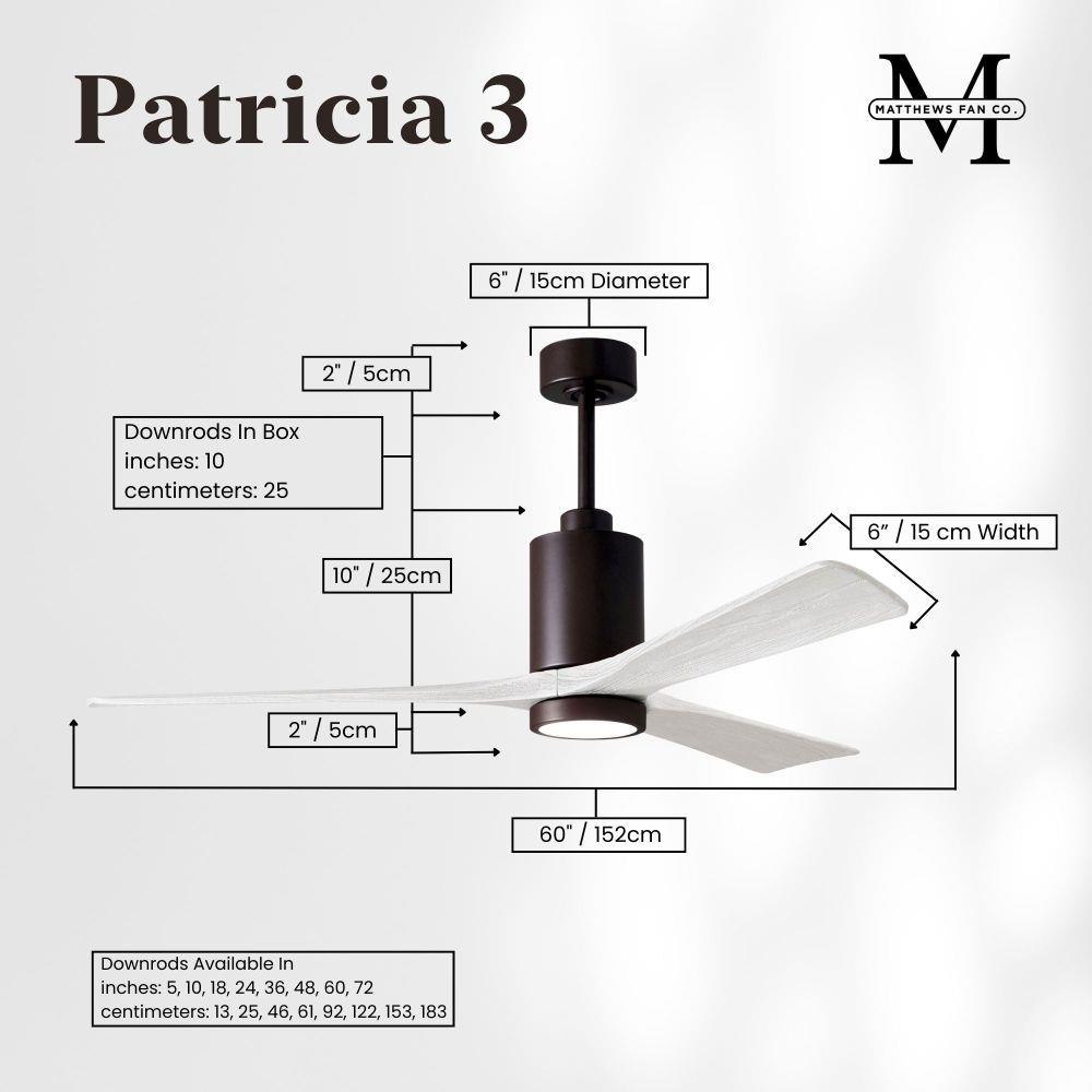 A complement to any commercial or residential space, the Patricia 3 seamlessly combines innovation with simple, refined design. Its elegant aesthetic belies its robust construction. Solid wood blades revolve around a balanced, cylindrical DC motor housing. Air is circulated efficiently with barely more than a whisper. An eco-conscious 5CCT LED color changing light kit completes the package, making Patricia 3 sophisticated, efficient and green.
