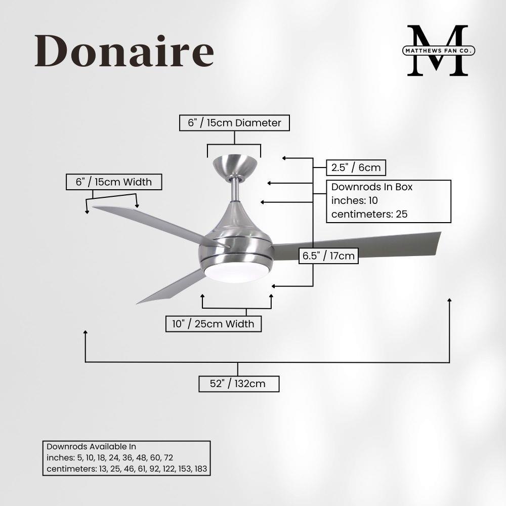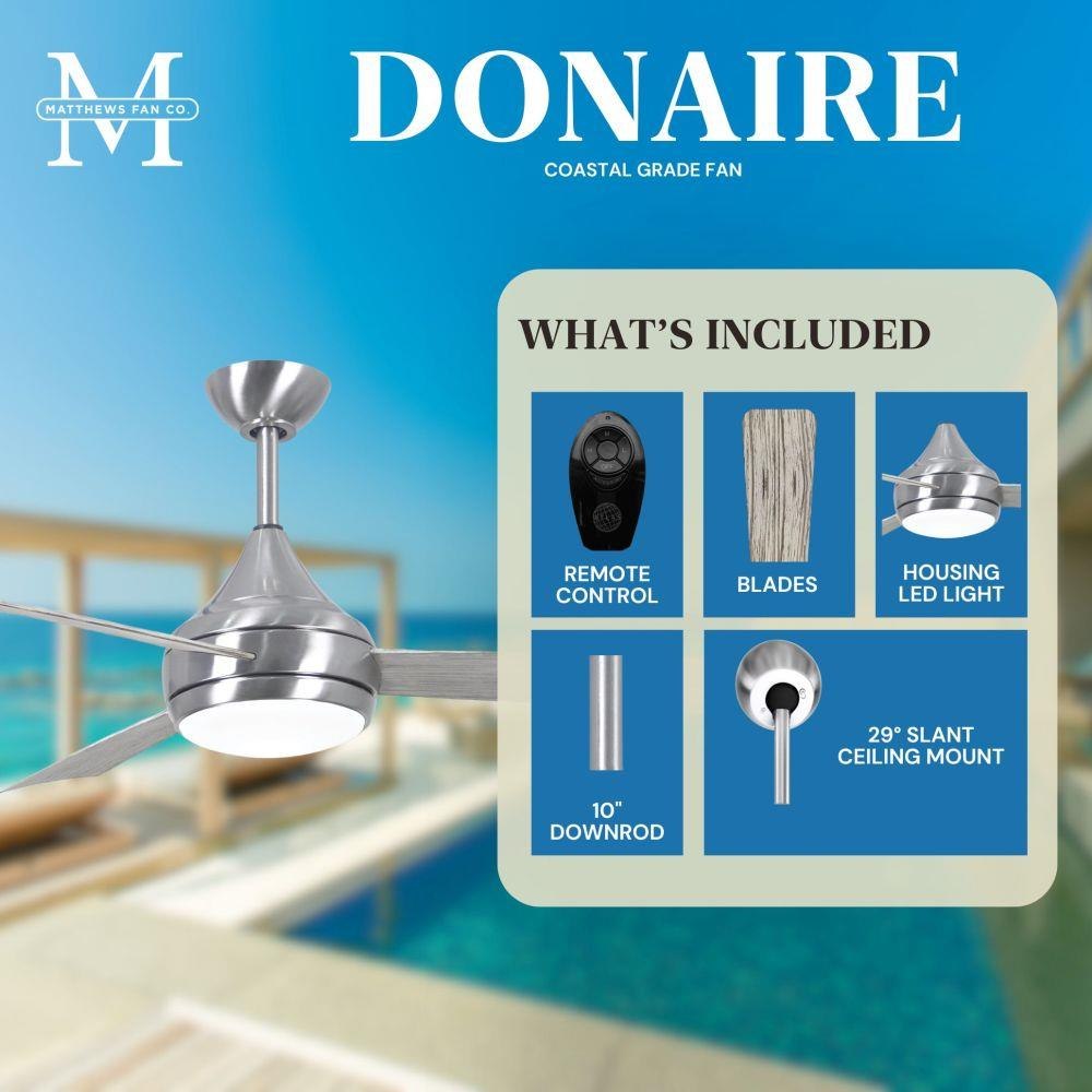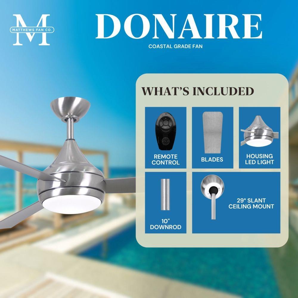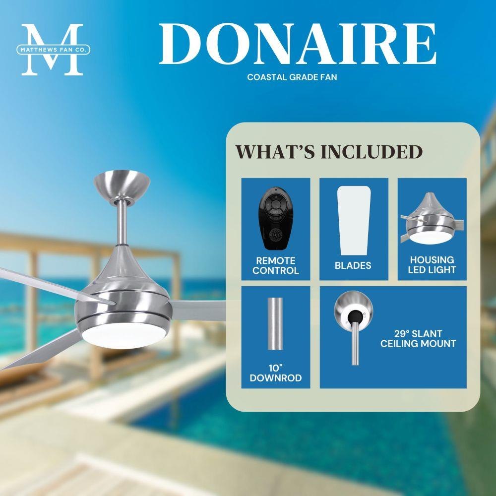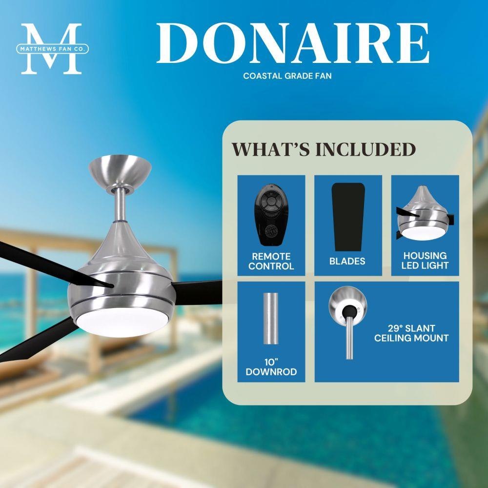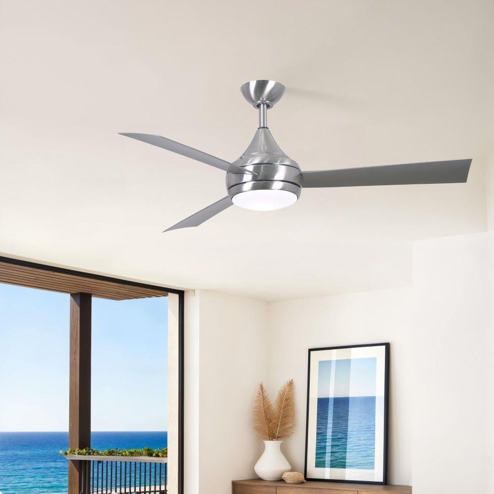 With teardrop motor housing, the 52" Donaire 316 marine grade stainless steel coastal wet location ceiling fan is transitional in design. Donaire is finished in brushed bronze, brushed stainless, matte black or gloss white, equipped with all weather blades and 16W LED dimmable light kit with optional metal cover. Constructed of entirely 316 marine grade stainless steel, the Donaire carries a limited lifetime warranty.