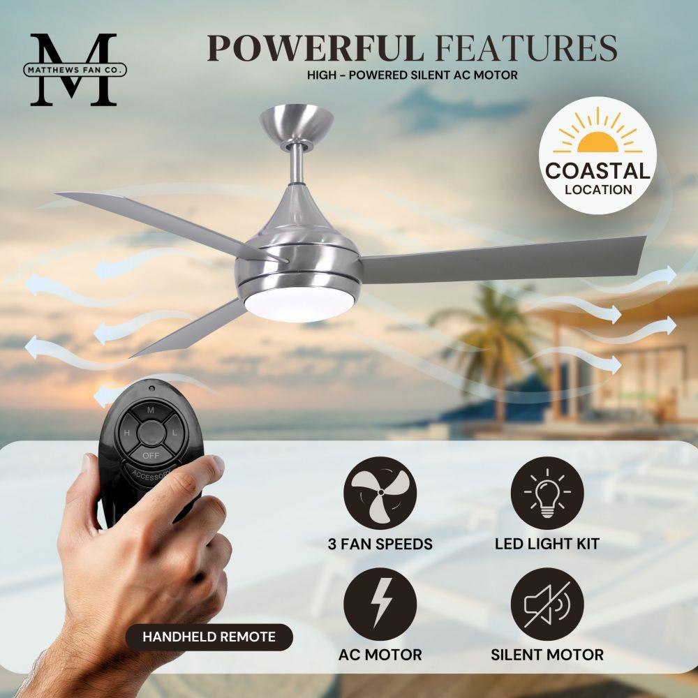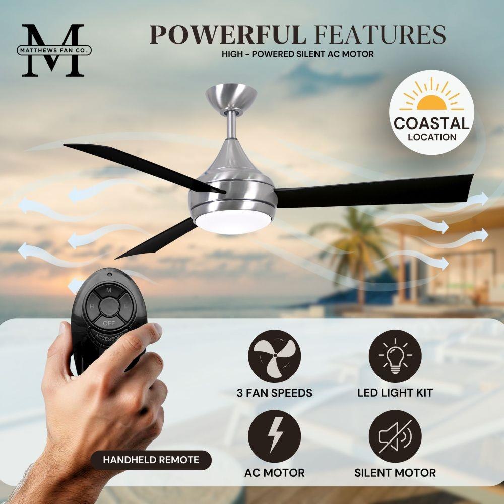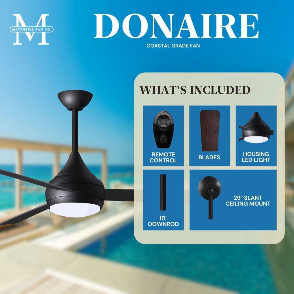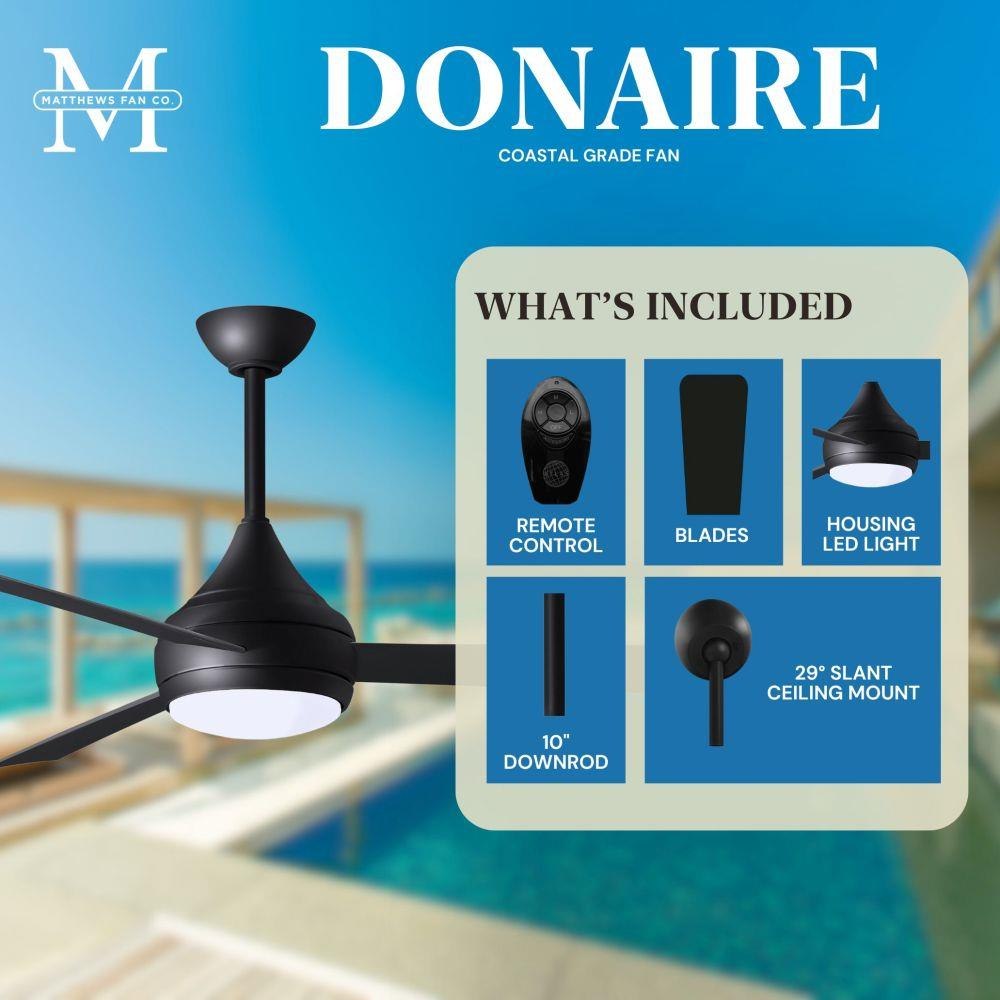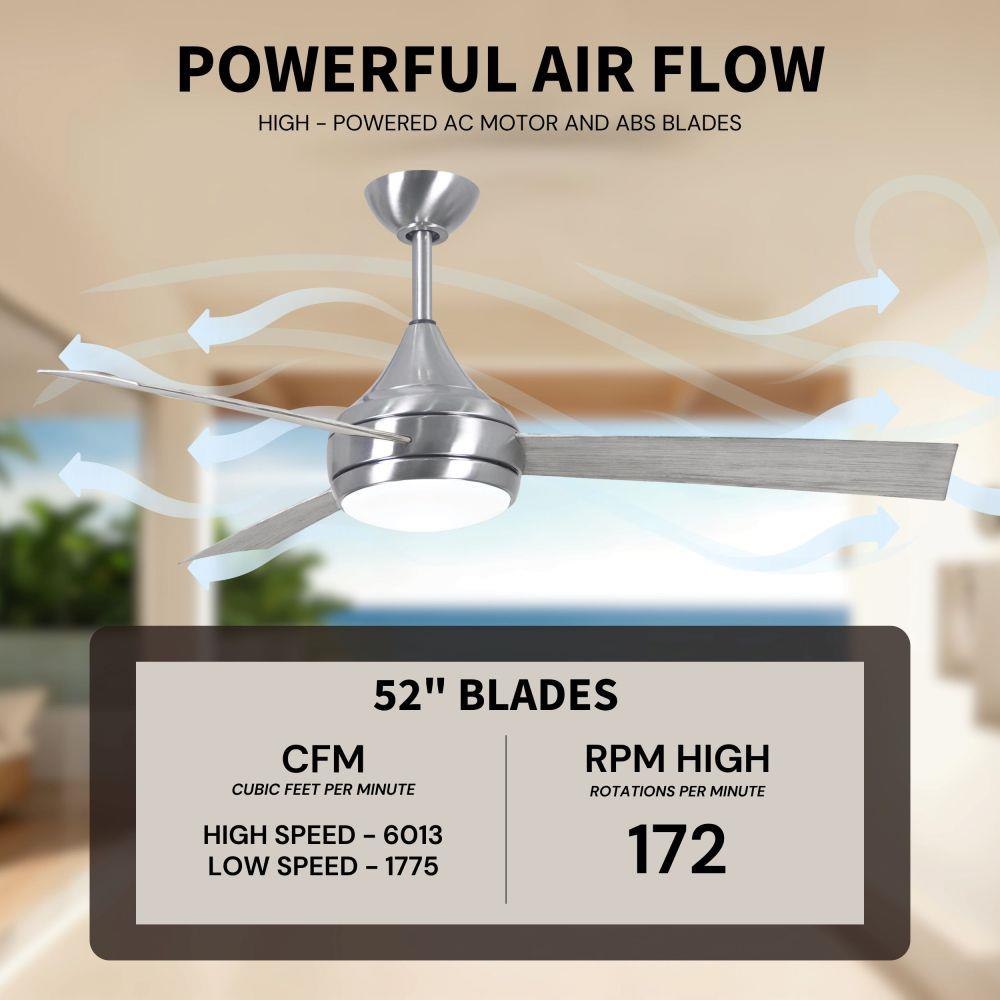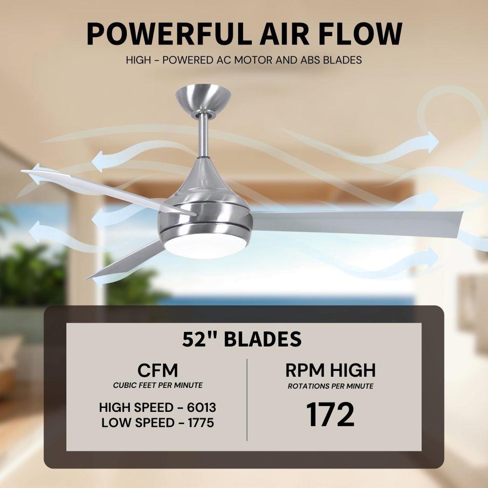 With teardrop motor housing, the 52" Donaire 316 marine grade stainless steel coastal wet location ceiling fan is transitional in design. Donaire is finished in brushed bronze, brushed stainless, matte black or gloss white, equipped with all weather blades and 16W LED dimmable light kit with optional metal cover. Constructed of entirely 316 marine grade stainless steel, the Donaire carries a limited lifetime warranty.
