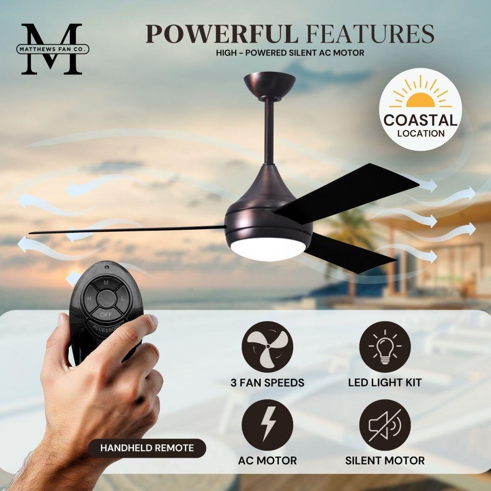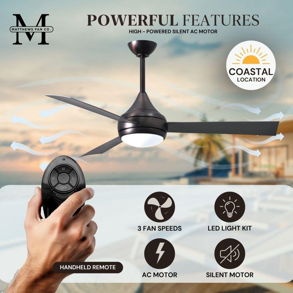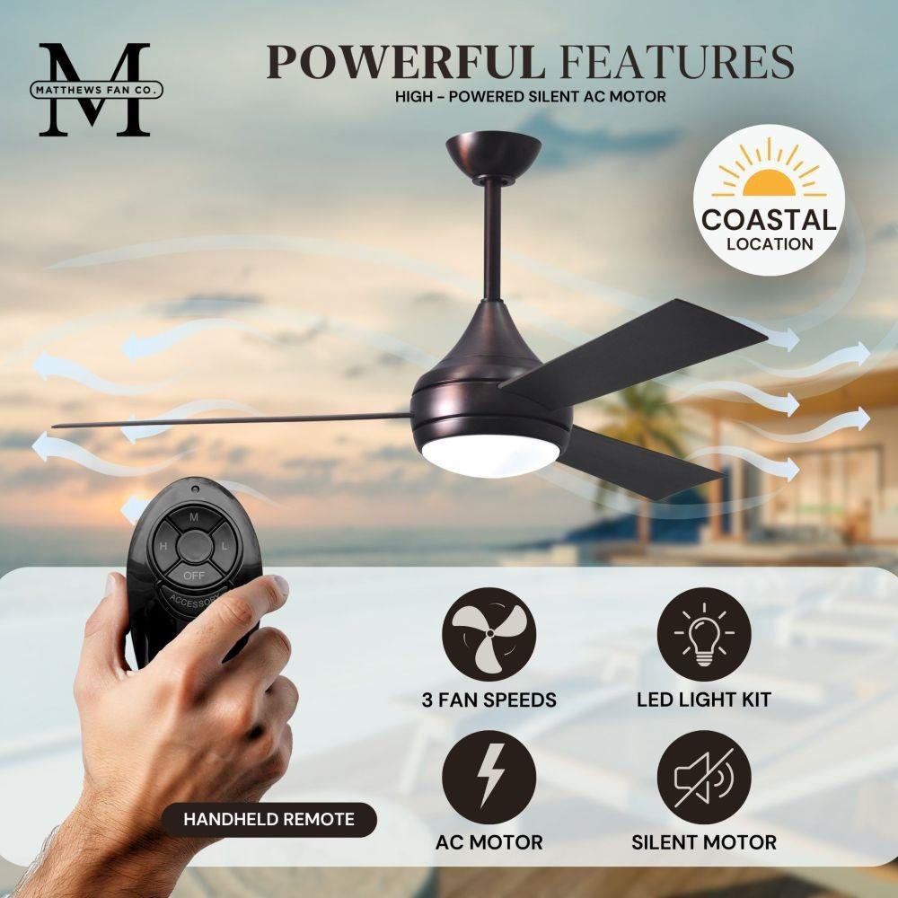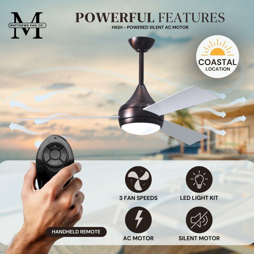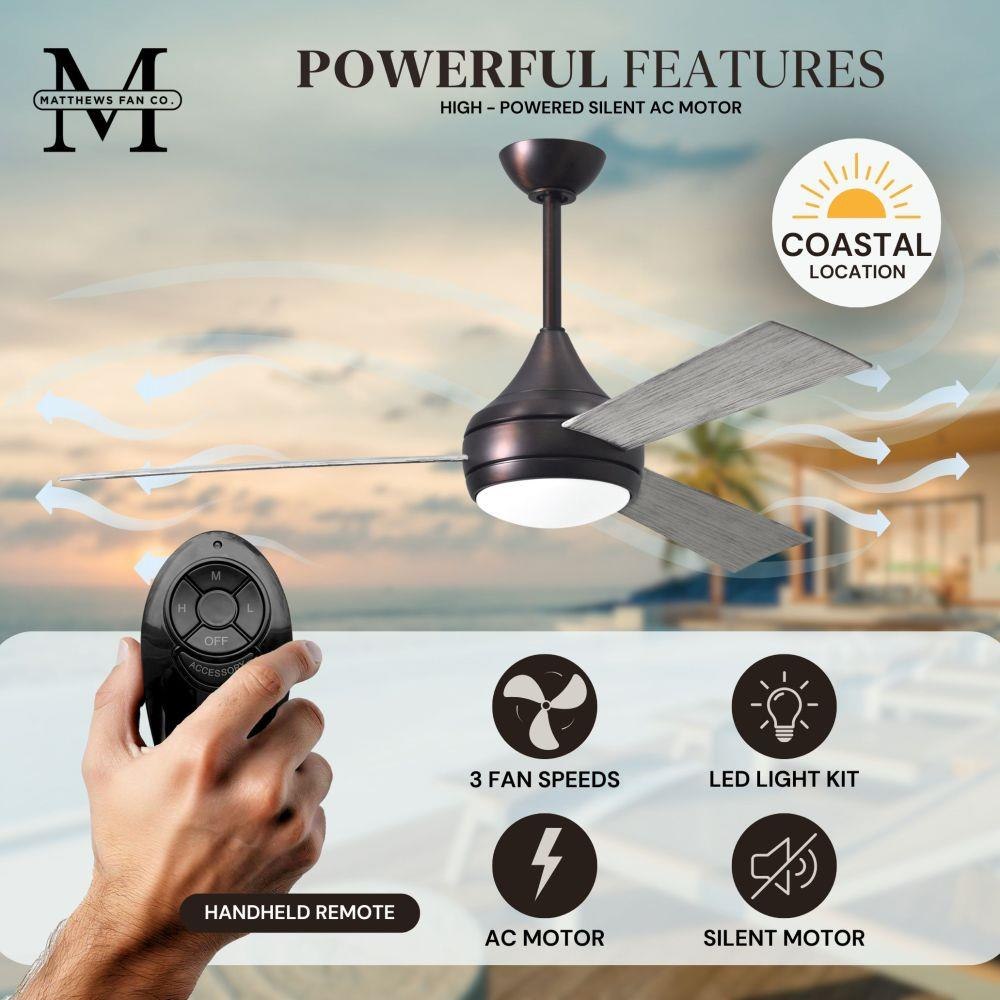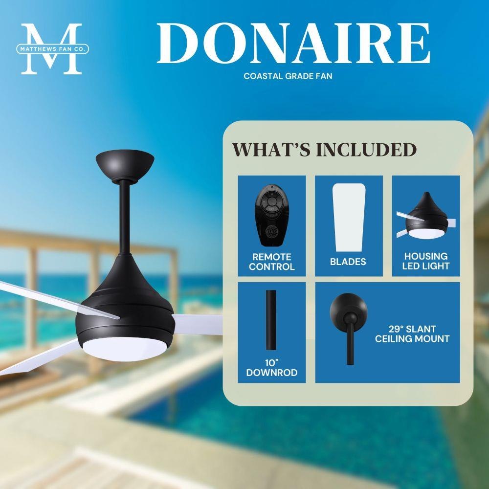 With teardrop motor housing, the 52" Donaire 316 marine grade stainless steel coastal wet location ceiling fan is transitional in design. Donaire is finished in brushed bronze, brushed stainless, matte black or gloss white, equipped with all weather blades and 16W LED dimmable light kit with optional metal cover. Constructed of entirely 316 marine grade stainless steel, the Donaire carries a limited lifetime warranty.