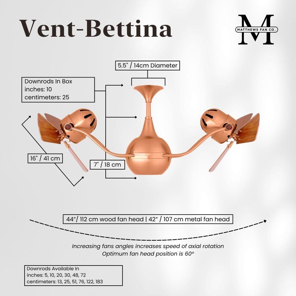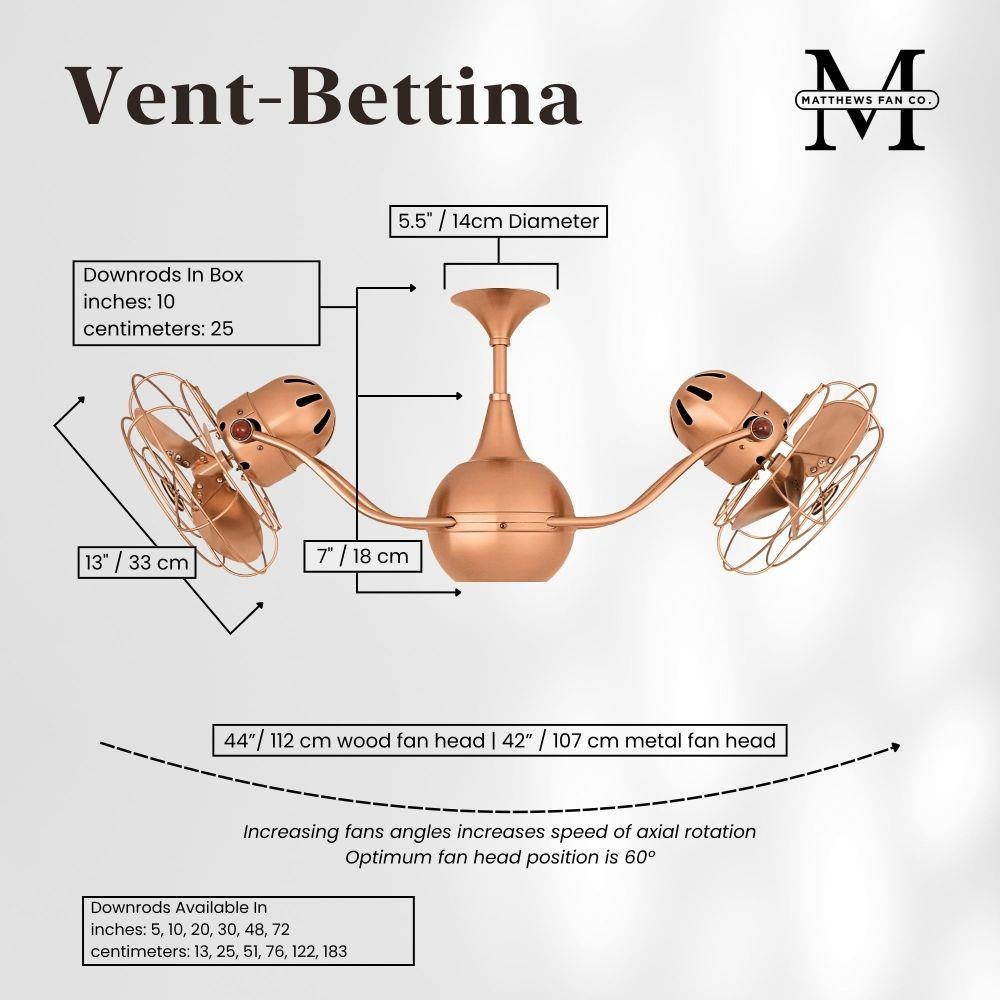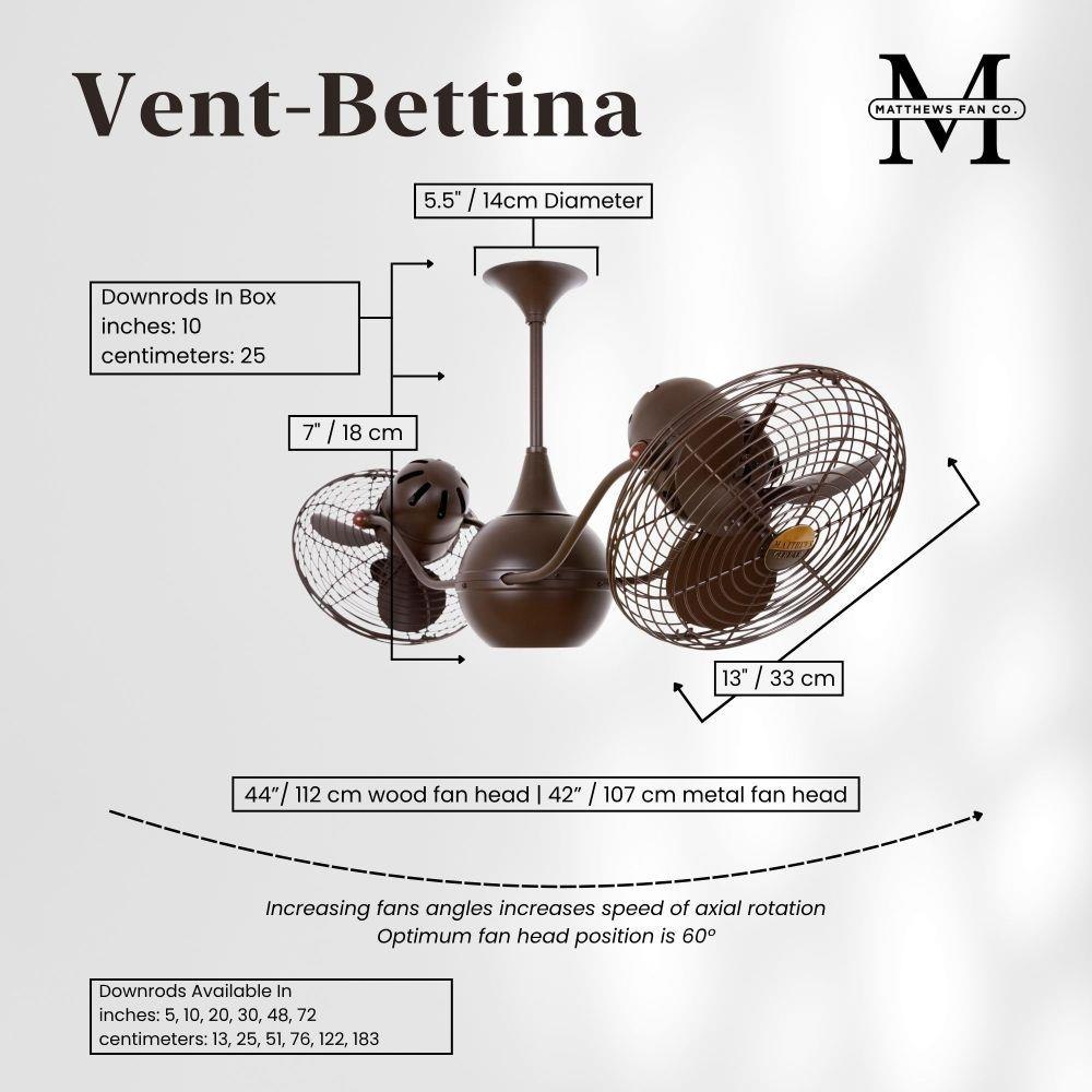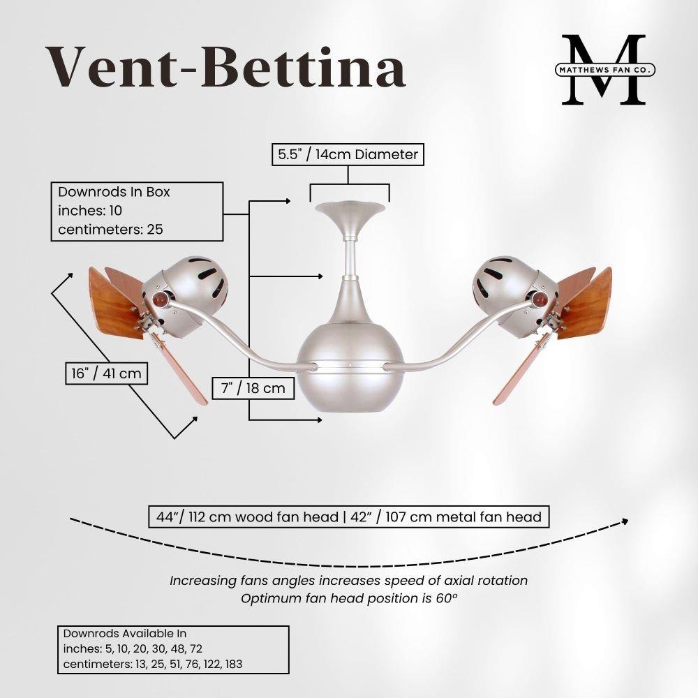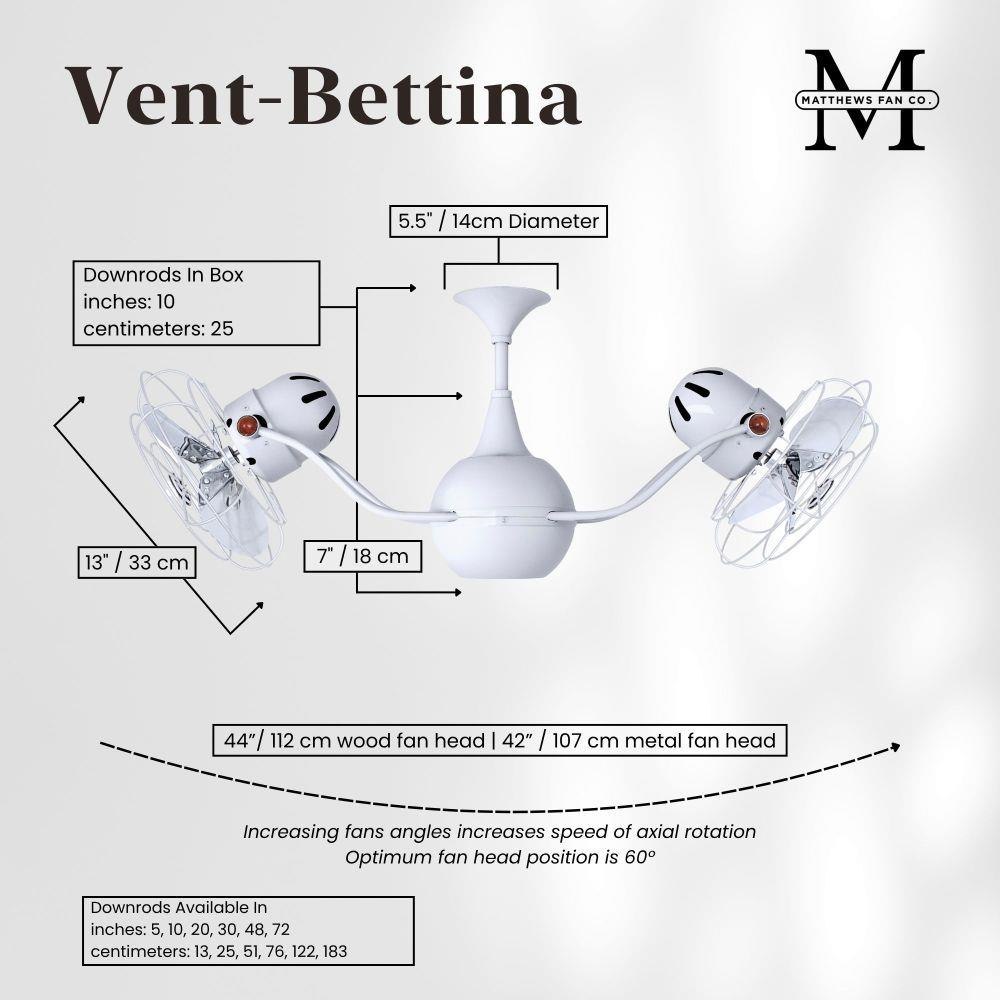 The Vent-Bettina rotational ceiling fan is thoughtfully designed with its arms gently upward curving. The fan offers fluid lines and quiet axial rotation. The fan heads can be infinitely positioned in 180-degree arcs for optimum air movement; the greater the angles of the motors to the horizontal support rods (up or down), the faster the axial rotation. A slow, controlled axial rotation is achieved by both fan head position and fan blade speed.
