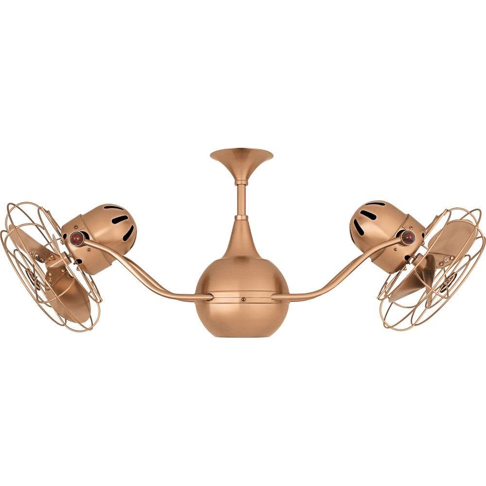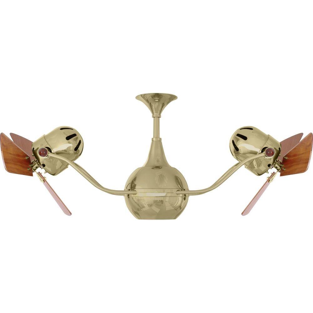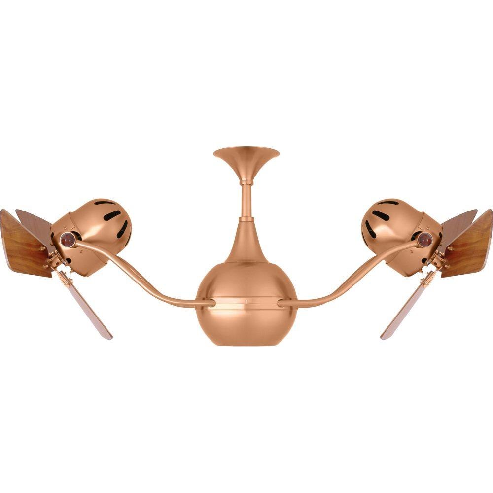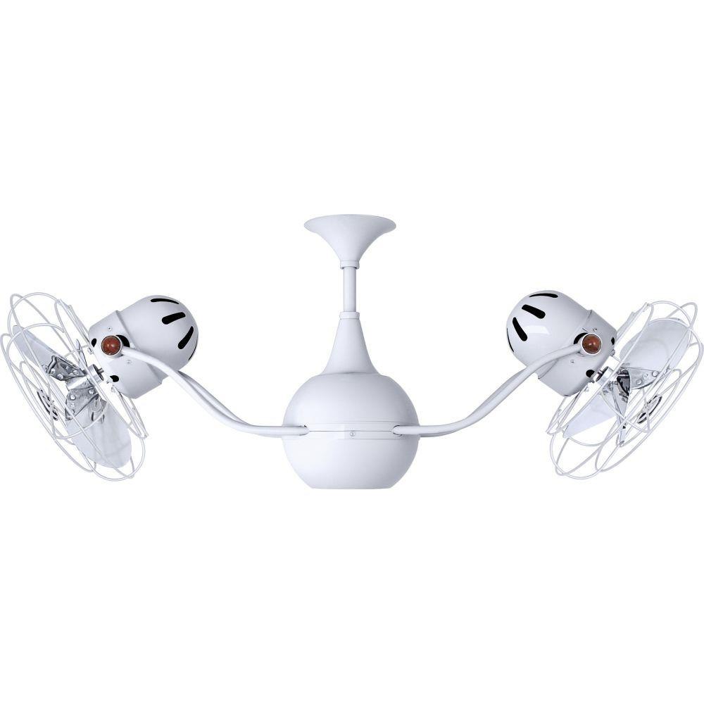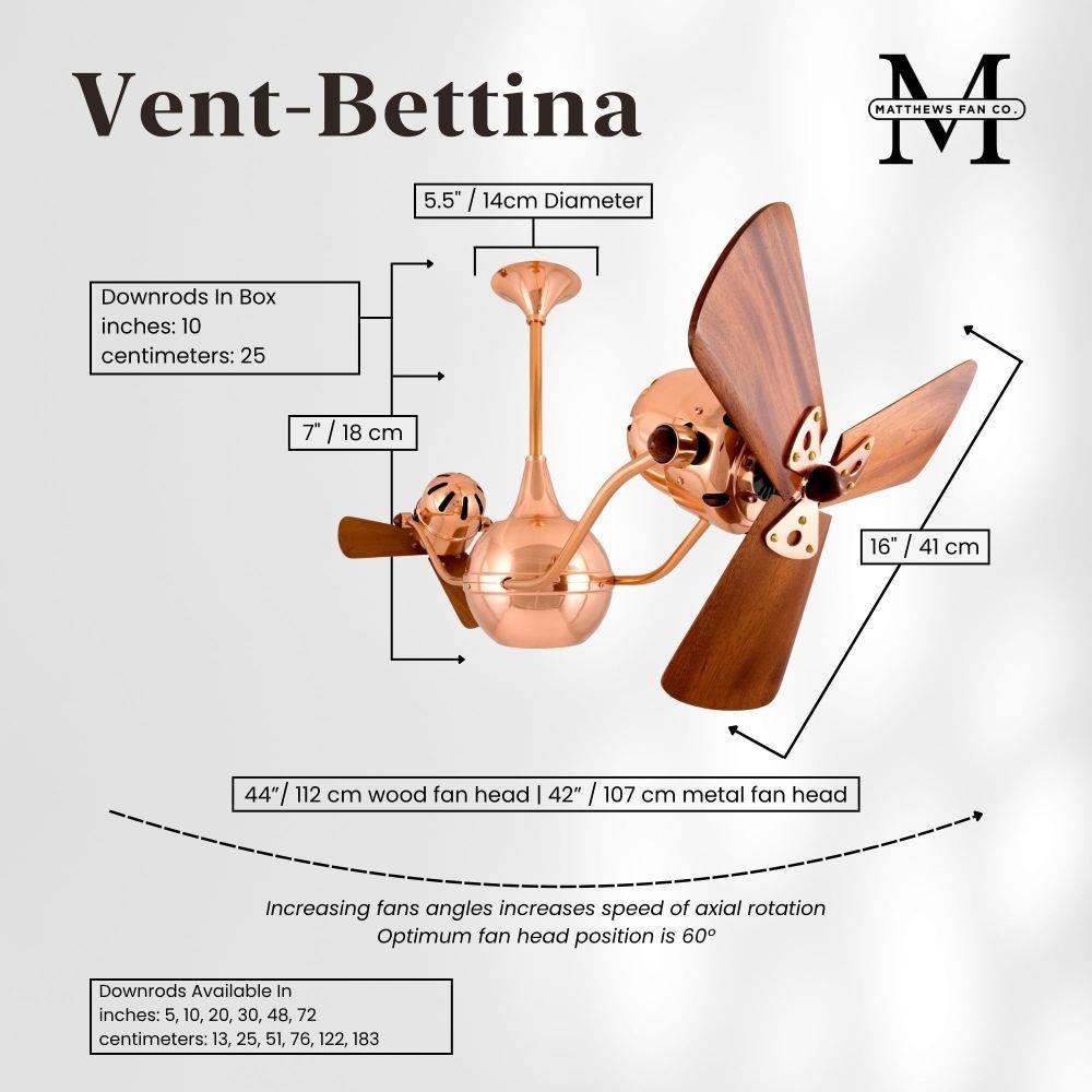 The Vent-Bettina rotational ceiling fan is thoughtfully designed with its arms gently upward curving. The fan offers fluid lines and quiet axial rotation. The fan heads can be infinitely positioned in 180-degree arcs for optimum air movement; the greater the angles of the motors to the horizontal support rods (up or down), the faster the axial rotation. A slow, controlled axial rotation is achieved by both fan head position and fan blade speed.