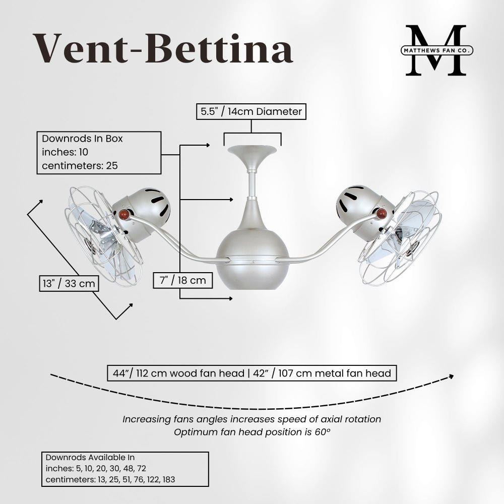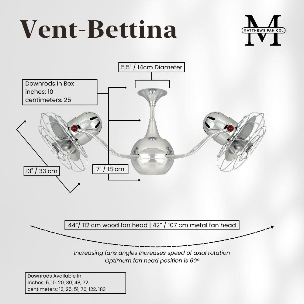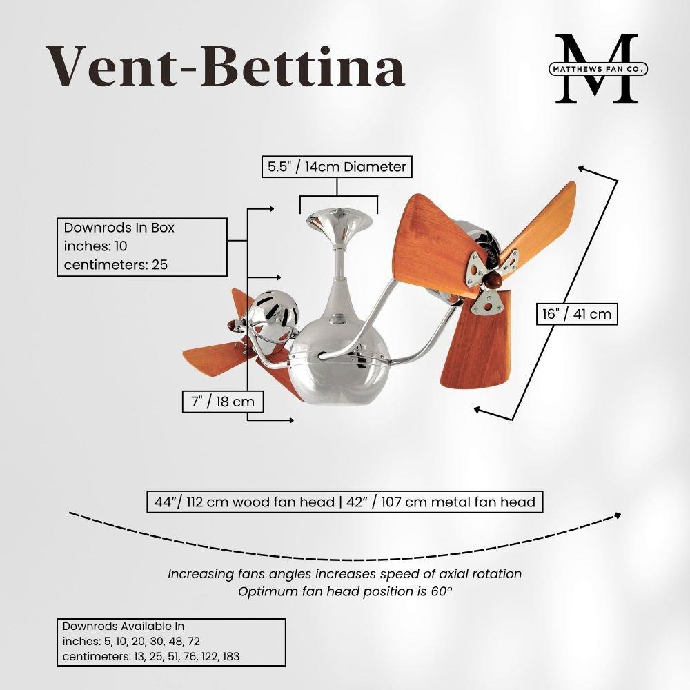 The Vent-Bettina offers multiple blade configurations: metal blades with decorative metal guards, solid ecologically harvested Brazilian mahogany blades without guards, and metal blades with safety cages suitable for low ceiling applications (minimum ceiling height of 7 feet in the US or 8.2 feet in Canada). Safety cages are available to ensure compliance with low ceiling requirements. This fan is damp location rated with powder or clear coat finishes, making it suitable for indoor environments with moisture but not recommended for saltwater or oceanfront installations.
