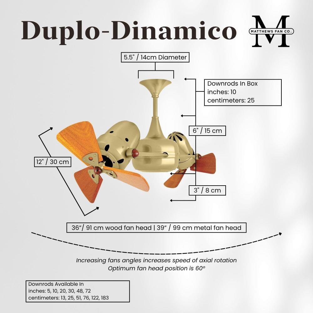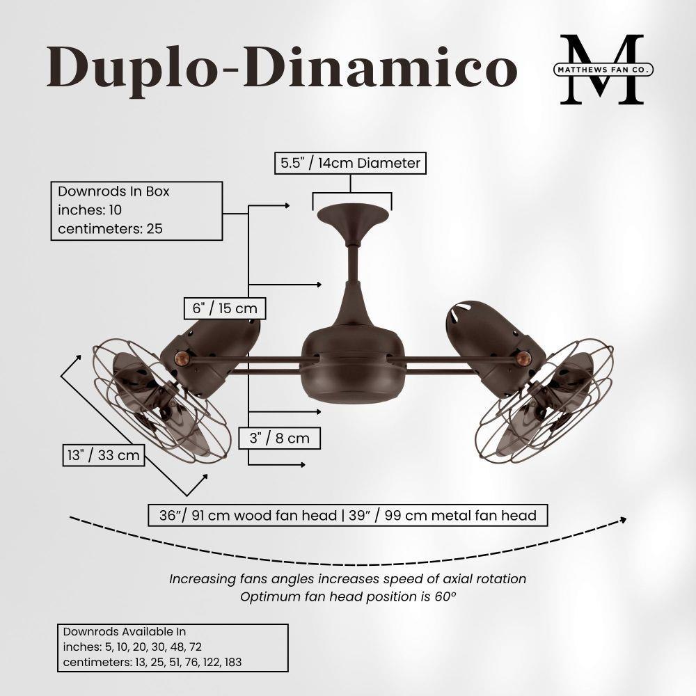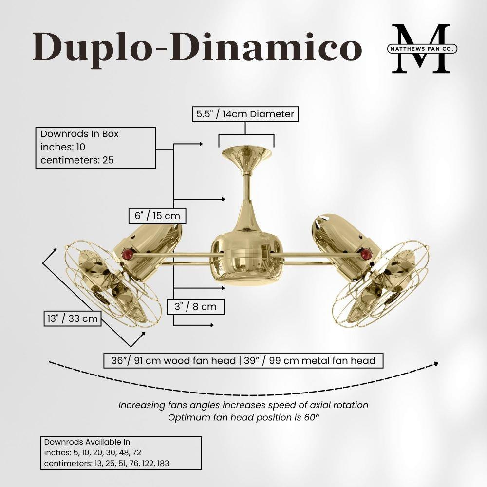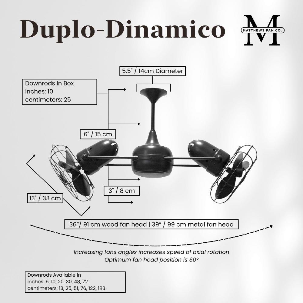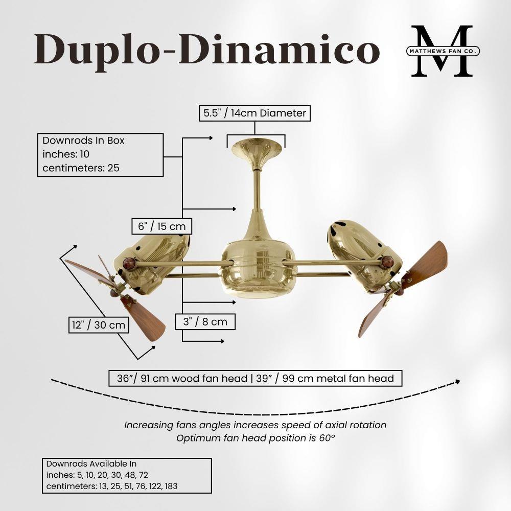 Few designs can match the timeless and sophisticated aesthetic of the Duplo-Dinamico rotational fan. Other manufacturers have tried to reproduce this unique design, though all have proven to be of lesser quality and durability. The fan heads can be infinitely positioned in 180-degree arcs for optimum air movement; the greater the angles of the motors to the horizontal support rods (up or down), the faster the axial rotation. A slow, controlled axial rotation is achieved by both fan head position and fan blade speed.