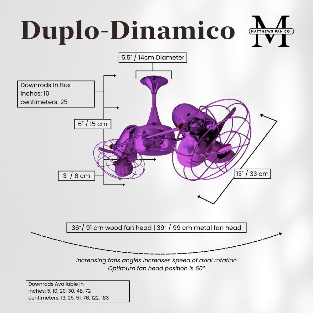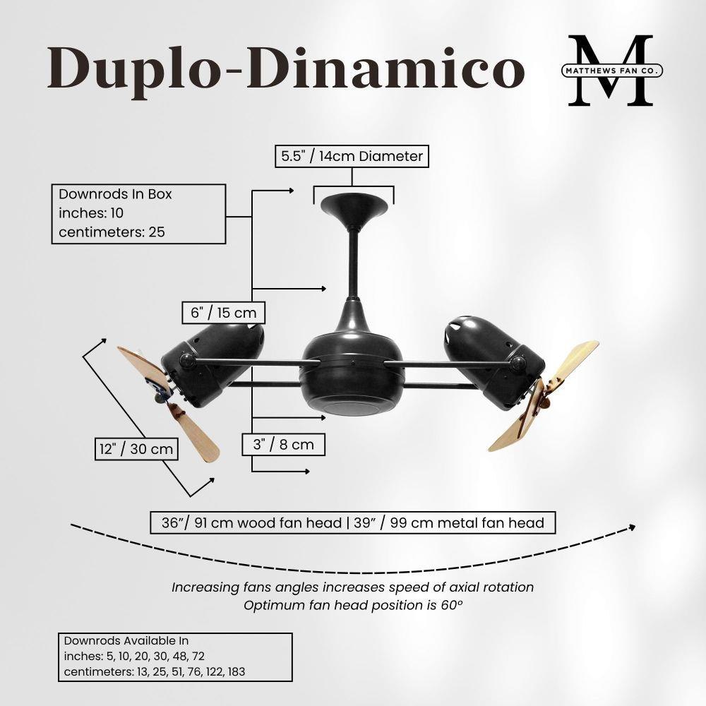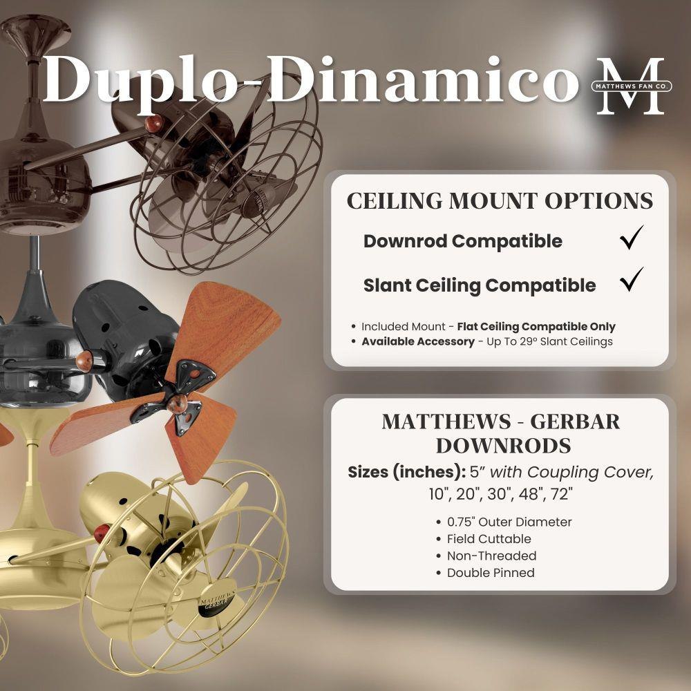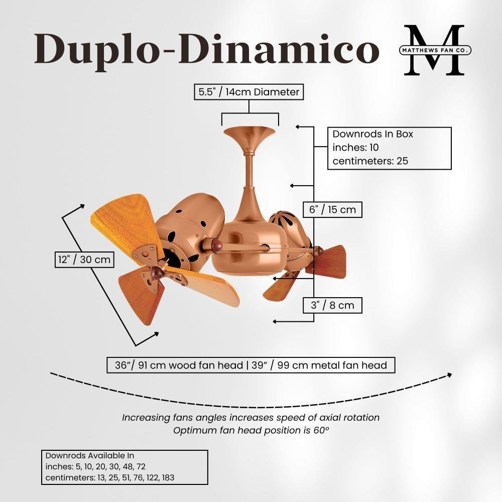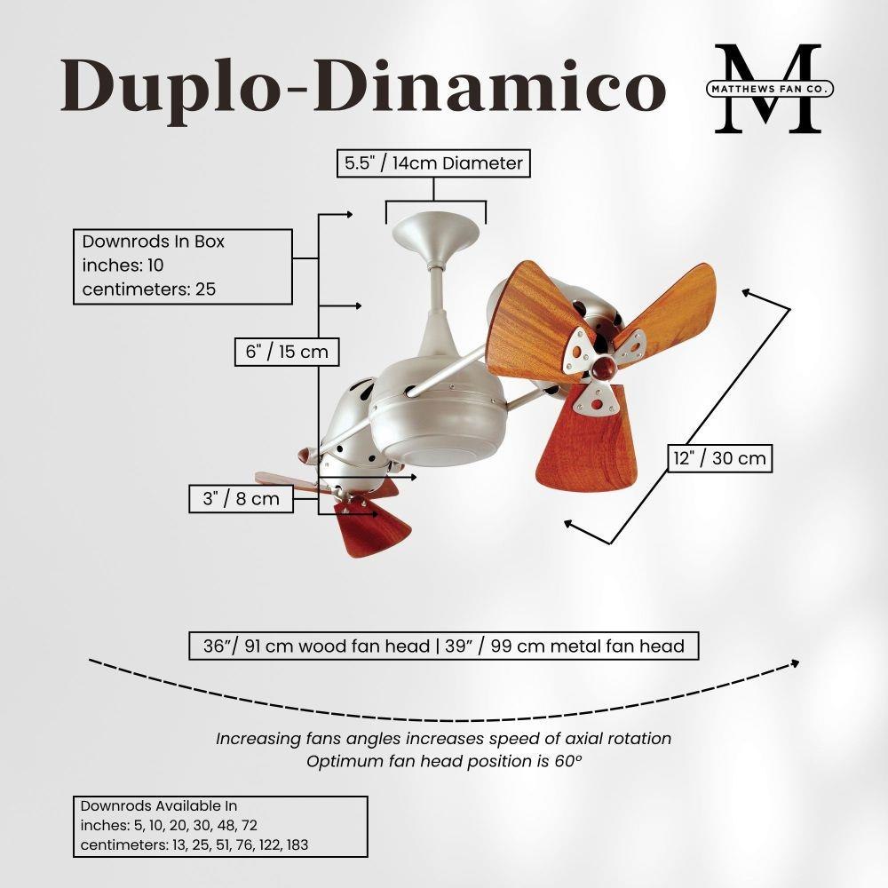 Few designs can match the timeless and sophisticated aesthetic of the Duplo-Dinamico rotational fan. Other manufacturers have tried to reproduce this unique design, though all have proven to be of lesser quality and durability. The fan heads can be infinitely positioned in 180-degree arcs for optimum air movement; the greater the angles of the motors to the horizontal support rods (up or down), the faster the axial rotation. A slow, controlled axial rotation is achieved by both fan head position and fan blade speed.